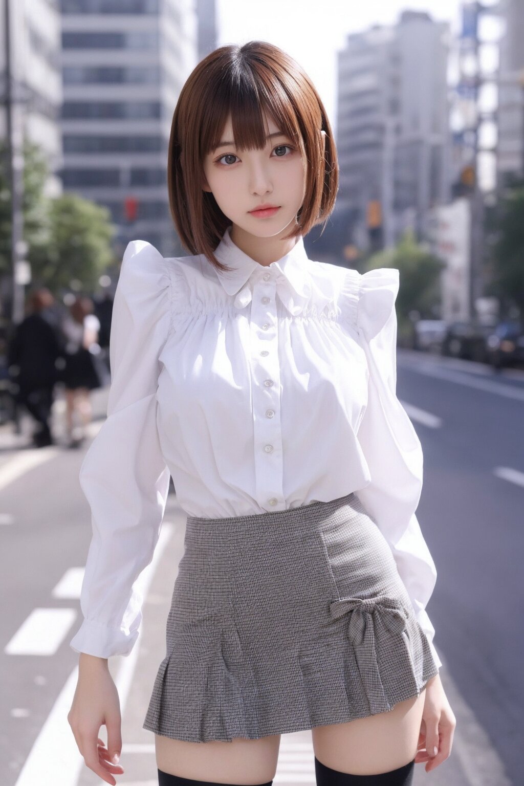 masterpiece, hyper detailed, 16K, RAW photo, realistic, BREAK Japanese woman, 23yo, cute, pretty, hyper detailed face, hyper detailed eye, beautiful eye, extremely detailed, medium hair,hime cut, bangs, thin body, tall body, perfect anatomy, perfect proportions, extremely detailed body, blouse, short tight skirt, knee high socks, BREAK city background,