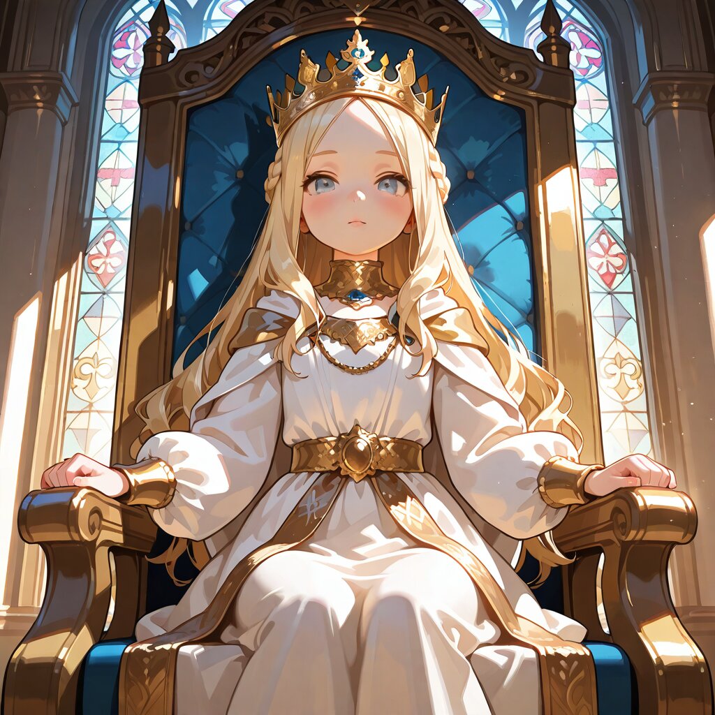 (Masterpiece, best quality, highres:1.2), (shining skin:1.1), (soft lighting:1.2), 1girl, young queen, (little princess:1.1), (royal crown:1.3), noble expression, looking at viewer, royal dress, white and gold clothes, mantle, jewelry, luxury accessories, elegant hair accessory, (long hair:1.1), (detailed eyes:1.2), medieval fantasy world, (throne room:1.2), castle interior, stained glass, sunlight, (realistic lighting:1.1), (soft focus:1.1), cinematic angle