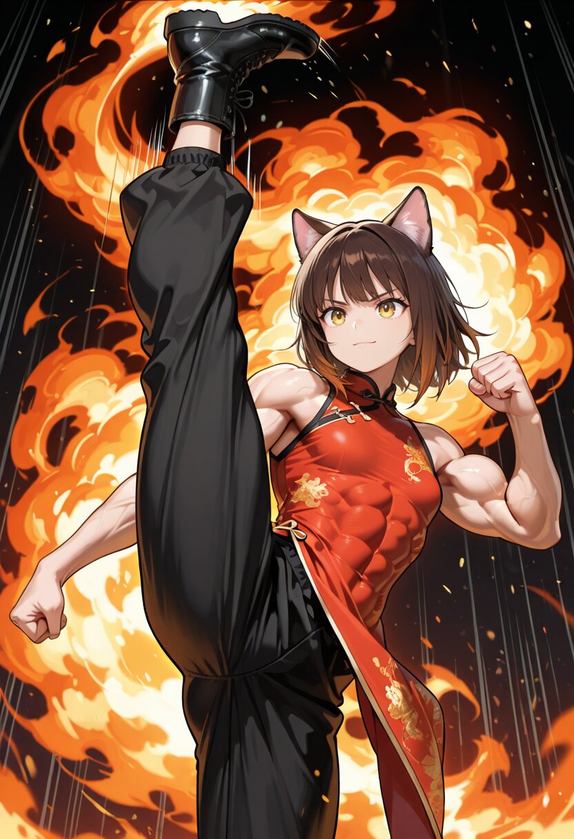 masterpiece,best quality,amazing quality,high resolution,ultra-detailed,very aesthetic,highres,highly detailed,absurdres,newest,general,1girl,solo,17yo,cute,(extreme muscular female,toned female,slender but muscular body,extremely defined muscular,(defined muscular arms,toned arms,extremely defined abs,covered abs,split,highkick:1.2),fighting stance,fist,speed lines,motion lines,chinese clothes:1.3),(cat ears,Brown hair, short hair,bangs),golden eyes,golden eyes of a cat,cute girl,slender,small breasts,sleeveless,light smile,angry,closed mouth,cat girl,(long china dress, long chinese pants,oversized pants),boots,slender girl,(large fire aura,aura,large fire circles:1.2),speed lines,motion lines,cowboy shot,fantasy,fire background,black background,medium hair,