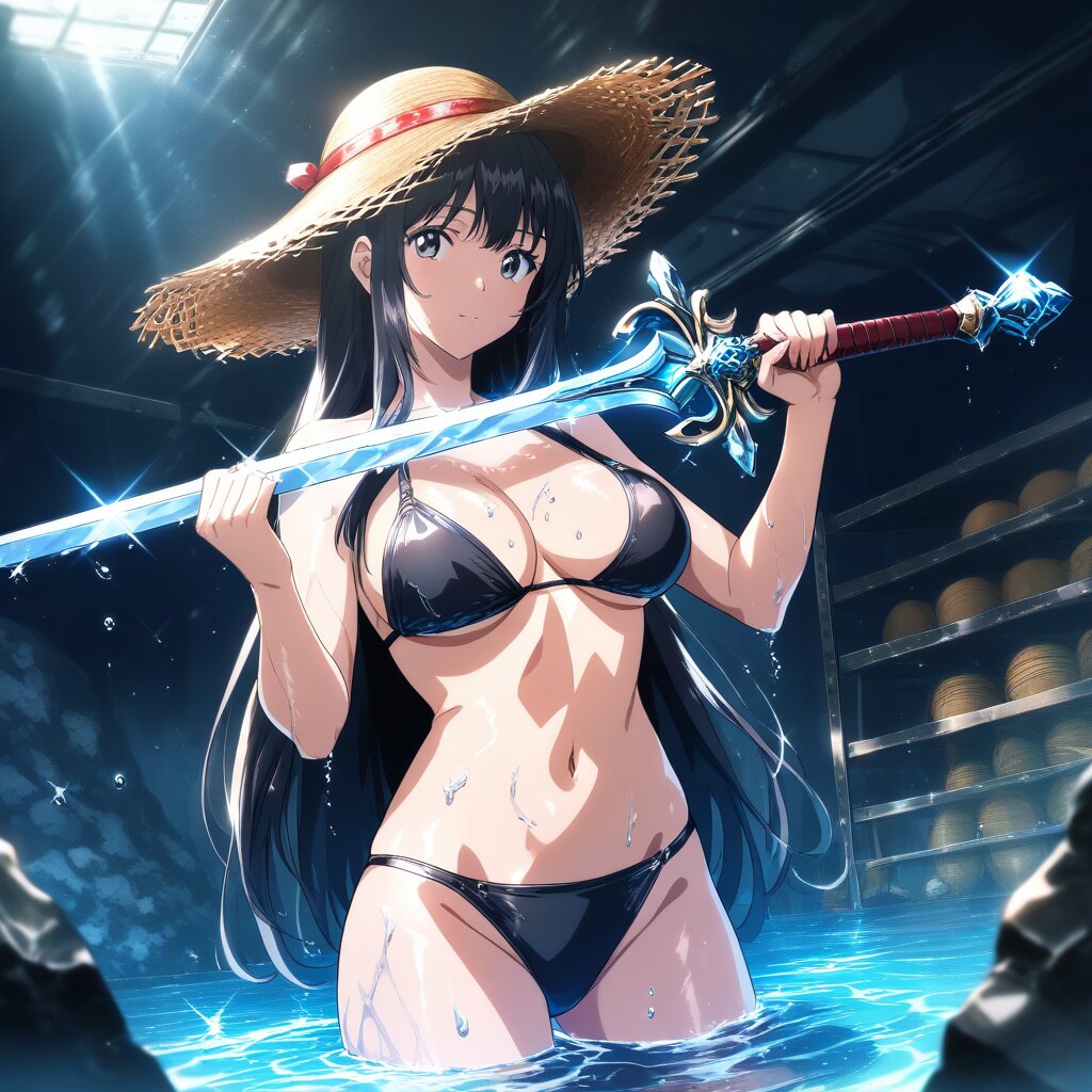 ((masterpiece)), ((best quality)), (ultra-detailed), anime style,cowboy shot, Dark cave,warehouse,partially submerged,underground, a cute girl,Large bust, solo, black bikini, beautiful black hair, beautiful black eyes, ((beautiful eyes)), ((Long hair)),Straw Hat, Holding a weapon in hand, gripping Sword,wet skin, glistening surface, soft shine, water droplets on skin