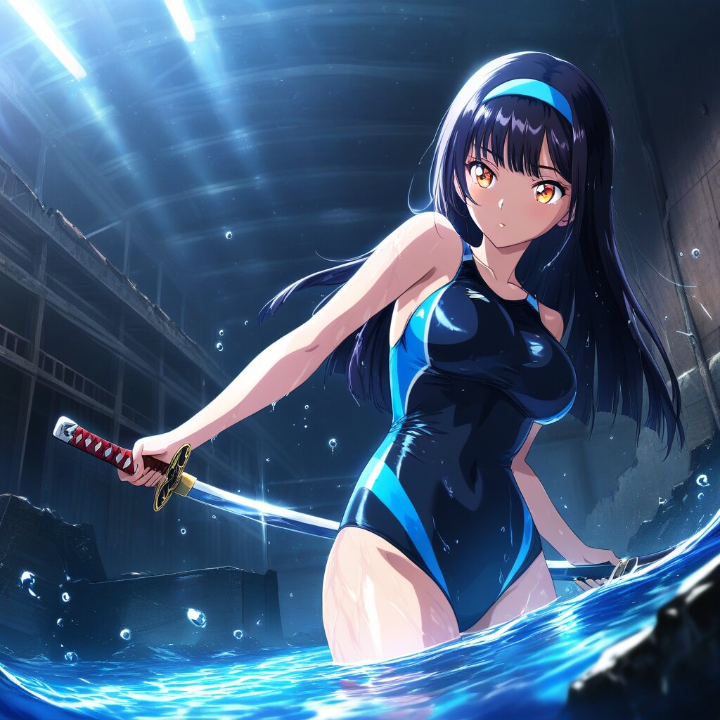 ((masterpiece)), ((best quality)), (ultra-detailed),anime style,cowboy shot, ruins,warehouse,partially submerged,underground, a cute girl, 1girl, large bust, ((Black Racing-style swimsuit)), beautiful black hair, beautiful orange eyes, ((beautiful eyes)),straight hair, (blunt hair), ((blue hairband)), Holding a weapon in hand, gripping katana,wet skin, glistening surface, soft shine, water droplets on skin,pensive