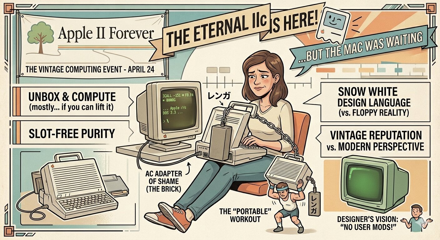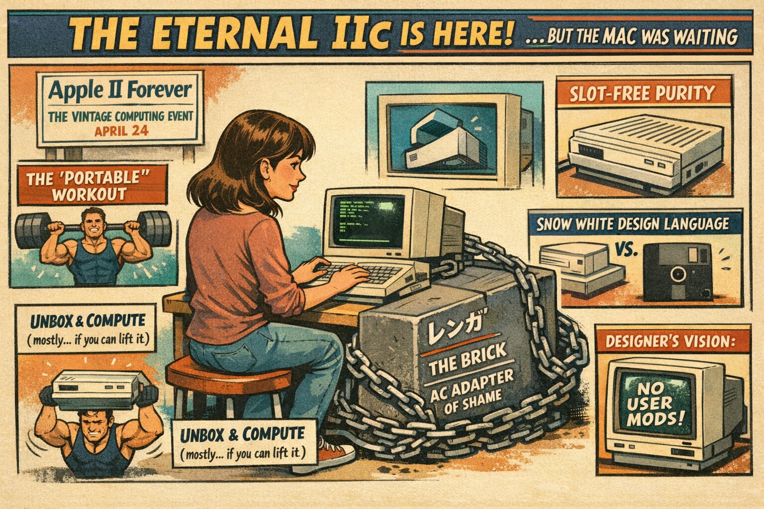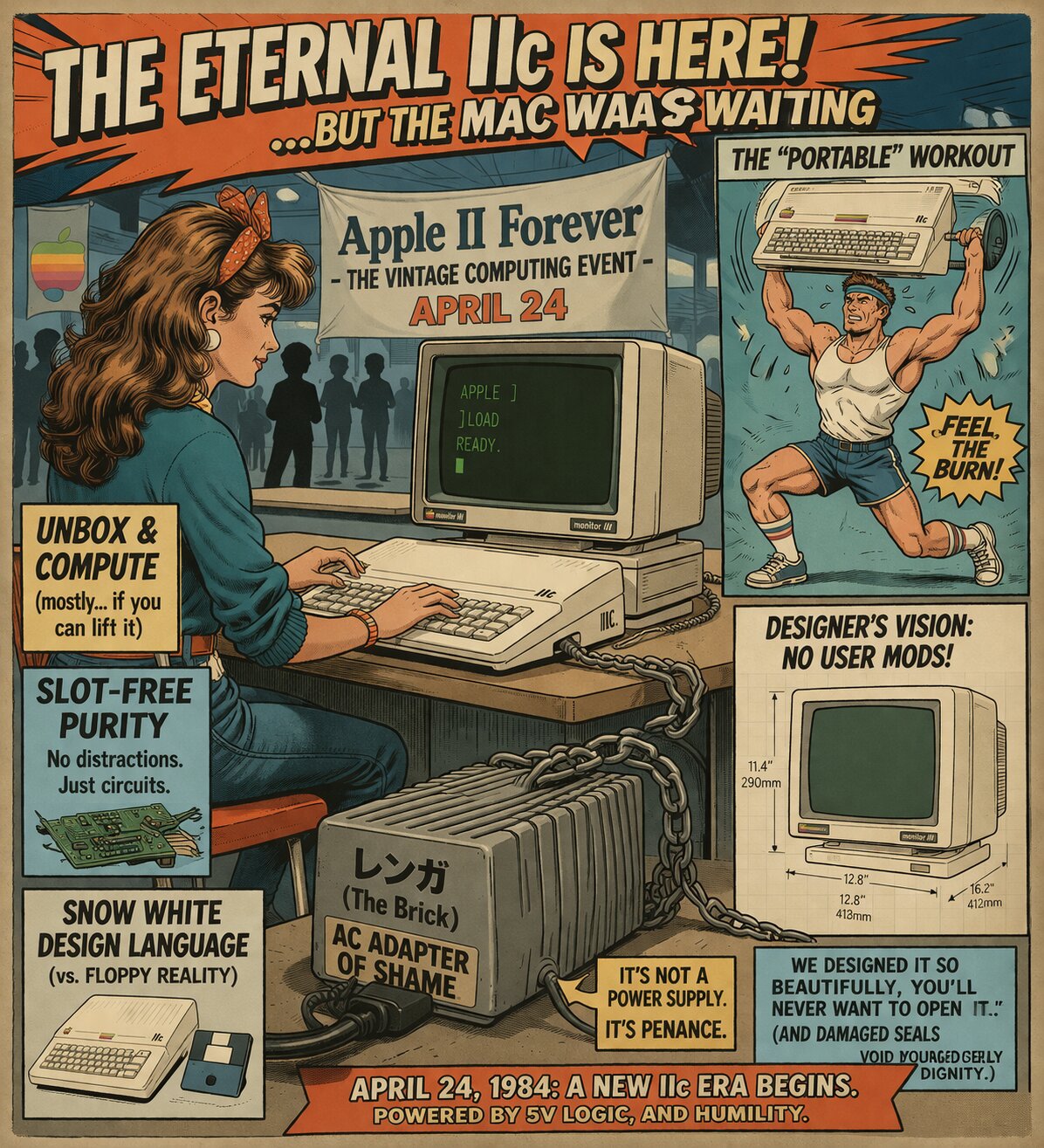 An educational and satirical infographic illustration about the launch of the Apple IIc on April 24, 1984. The central focus is a woman sitting and using a vintage 1980s computer that resembles the Apple IIc (reimagined to avoid direct copyright). The computer is connected to a bulky, thick beige CRT monitor with a curved glass screen displaying a green monochrome command line interface. The computer is chained to a massive, heavy grey power brick labeled "レンガ" (The Brick) and "AC ADAPTER OF SHAME." The illustration is in a clean, comic-book style with various text boxes and panels. - Top banner reads: "THE ETERNAL IIc IS HERE! ...BUT THE MAC WAS WAITING" - A sign in the background says: "Apple II Forever - THE VINTAGE COMPUTING EVENT - APRIL 24" - A small panel shows a muscular man lifting a heavy computer like a weightlifter, labeled "THE 'PORTABLE' WORKOUT." - Text boxes include: "UNBOX & COMPUTE (mostly... if you can lift it)", "SLOT-FREE PURITY", and "SNOW WHITE DESIGN LANGUAGE (vs. FLOPPY REALITY)". - A separate diagram of the CRT monitor is labeled "DESIGNER'S VISION: NO USER MODS!". The overall aesthetic is a mix of 1980s nostalgia and modern wit, using a vintage color palette of beige, muted teal, and orange.