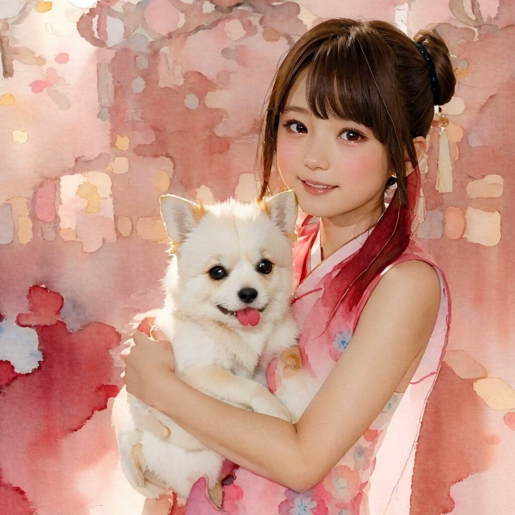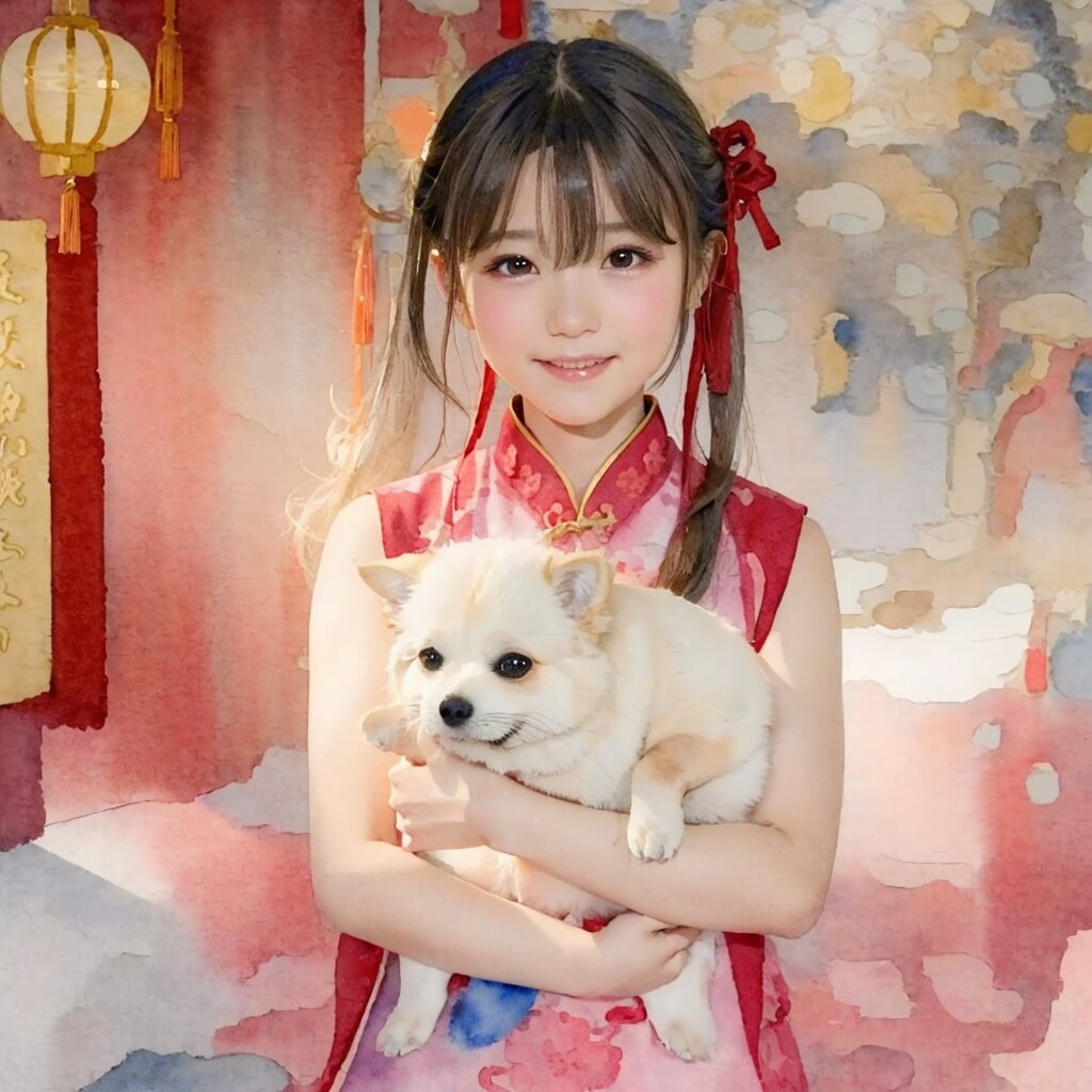 best quality, masterpiece, (watercolor painting:1.46), (line art:1.25), (illustration:1.1), (cel anime:1.3) japanese, 1 cute girl, (brown half updo:1.2), (large eyes:0.3), beautiful eyes detail, round face:1.2, holding a fluffy white cream-colored pomeranian in her arms, slightly moving in the breeze,soft natural sunlight, golden hour, shallow depth of field, background bokeh, (looking at viewer:1.2), light smile, (Chinatown), Chinese clothes, hanfu, china dress, (sleeveless),