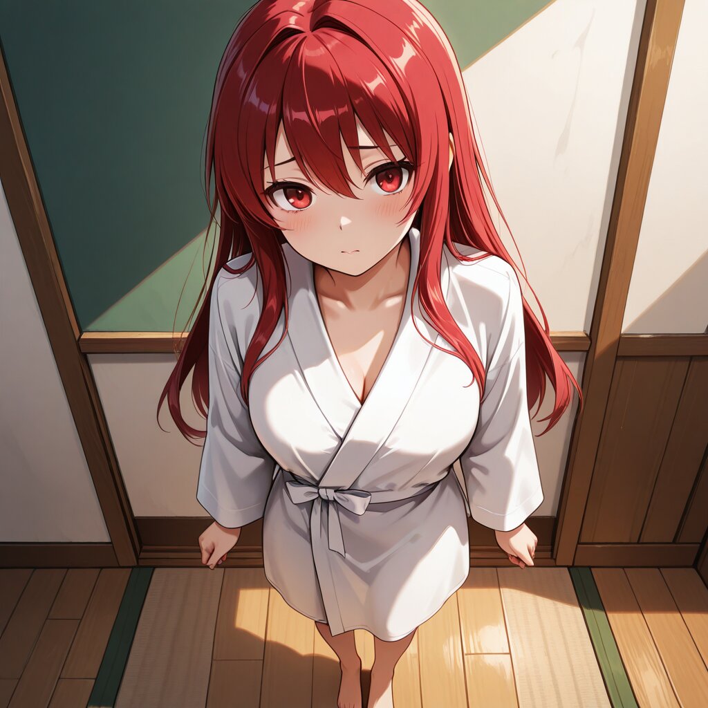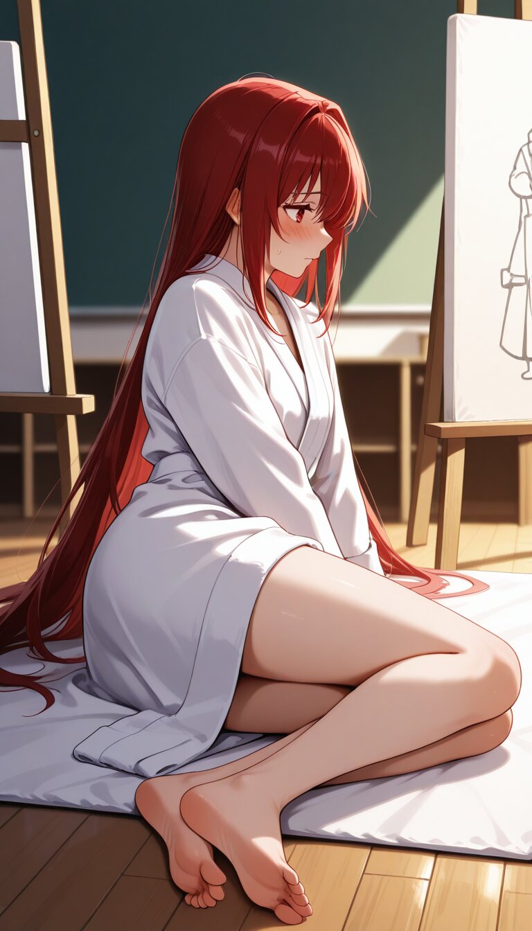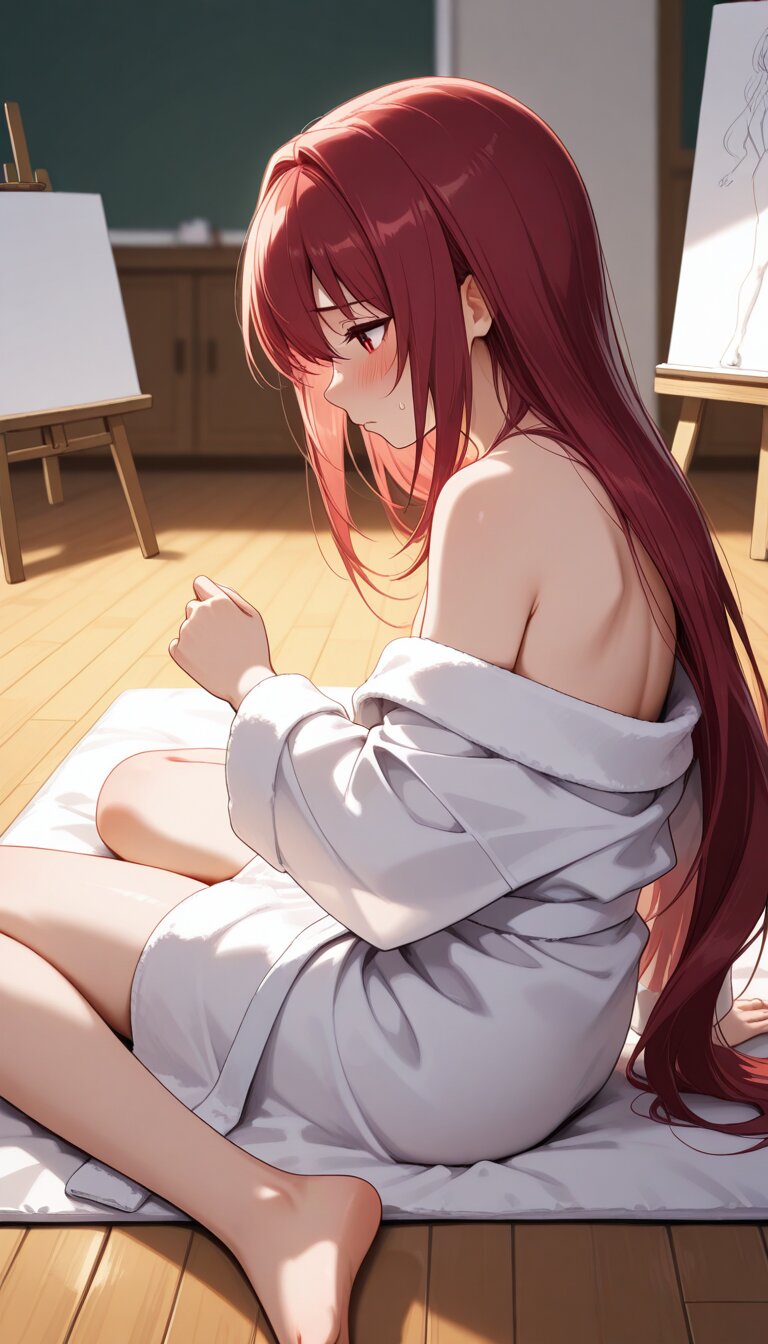 masterpiece,best quality,amazing quality, single_layout,single_view,single_angle,,1 anime woman, adult, full body, standing in the center, large in frame, dominant subject, main focus, clearly visible. She has long red hair and red eyes. She is wearing a white bathrobe, loosely wrapped around her body, covering her nudity. She looks uncomfortable and tense, standing still. The woman occupies most of the image, central composition, full body clearly visible, not obscured, not hidden, not cropped. Wooden floor, in, art classroom setting. A white gym mat (about 1 tatami size) under her feet. In the background, a few artists and easels are partially visible, only parts of the artists and easels are seen, such as backs, shoulders, or silhouettes. The artists are facing their easels, with their backs turned toward the woman. They are seated or positioned behind their easels in a standard drawing posture. The artists are looking at the canvas surfaces, focusing on drawing, not looking at the woman directly. Easels are placed in front of the artists, between the artists and the woman. The canvas surfaces are facing the artists. Background figures are drawing, not clearly detailed, secondary elements.,rina-san, matte_eyedetail, hairdetail, detailed background,