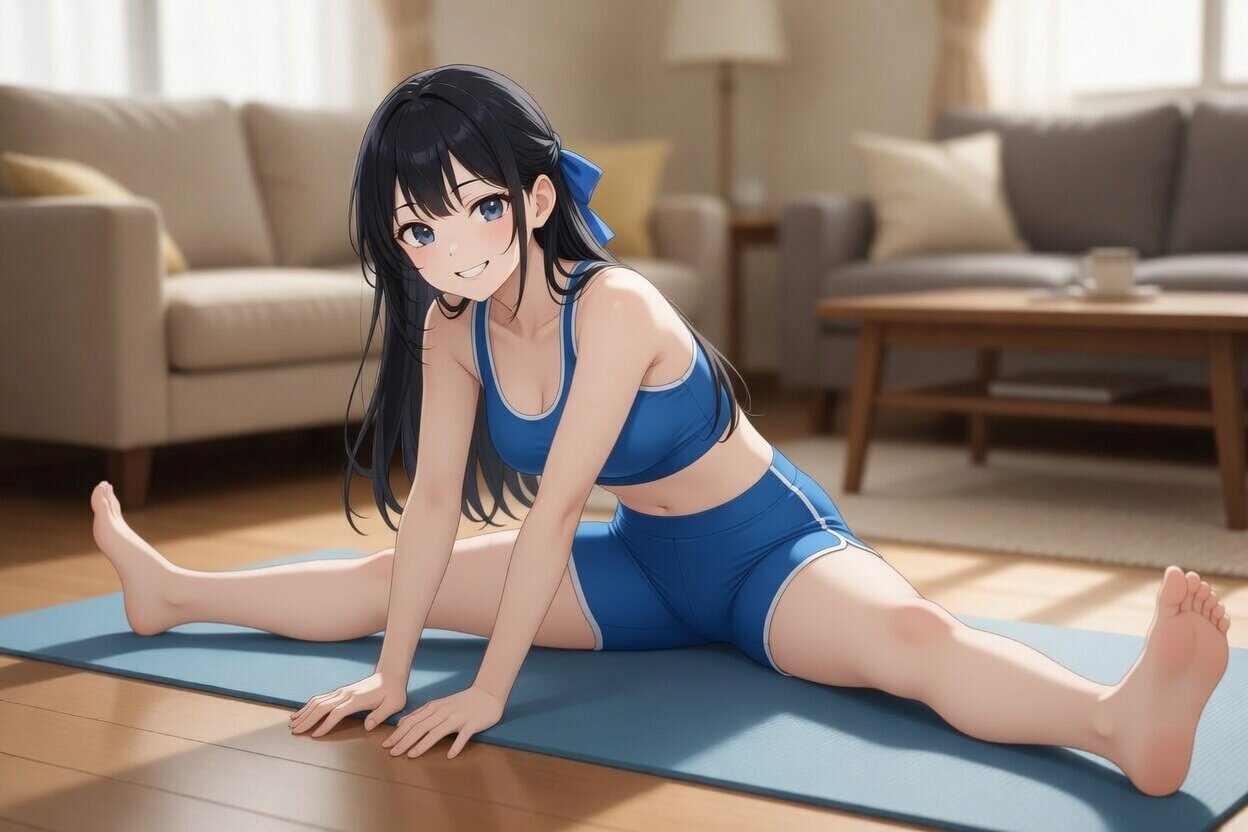 日本人女性24歳のデジタルイラスト。リビングのヨガマットの上に座って柔軟体操。両足を直線上に伸ばして開脚して前傾姿勢。楽しそうな表情。ヨガウエアを着ている。ボトムはドルフィンパンツ。斜め前からの構図。