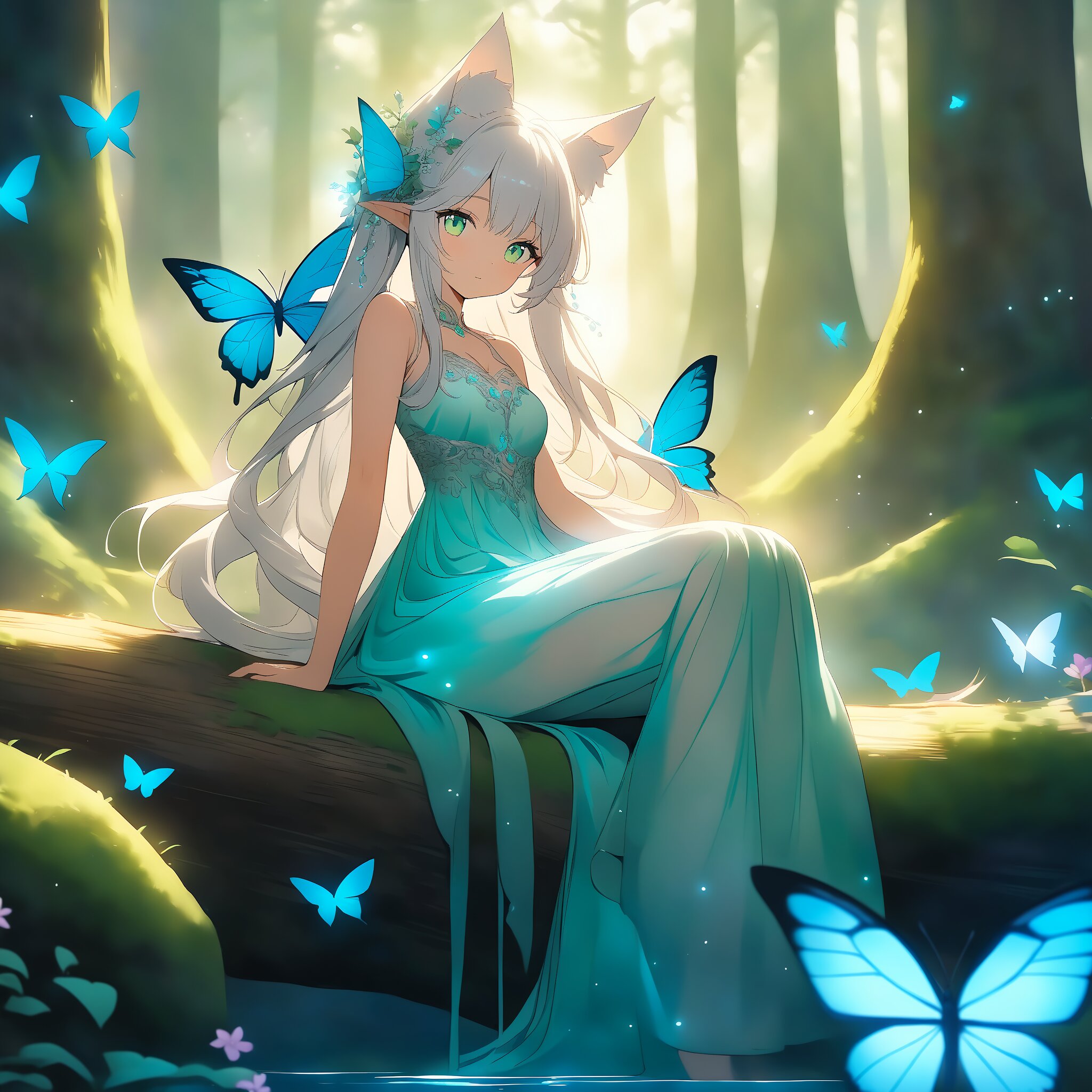 Masterpiece, fantasy art style, a mystical cat-eared girl as a guardian of an ancient bioluminescent forest. She is sitting on a mossy tree root, surrounded by glowing blue butterflies and floating magical spores. Long flowing silver hair, fluffy white ears adorned with small forest flowers. Wearing a dress made of translucent silk and vines. Emerald green eyes glowing softly. Magical mist, dappled sunlight filtering through giant leaves, soft cinematic lighting, dreamlike atmosphere, 8k, intricate details.