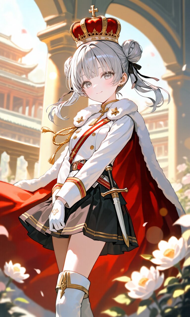 1girl, a 16-year-old girl with delicate features, silver hair styled in double buns secured with a hair ribbon, and striking silver eyes, stands in a poised and cute pose. She wears a (White luxurious Prince costume with red trim:1.6) with long sleeves, a (luxurious red Cape:1.3) draped elegantly over her shoulders, and a (luxurious Black mini skirt:1.4). Her outfit is completed with (luxurious White Boots:1.3), (luxurious White gloves:1.3), and a (dagger on waist:1.3). A (luxurious crown:1.4) rests atop her head, adding to her regal appearance. Her expression is soft, with a light smile that enhances her youthful charm. The setting is a grand Palace with traditional Chinese architecture, bathed in the warm glow of afternoon sunlight. The scene has a hazy, romantic academia atmosphere, with delicate flowers scattered around and lens flare enhancing the dreamy mood. Soft lighting and bloom effects create an ethereal ambiance, while the intricate details of her clothing, skin, and hair showcase a masterpiece of artistry. The overall composition blends classic elegance with a touch of fantasy, emphasizing beauty and refinement.