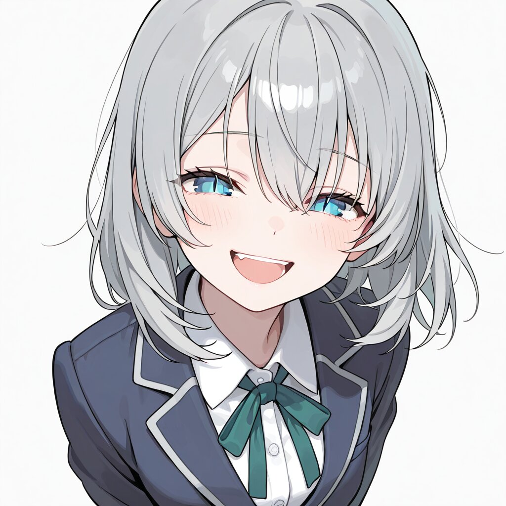1girl, solo, masterpiece, best quality, anime style, high detail, (silver gray medium hair:1.2), hair over both eyes, (blue eyes:1.2), slit pupils, eyes reflection, (blush:0.7) looking at viewer, closed eyes, eyes closed, big smile, open mouth, laughing, cheerful expression, joyful expression, navy blue hip length blazer, white blouse, green neck ribbon, japanese school uniform, schoolgirl, high school, simple background, white background, (cinematic lighting:0.4), (pastel color:1), slender body, (large breast:0.8), elegant, calm atmosphere, minimal emotion, serious look