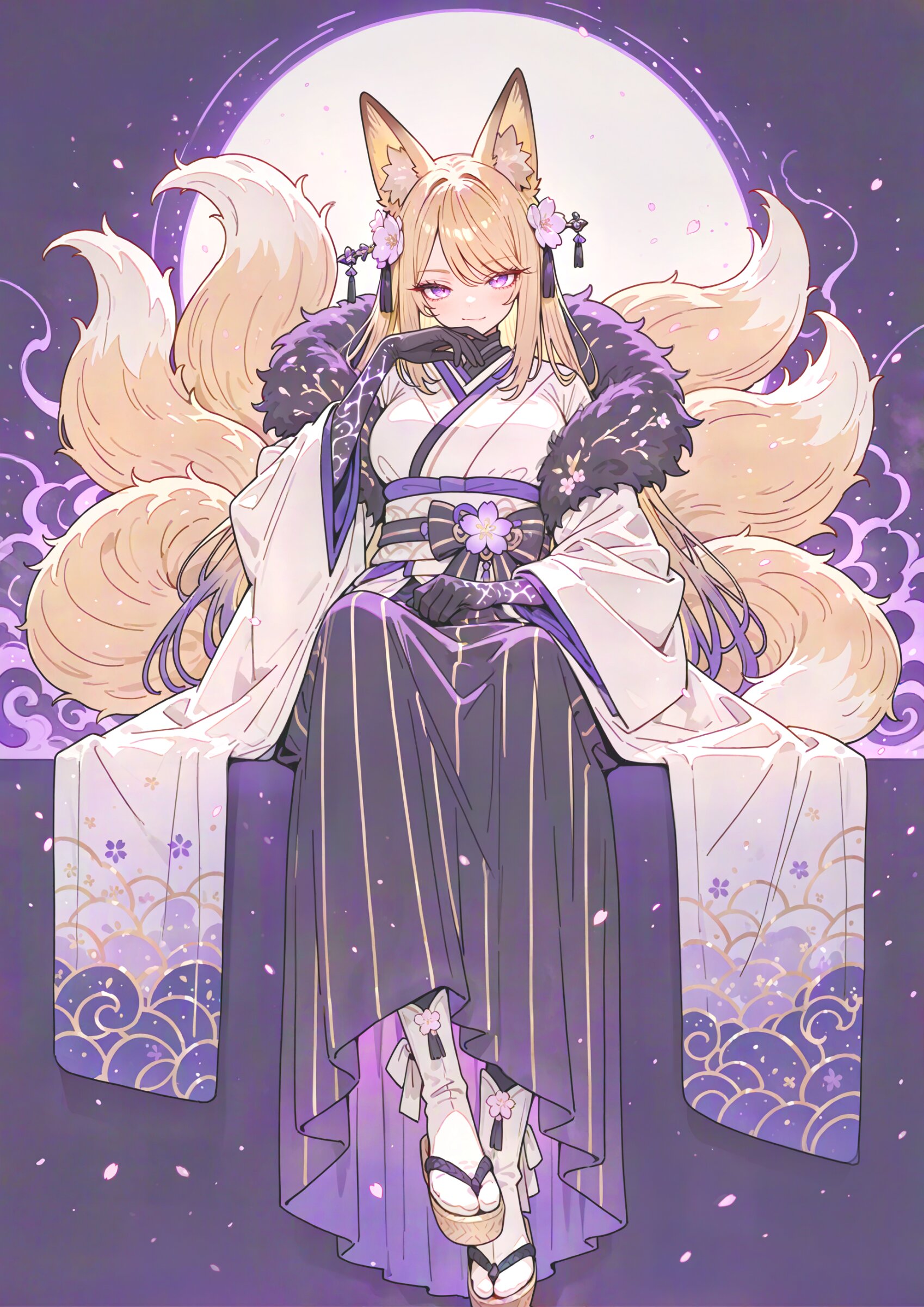 front view, focus head, (face:1.3), (blurry foreground:1.1), looking at viewer, (simple light pale color burgundy background:1.1), drop shadow, colored shadow, The background is a solid, bright pale color burgundy, creating a striking contrast with the intricate, multi-colored design of the character, (ink wash effect:0.9), pop color background, (high saturation:1.2), spring coloring, spring atmosphere, 1girl, fox girl, gold Blond Hair, large breasts and fox ears, (swept bangs:1.2), (perfect purple eyes:1.3) long eyelashes aristocratic features tall girl has (Blond Hair long hair over ears:1.3) fox 9tails, (wearing White Japanese Cloth straw sandal black silk gloves long skirt Obi boots:1.3), hair ornament flower, tabi, winter scarf, (fur trim:1.1), black thighhighs, wide sleeves, mysterious atmosphere, seductive smile, serious, light trail, smoke trail, (ink wash painting:0.9), , cherry blossoms, sitting, figure four sitting, pale color burgundy theme, super fine concept art, unreal engine, graceful eyes, masterpiece, best quality, amazing quality, very aesthetic, absurdres, newest, professional art lots of details, , overexposure, sumie effect style, 4ur4_illu,shiny, glowing, glowing particles, glowing light particles, light particles, bushfire chocolate, <lora:noline (1):-0.5> <lora:sdxl2-flat2-512b:0.15> <lora:facelightup_xl_v10:0.5> <lora:V2_yakumo_alchemy:0.5> <lora:Aura_illu:0.1>