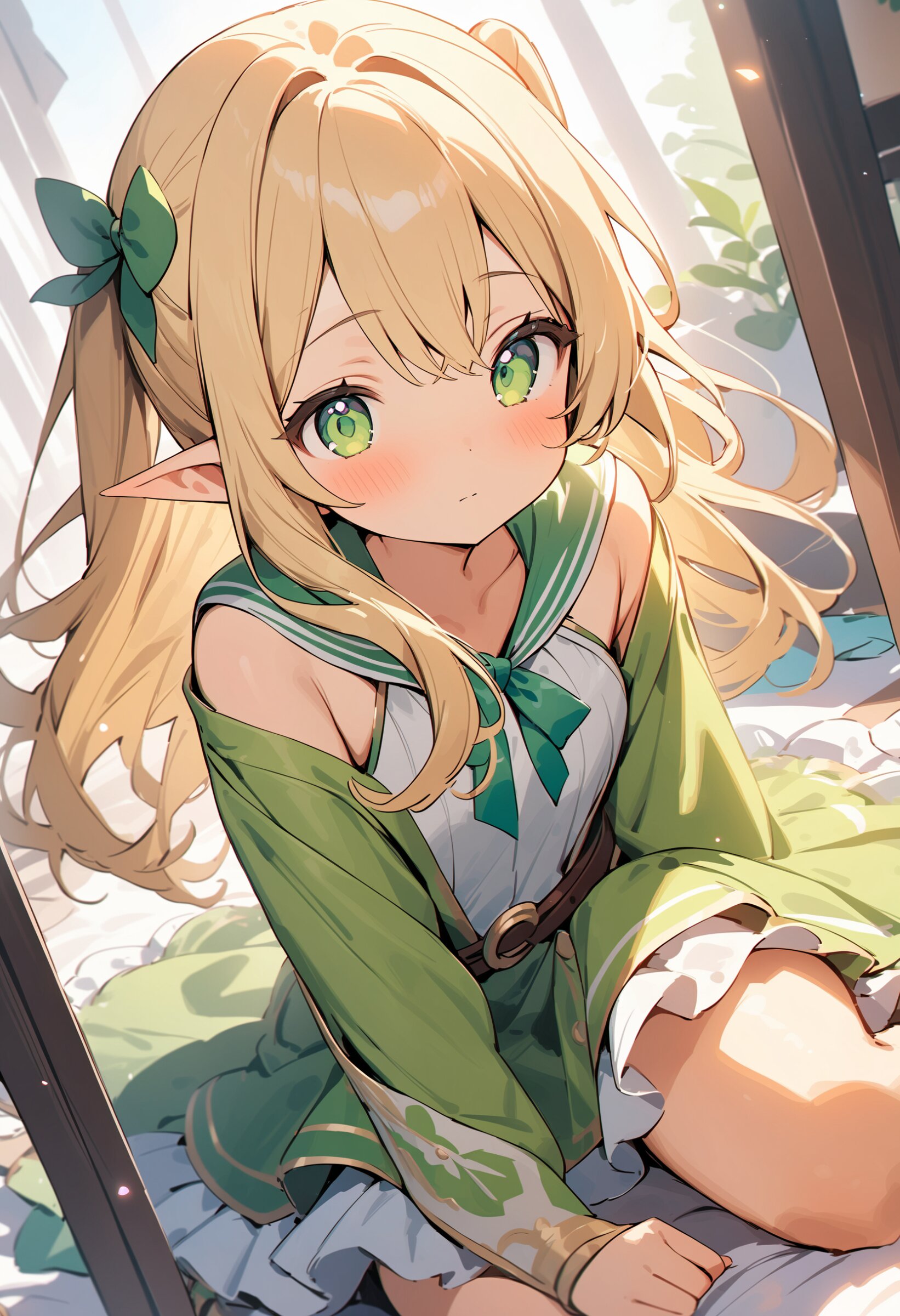 ((masterpiece)), ((best quality)), ((kawaii)), cute, (lovely), ((extremely detailed)), (beautiful), dynamic angle, a cute girl, 1girl, solo, ((elf)),beautiful blond hair, beautiful green eyes, ((beautiful eyes)), long hair, fantasy clothes,