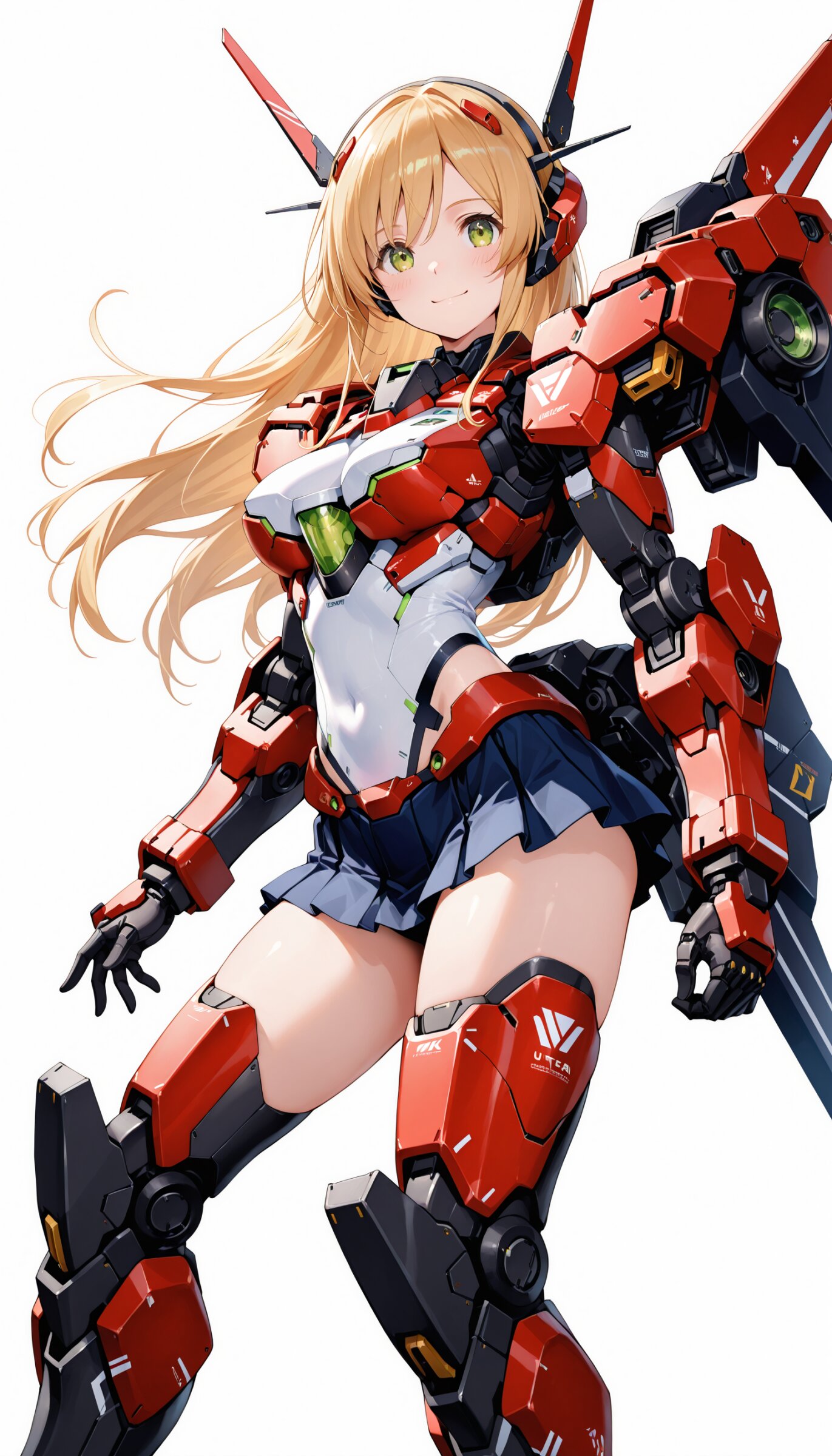 1girl, ((white background)), ultra detailed 8k cg render, masterpiece, high resolution, extremely detailed, mecha musume,mecha shoulder, mech leg, headgear, mecha armor, ((mini skirt)),long blonde hair, dropping green eyes, smile, dynamic posing,
