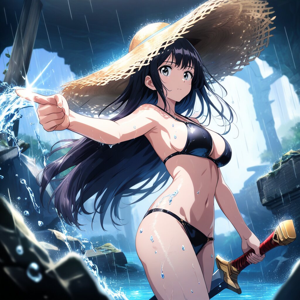 ((masterpiece)), ((best quality)), (ultra-detailed), anime style,cowboy shot, ruins ,Rain,underground, a cute girl,Large bust, solo, black bikini, beautiful black hair, beautiful black eyes, ((beautiful eyes)), ((Long hair)),Straw Hat, Holding a weapon in hand, gripping Sword, pointing melee weapon,wet skin, glistening surface, soft shine, water droplets on skin,pensive