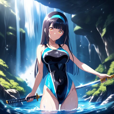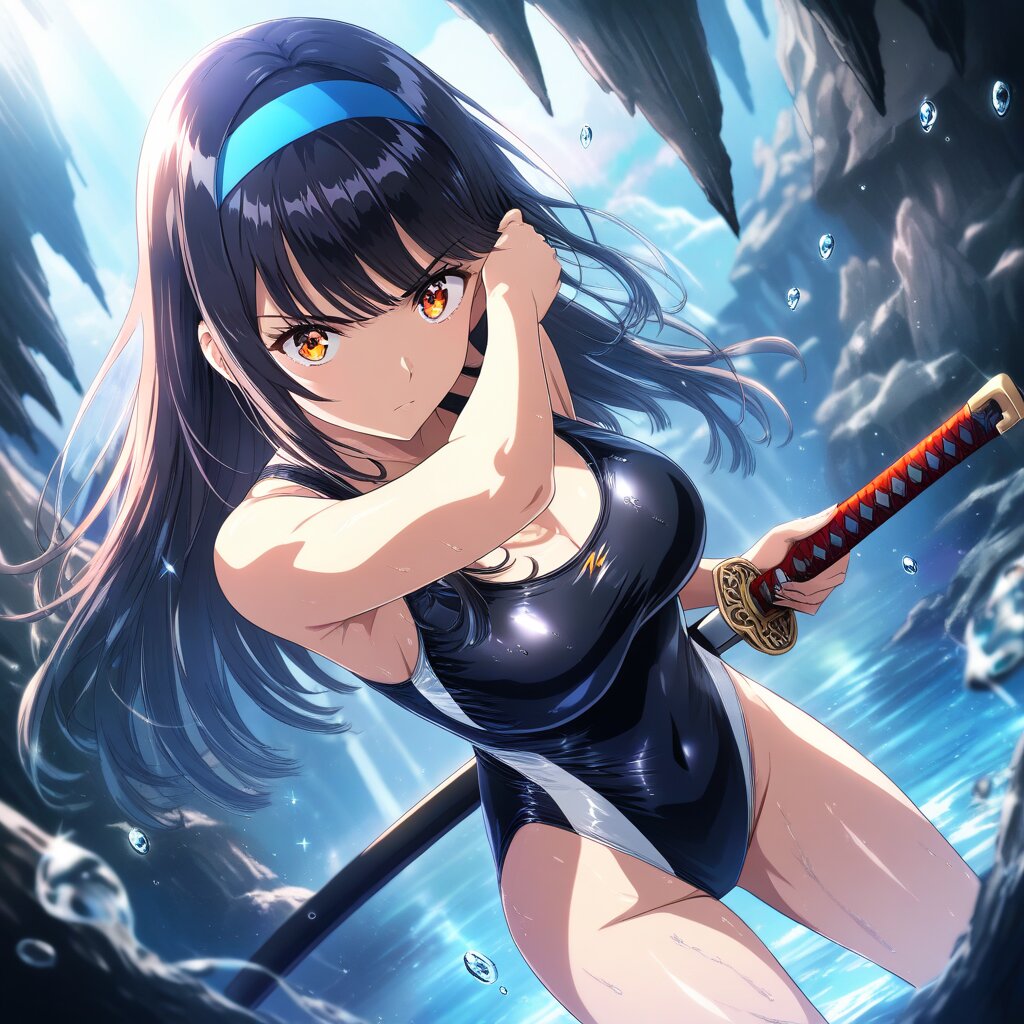 ((masterpiece)), ((best quality)), (ultra-detailed),anime style,cowboy shot,Cave, stalactites, water droplets, a cute girl, 1girl, large bust, ((Black Racing-style swimsuit)), beautiful black hair, beautiful orange eyes, ((beautiful eyes)),straight hair, (blunt hair), ((blue hairband)), Holding a weapon in hand, gripping katana,dynamic pose,dynamic angle,wet skin, glistening surface, soft shine, water droplets on skin, tucking hair,Serious,zombie horde