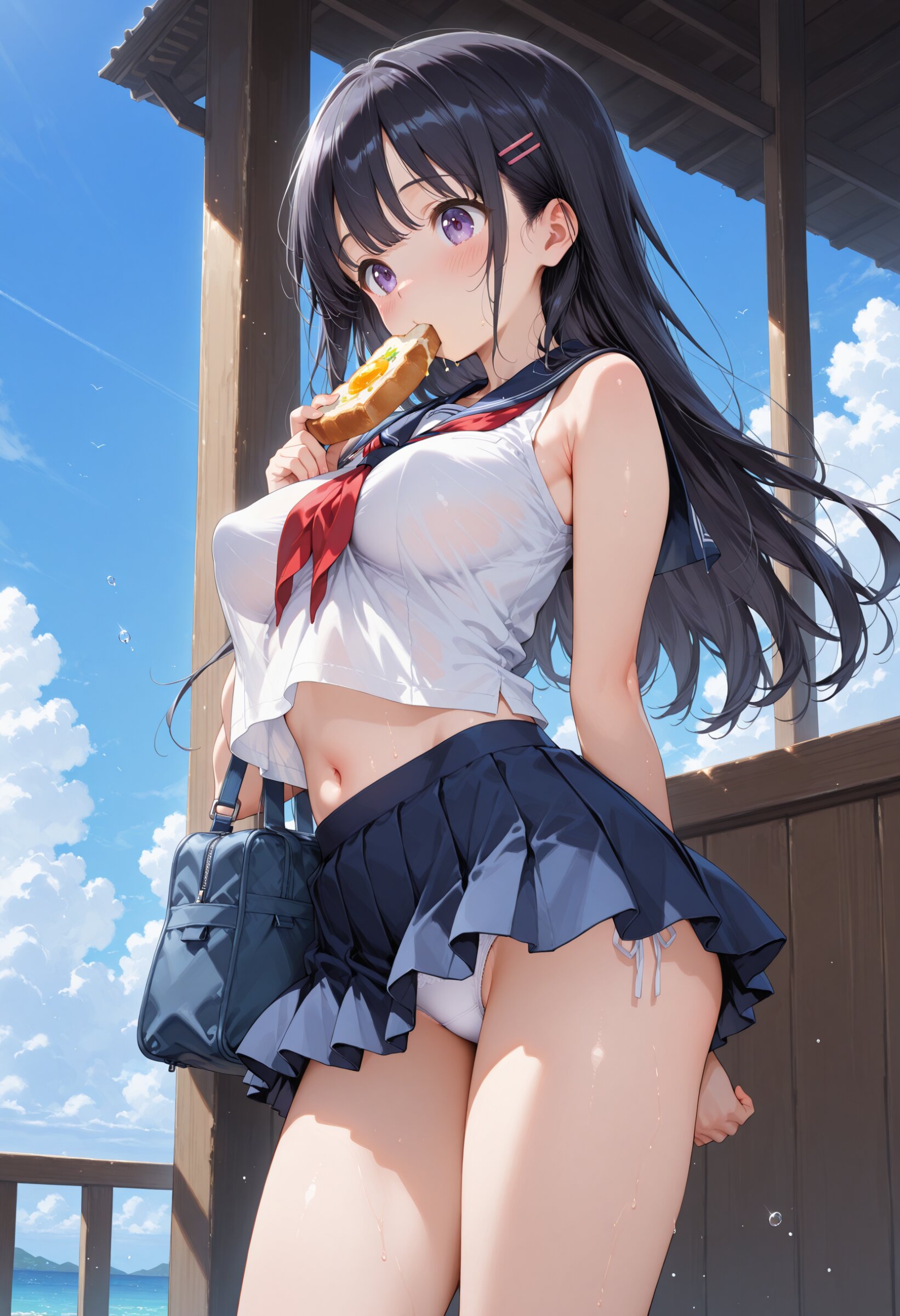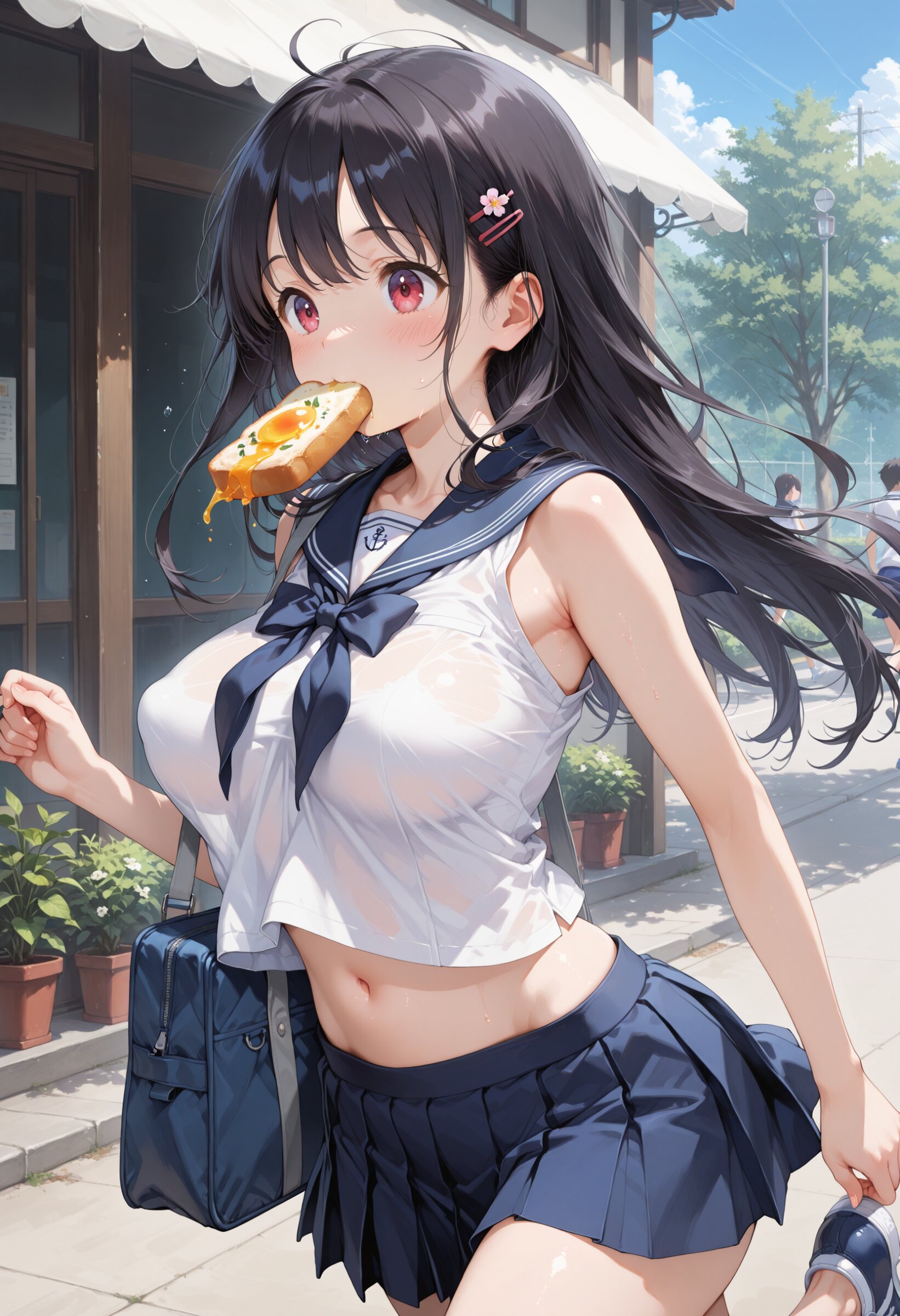 masterpiece, best quality, highres, ultra-detailed, extremely detailed, detailed, 1girl, loli, petite, beautiful hair, long hair, black hair, school sailor dress, sleeveless, navy blue miniskirt, beautiful legs, summer, big breasts, navel, (perky breasts:1.2), (Running:1.2), with a slice of bread in her mouth, in a hurry, hold a Shoulder bag, cowboy shot,