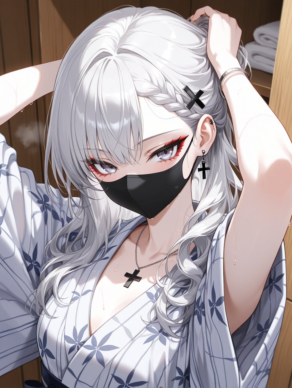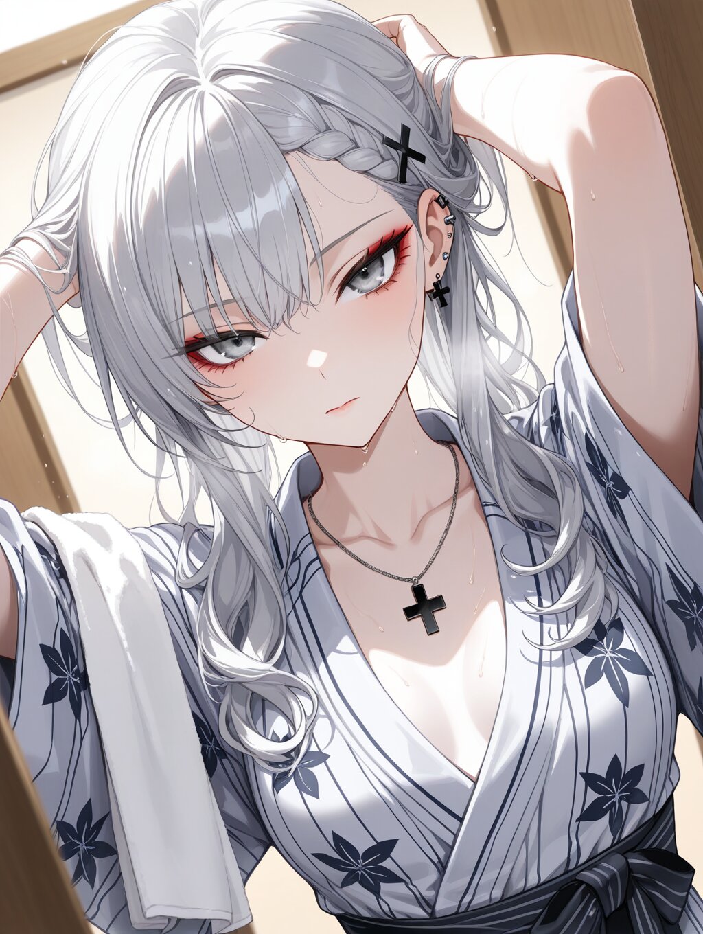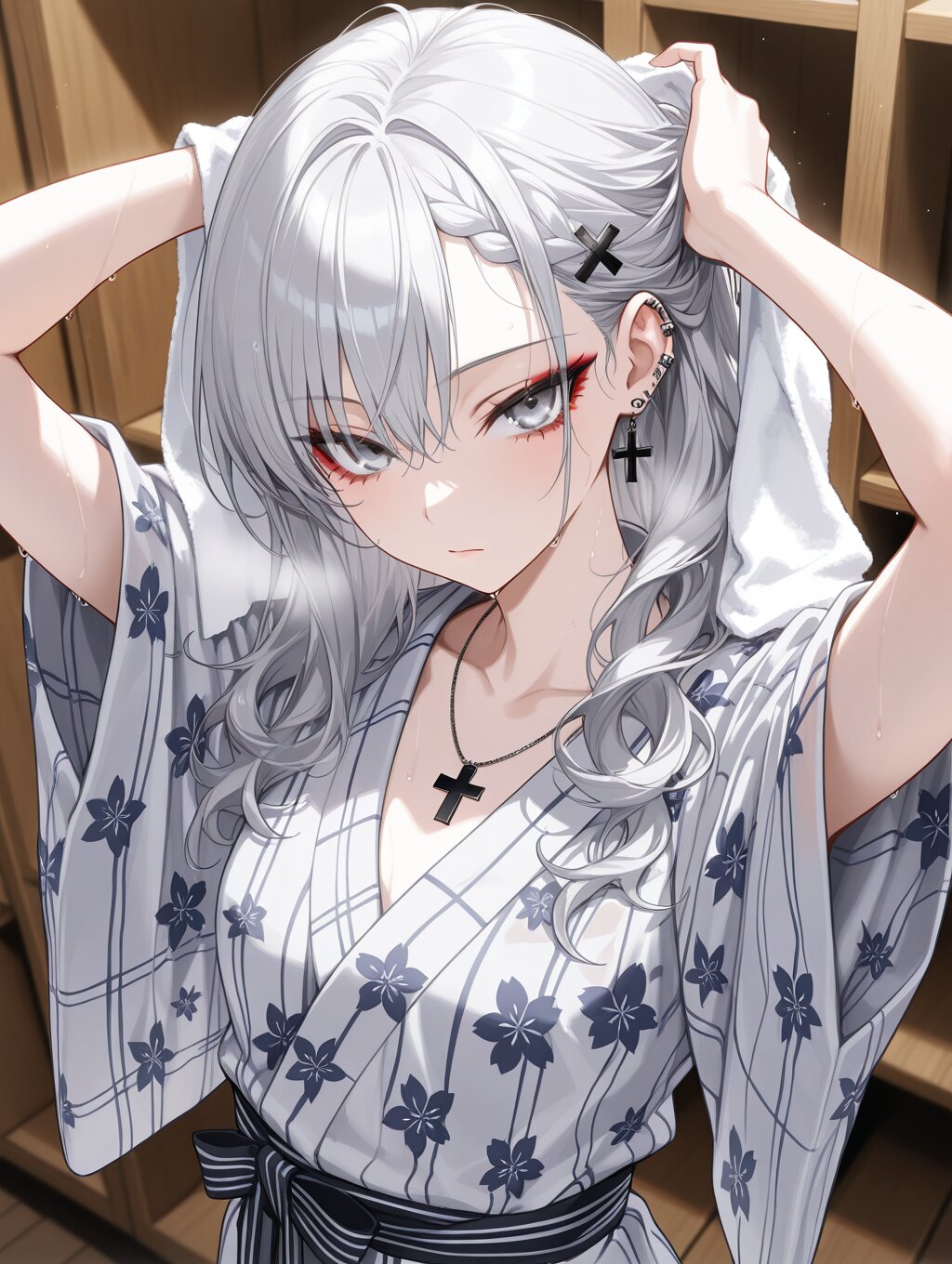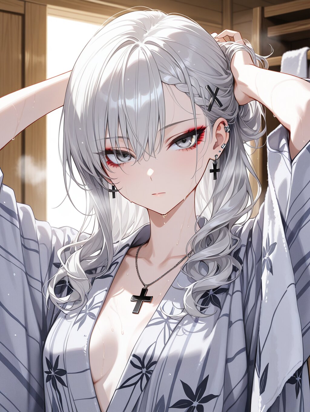 masterpiece,ultra detailed,detailed shading,detailed texture,(catchlight:1.3),highly detailed eyes,watery eyes,vivid,<lora:cveb6c5e878c739bt83g:0.4>, full head, (close-up:0.6),front view, wood changing room,upper_body,wet,steam, ryokan yukata,curl own hair with a towel,arms above head, 1girl, gyaru,fair_skin,cool beauty,tsurime,(silver hair),long hair,small_breasts,(medium breasts:0.8),half-closed eyes,bangs,slender,punk,black cross necklace,(silver eyes:1.1),(red eyeliner:0.8),braided bangs,wave hair,wave hair,black cross hair pin,expressionless,white_skin,