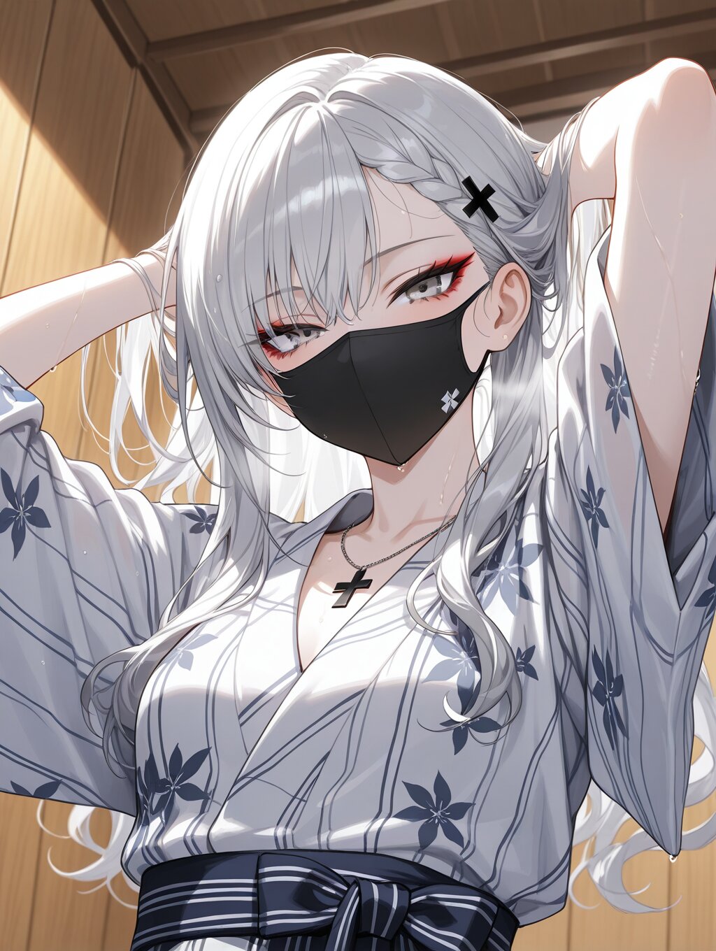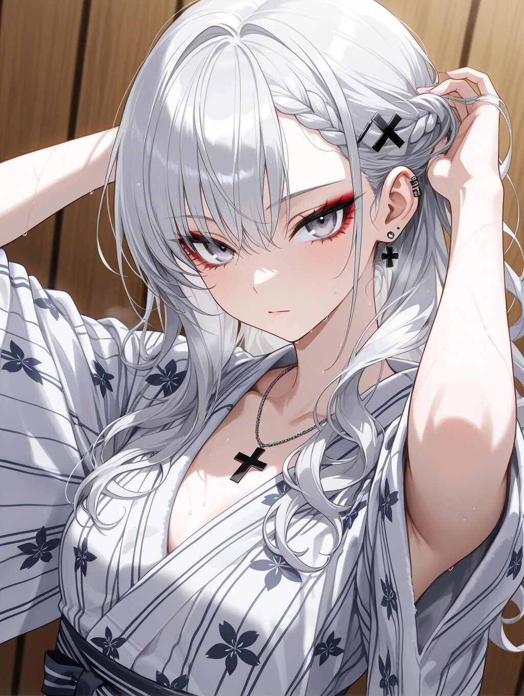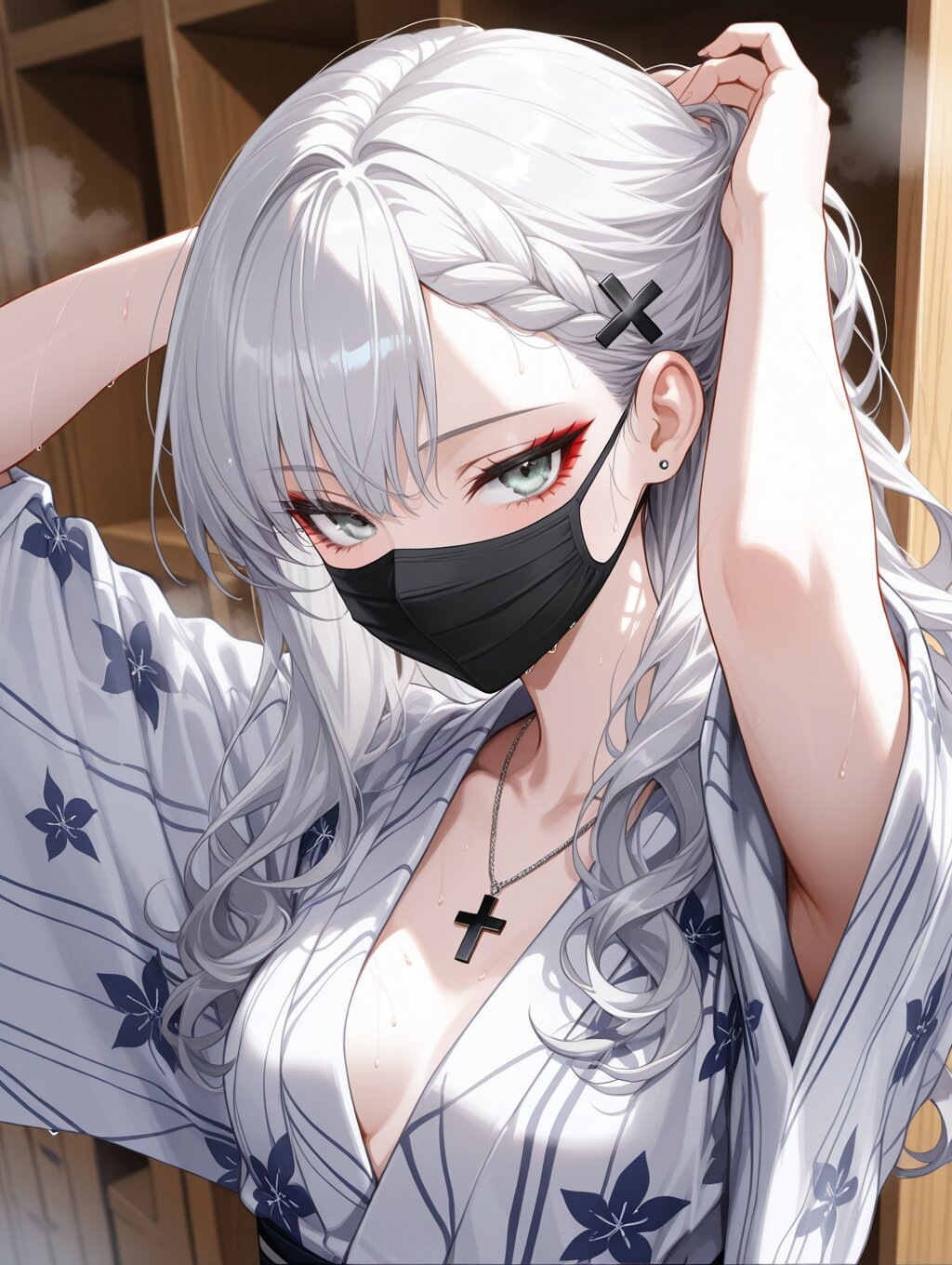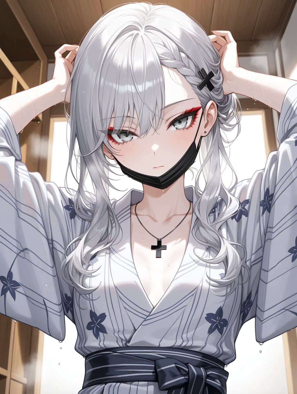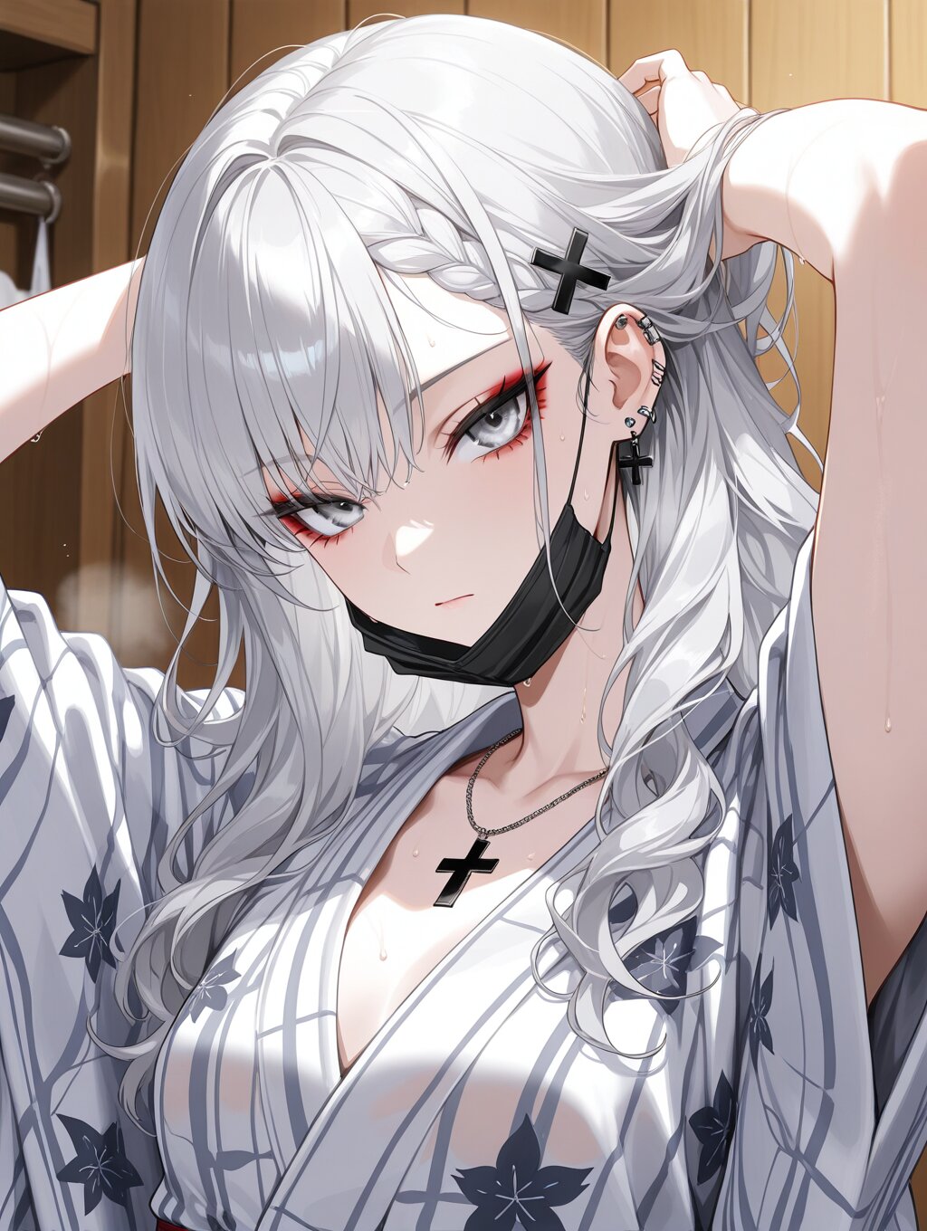 masterpiece,ultra detailed,detailed shading,detailed texture,(catchlight:1.3),highly detailed eyes,watery eyes,vivid,<lora:cveb6c5e878c739bt83g:0.4>, full head, (close-up:0.6),front view, wood changing room,upper_body,wet,steam, ryokan yukata,curl own hair with a towel,arms above head, 1girl, gyaru,fair_skin,cool beauty,tsurime,(silver hair),long hair,small_breasts,(medium breasts:0.8),half-closed eyes,bangs,slender,punk,black cross necklace,(silver eyes:1.1),(red eyeliner:0.8),braided bangs,wave hair,wave hair,black cross hair pin,expressionless,white_skin,