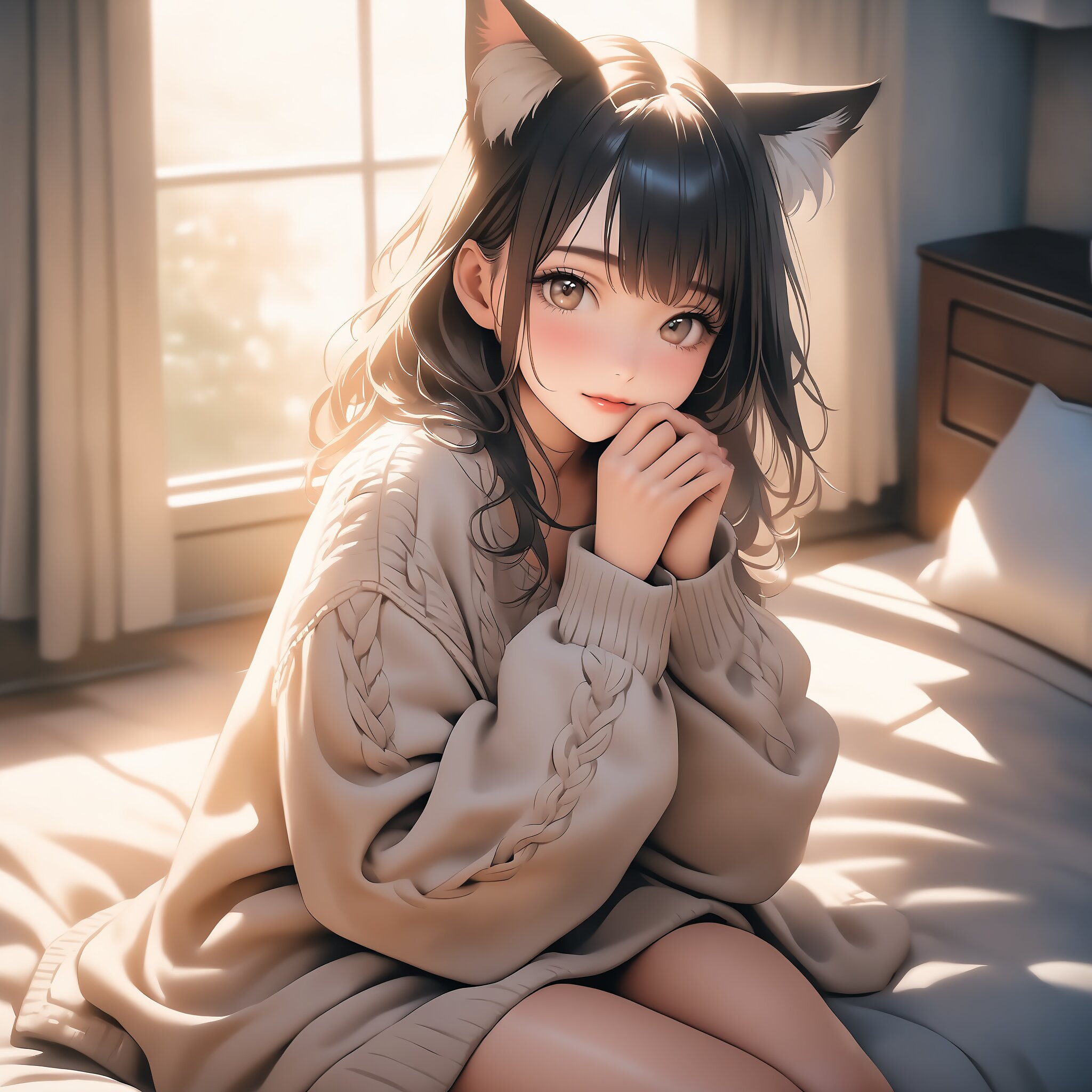 Masterpiece, best quality, a stunningly cute cat-eared girl with fluffy white ears, wearing an oversized beige knit sweater that partially covers her hands, soft messy hair, sitting on a bed in a sunlit cozy room, soft morning sunbeams streaming through the window, gentle and shy expression looking at the viewer, soft cinematic lighting, dreamy atmosphere, high-resolution, realistic anime style, 8k.