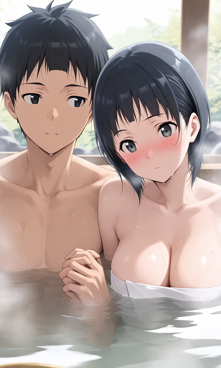 They sit shoulder to shoulder in a bathtub filled with continuously flowing hot spring water. Her short hair is damp with steam, and her cheeks are flushed pink. She peeks over his shoulder, and their fingers intertwine in the water. The distinctive scent of radium springs fills the air, and a sweet tension runs between them. It feels as if their body heat is melting into the water. BREAK the boy(,original boy, short hair, black eyes) BREAK the girl(Suguha Kirigaya,short hair, black hair,grey eyes,large breasts),