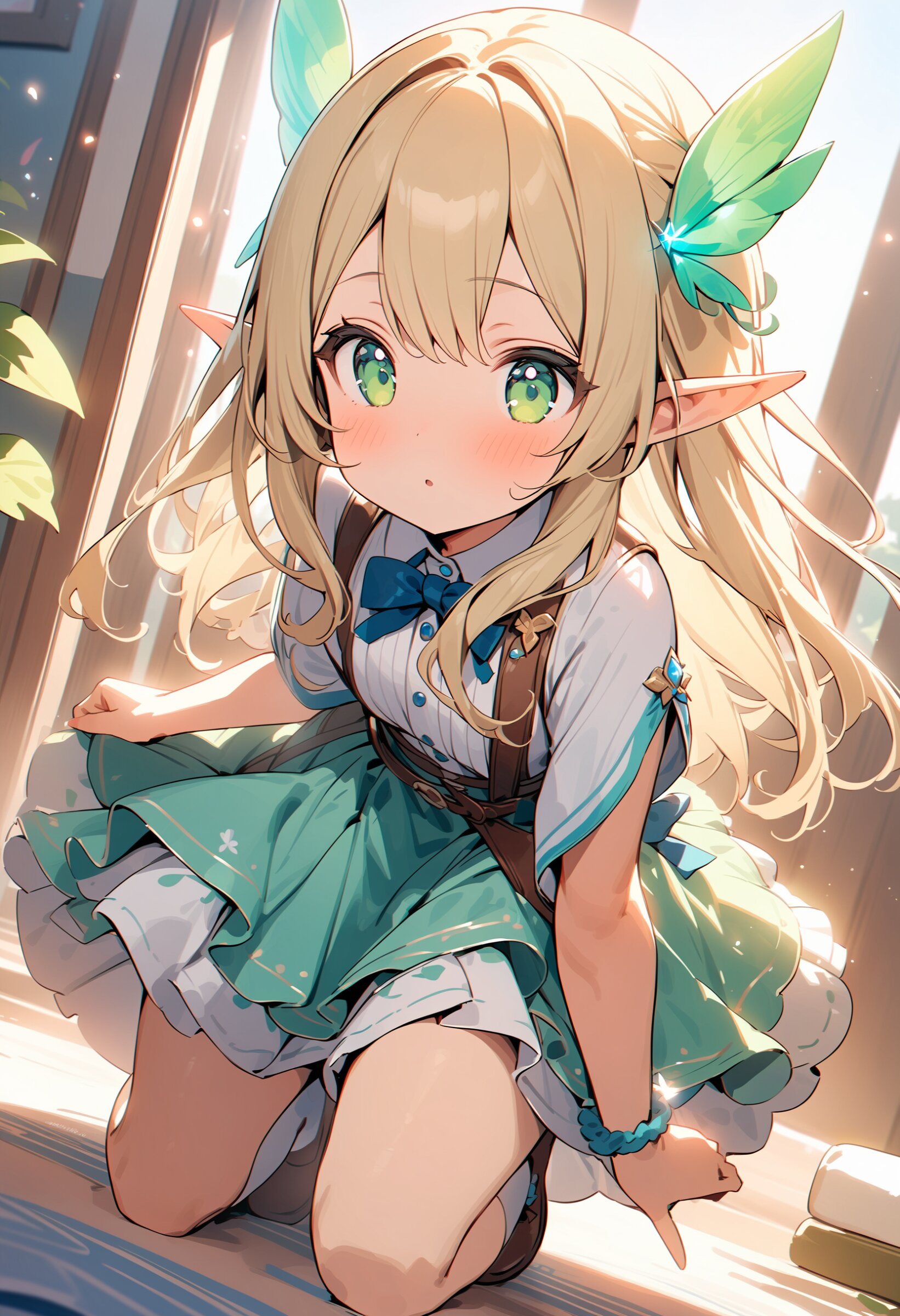((masterpiece)), ((best quality)), ((kawaii)), cute, (lovely), ((extremely detailed)), (beautiful), dynamic angle, a cute girl, 1girl, solo, ((elf)),beautiful blond hair, beautiful green eyes, ((beautiful eyes)), long hair, fantasy clothes,