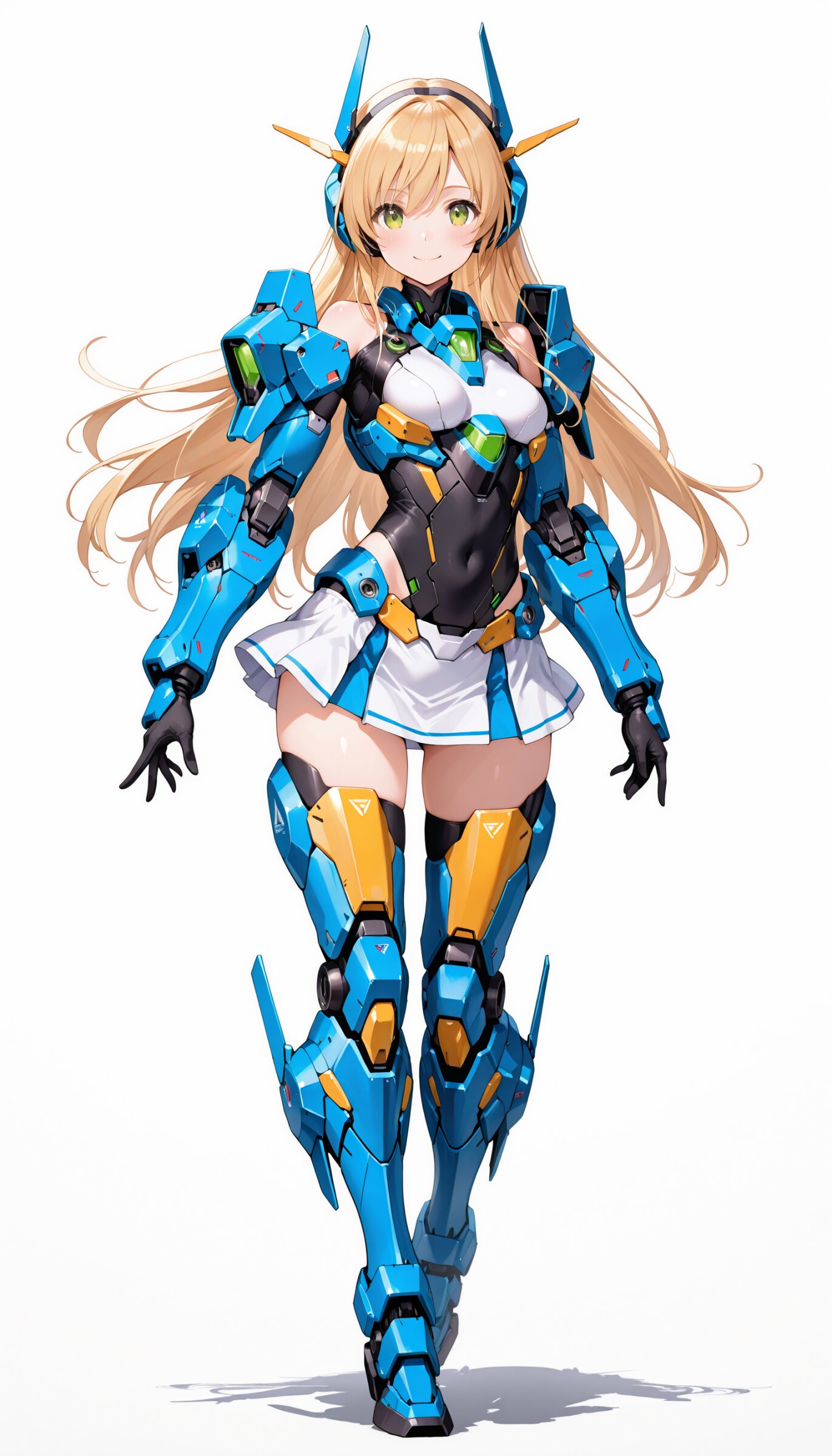 1girl, ((white background)), ultra detailed 8k cg render, masterpiece, high resolution, extremely detailed, mecha musume,mecha shoulder, mech leg, headgear, mecha armor, ((mini skirt)),long blonde hair, dropping green eyes, smile, dynamic posing,