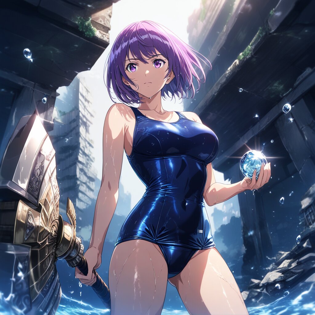 ((masterpiece)), ((best quality)), (ultra-detailed), anime style,cowboy shot, ruins,underGround, large bust,(school swimsuit), navy blue, short hair, purple hair, Holding a weapon in hand, gripping Battle Axe, wet skin, glistening surface, soft shine, water droplets on skin,pensive