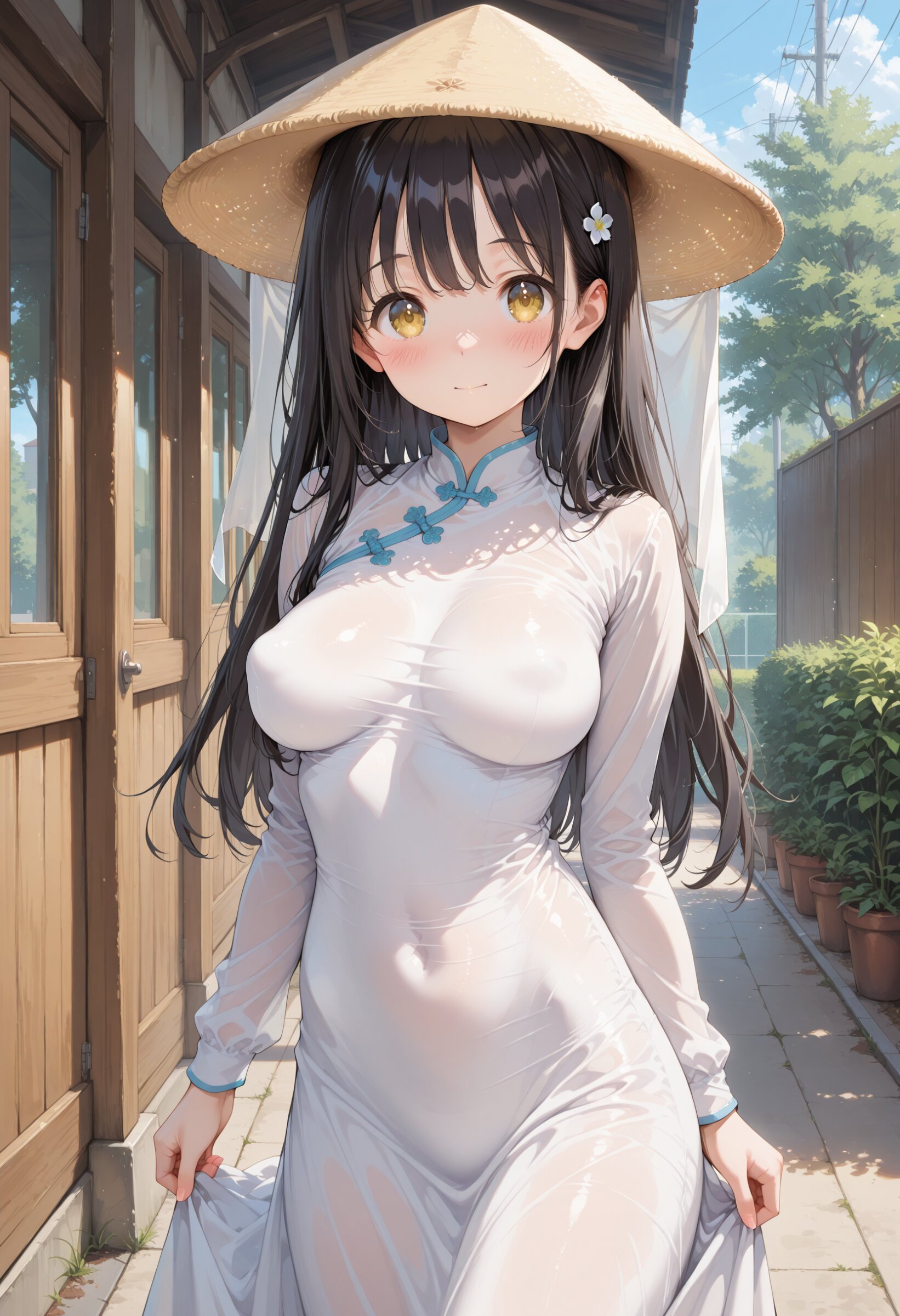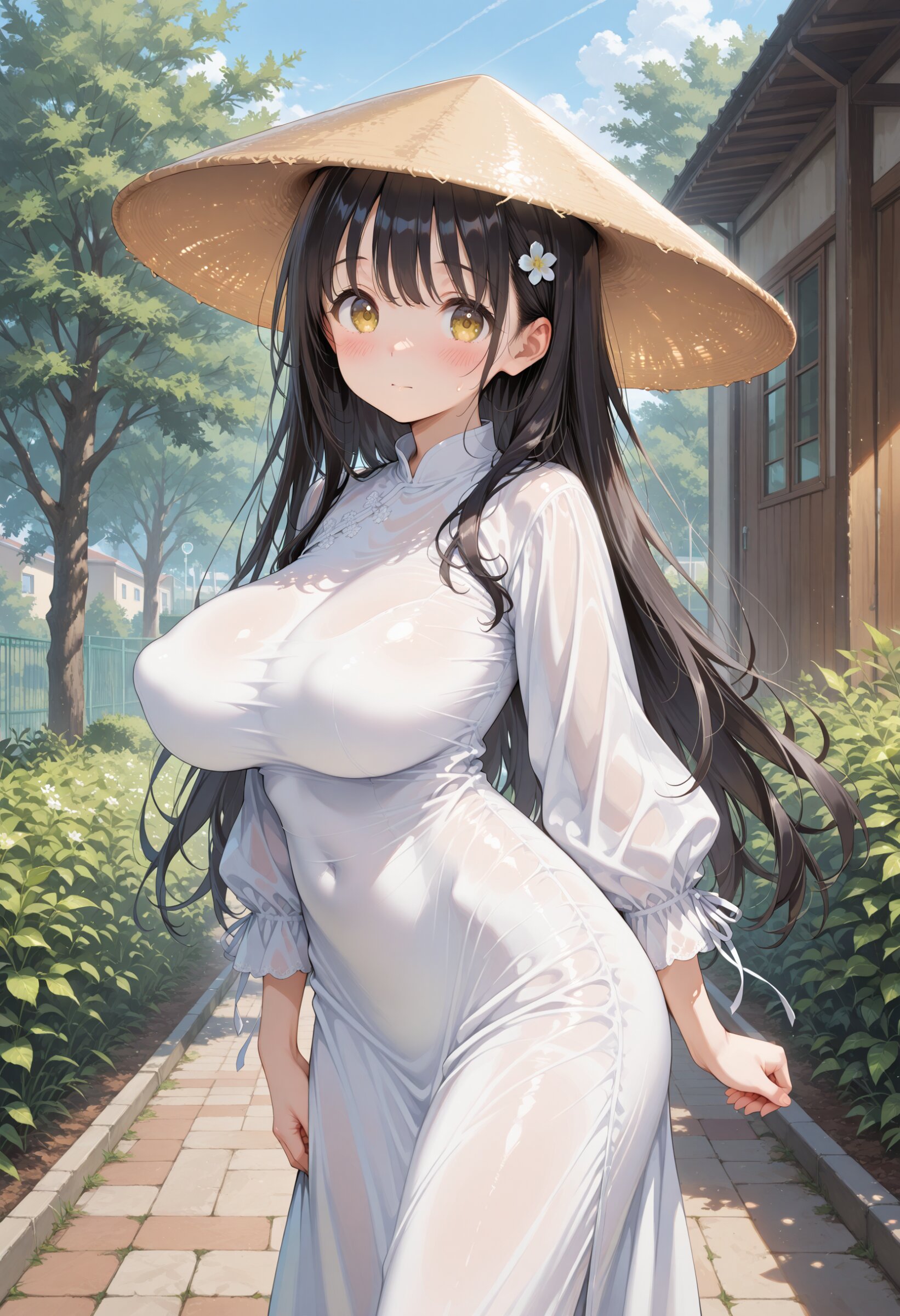 masterpiece, best quality, amazing quality, general, fine detail, official art, 1girl, loli, (petite:1.2) , student, beautiful black hair, long hair, beautiful eyes, (white vietnamese long dress:1.2), vietnamese simple Straw yellow Non La Conical hat, shaped waist, big breasts, impossible clothes, (perky breasts:1.2), fully covered breasts, perfect fit, look at viewer, innocent expression, , school yard, cowboy shot, blush,,,look at viewer,