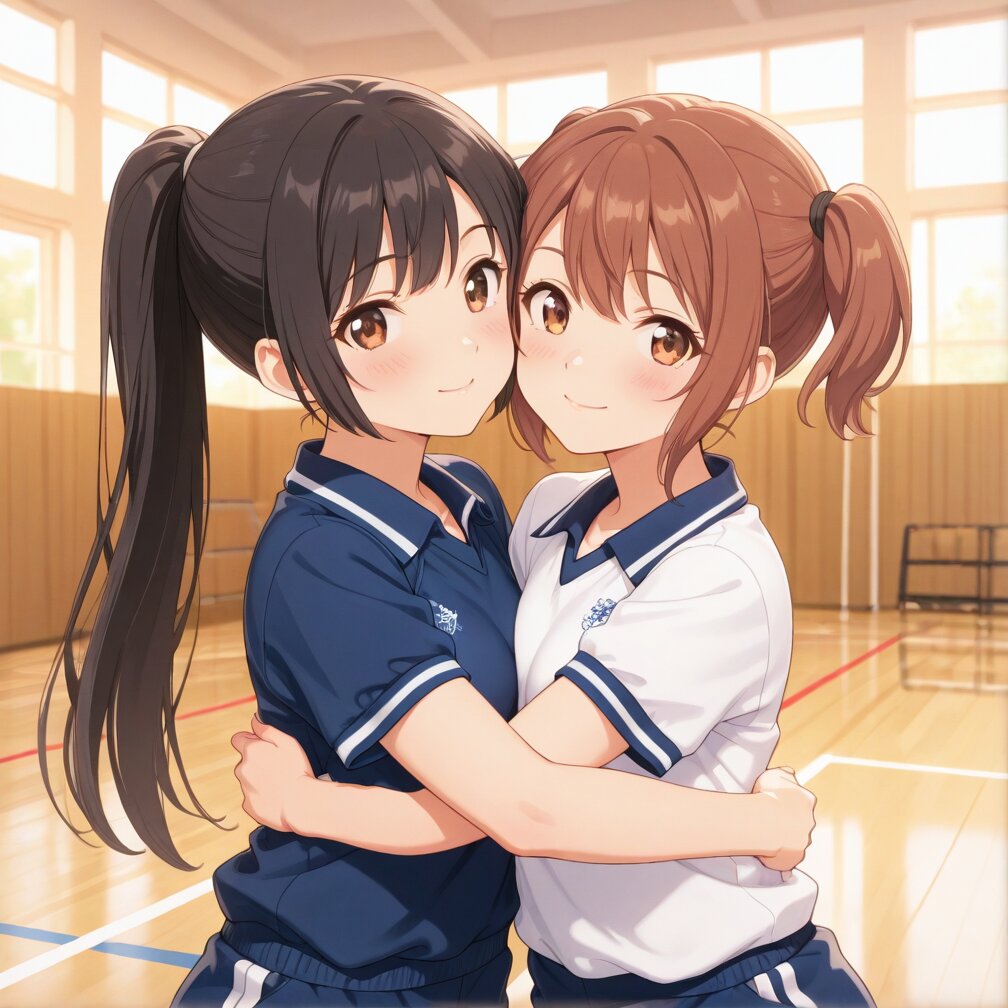 2girls, anime style, gym_uniform, hugging, long_hair, ponytail, black_hair, short_hair, twintails, brown_hair, blush, loving_gaze, indoor, warm_lighting, close-up, vibrant_colors, soft_shading, masterpiece, ultra_detailed