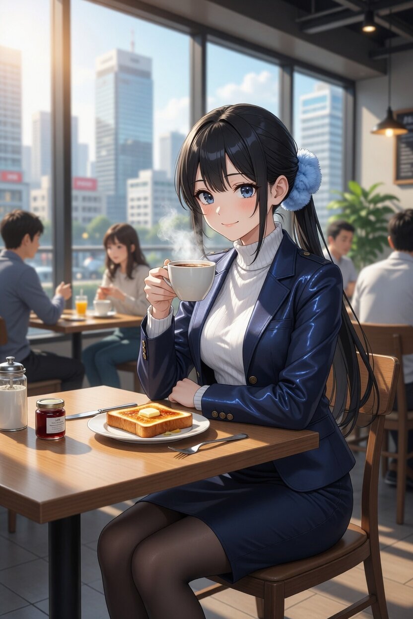 トーストとコーヒーの朝食をとっている日本人女性24歳のイラスト。都心にあるカフェ。シュシュは水色。