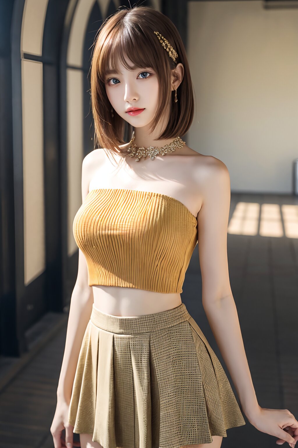 masterpiece, RAW photo, hyper detailed, 16K, extremely detailed CG, Japanese woman, 23yo, ((solo)), BREAK cute, pretty, hyper detailed eye, hyper detailed face, medium hair, bangs, extremely detailed, thin, tall, perfect anatomy, good proportion, extremely detailed body, perfect proportion, BREAK crop top,bare shoulders blouse,check short flare skirt, extremely detailed blouse and skirt, hyper detailed background,