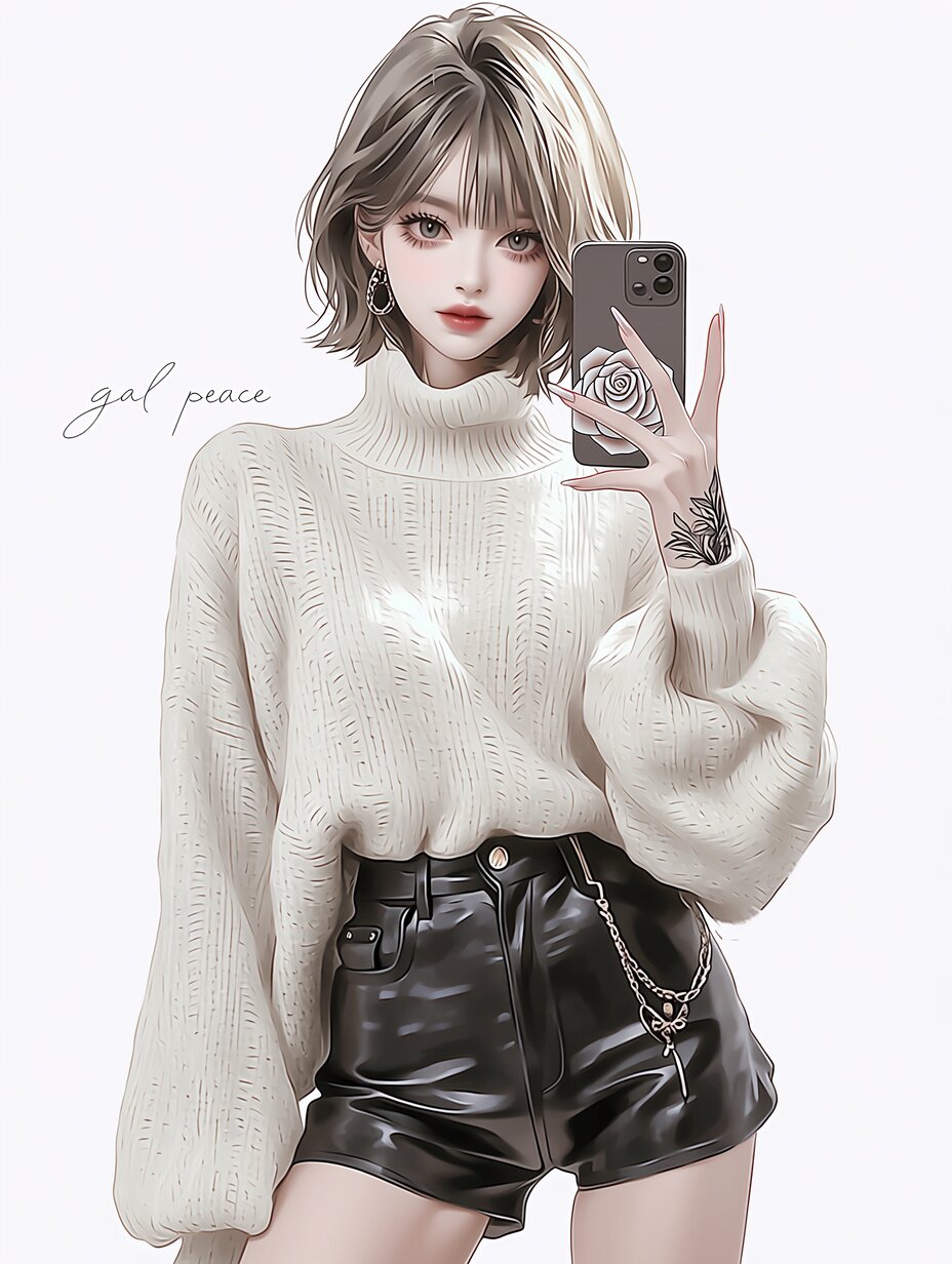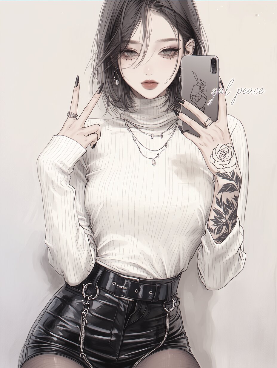 A pretty girl with natural makeup, long eyelashes, a white rose tattoo , wearing a white turtleneck and black leather shorts, taking a selfie with a "gal peace" sign