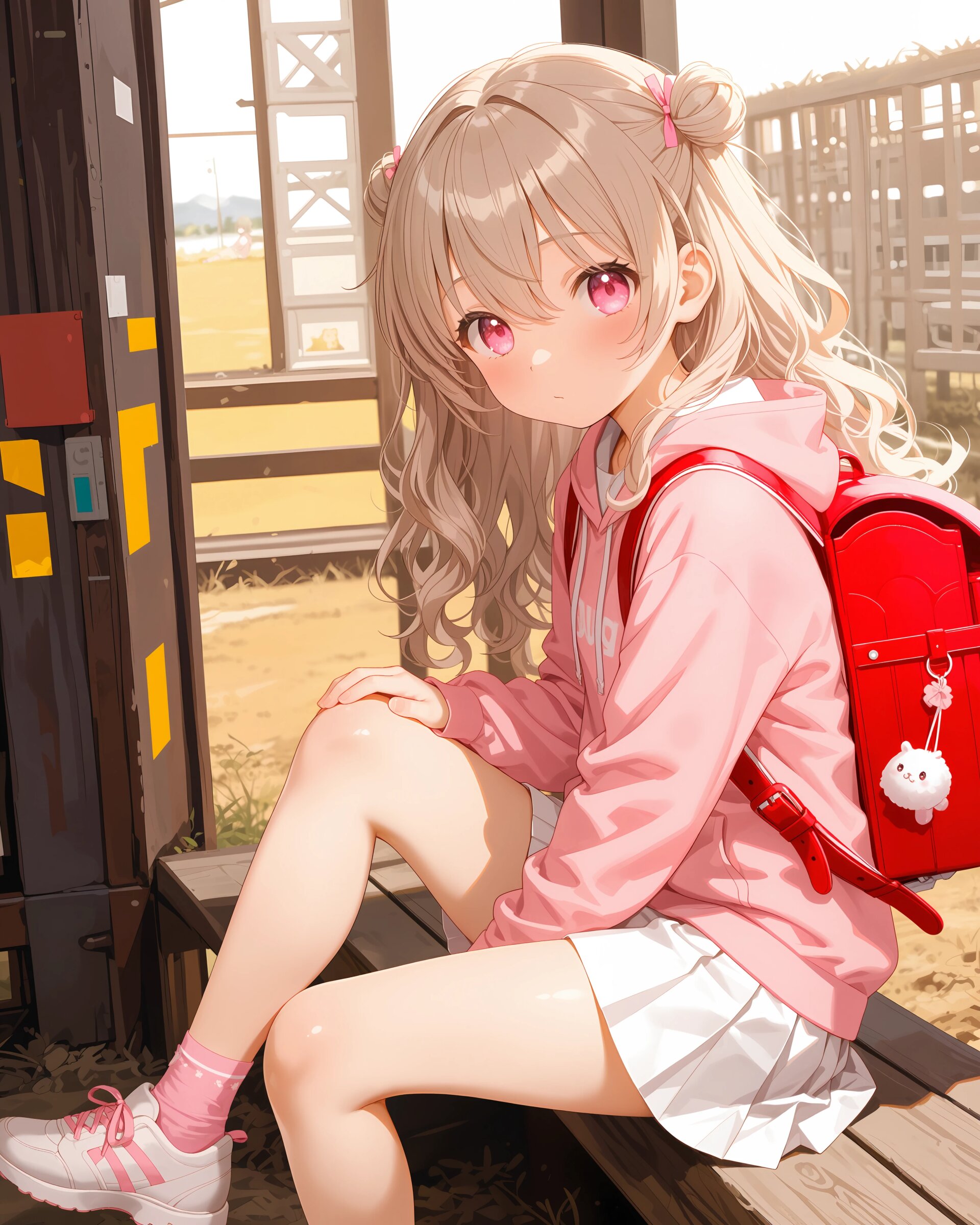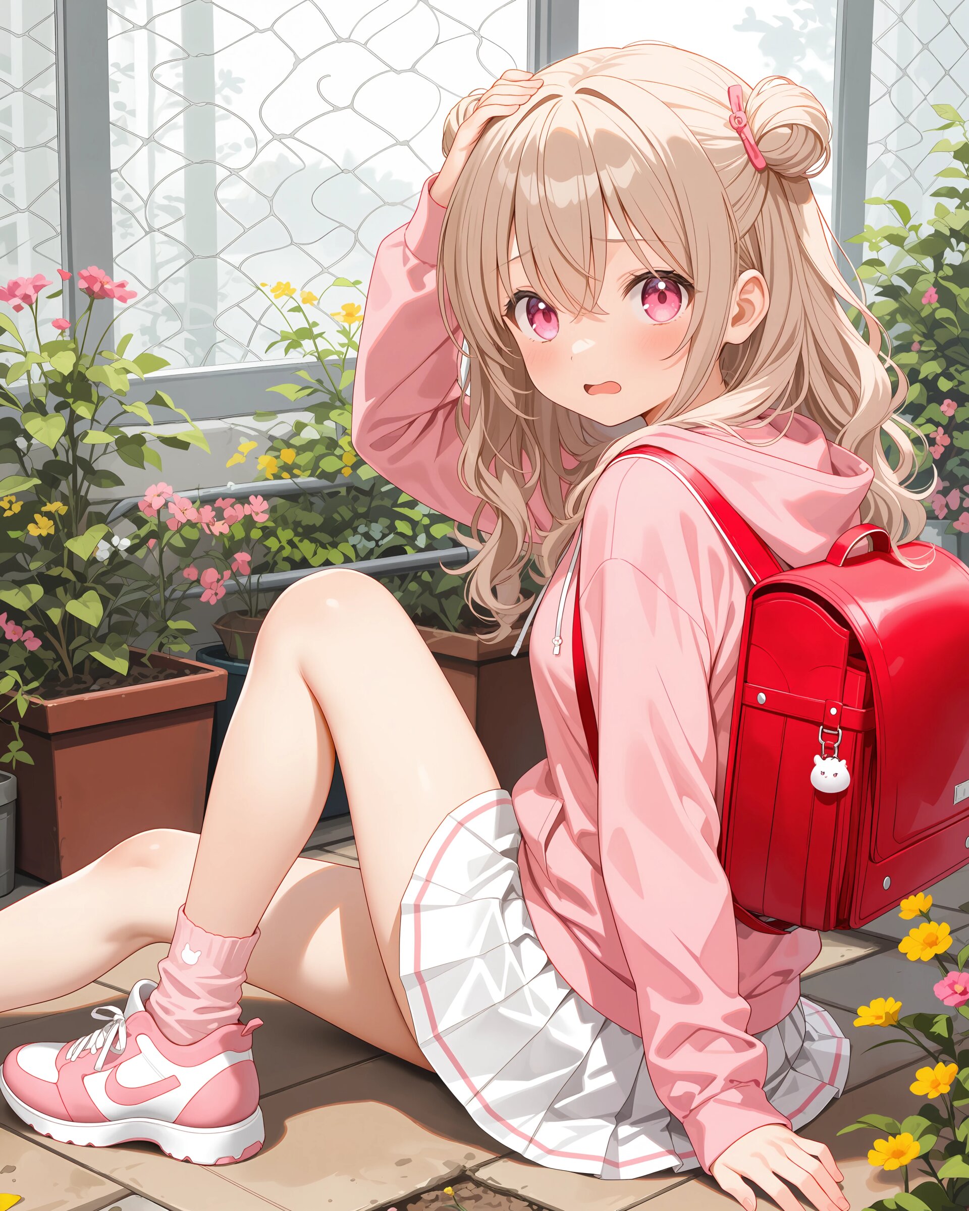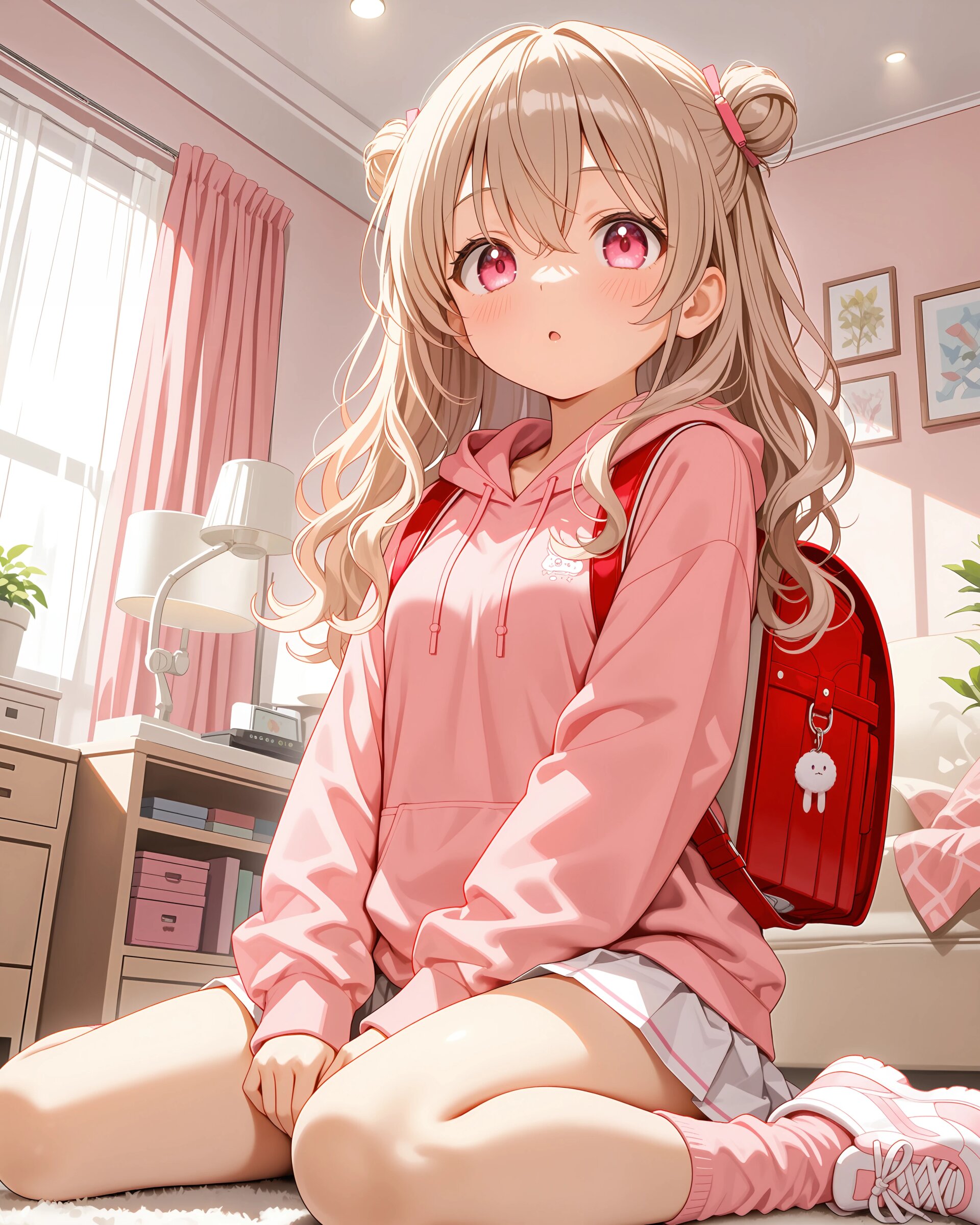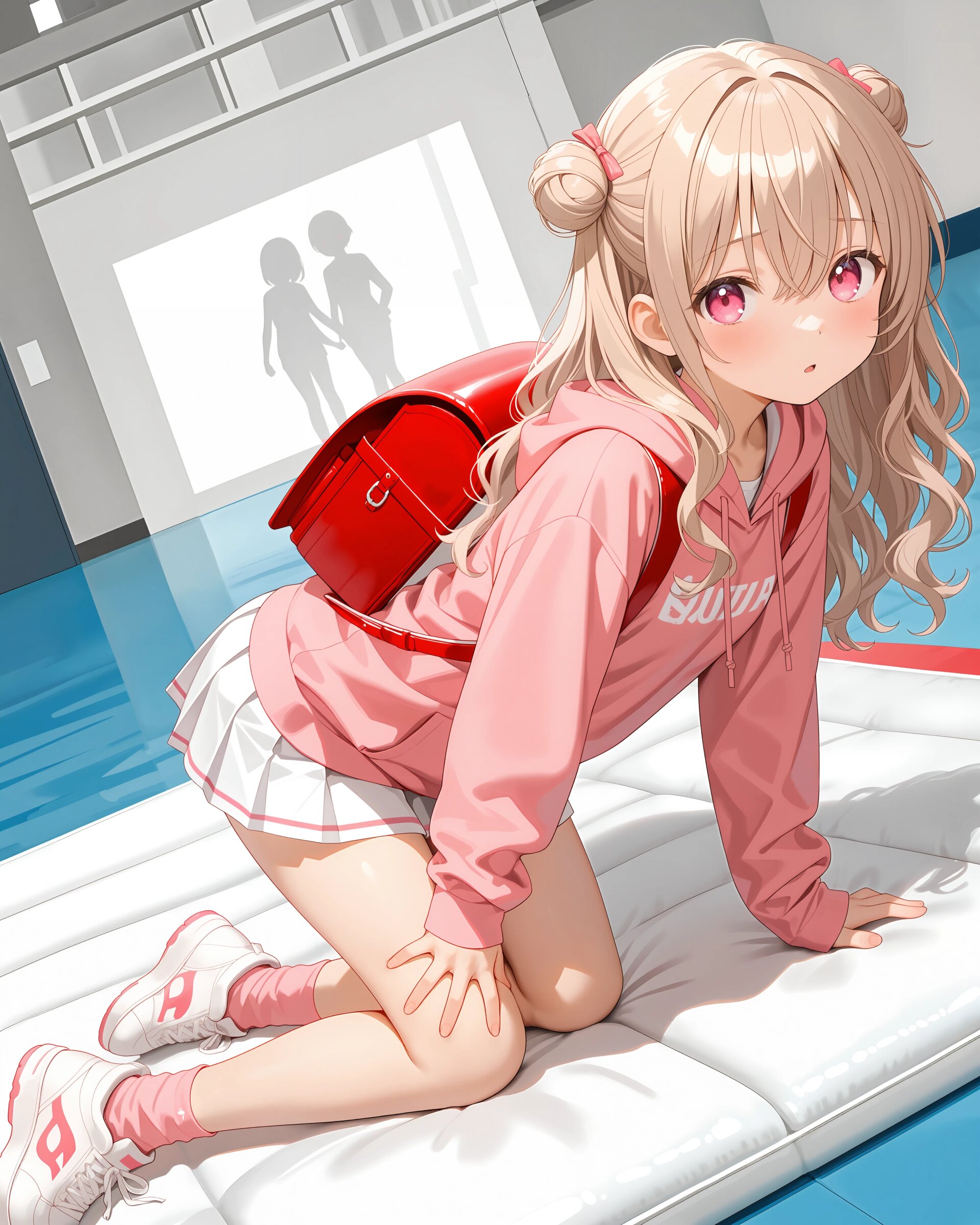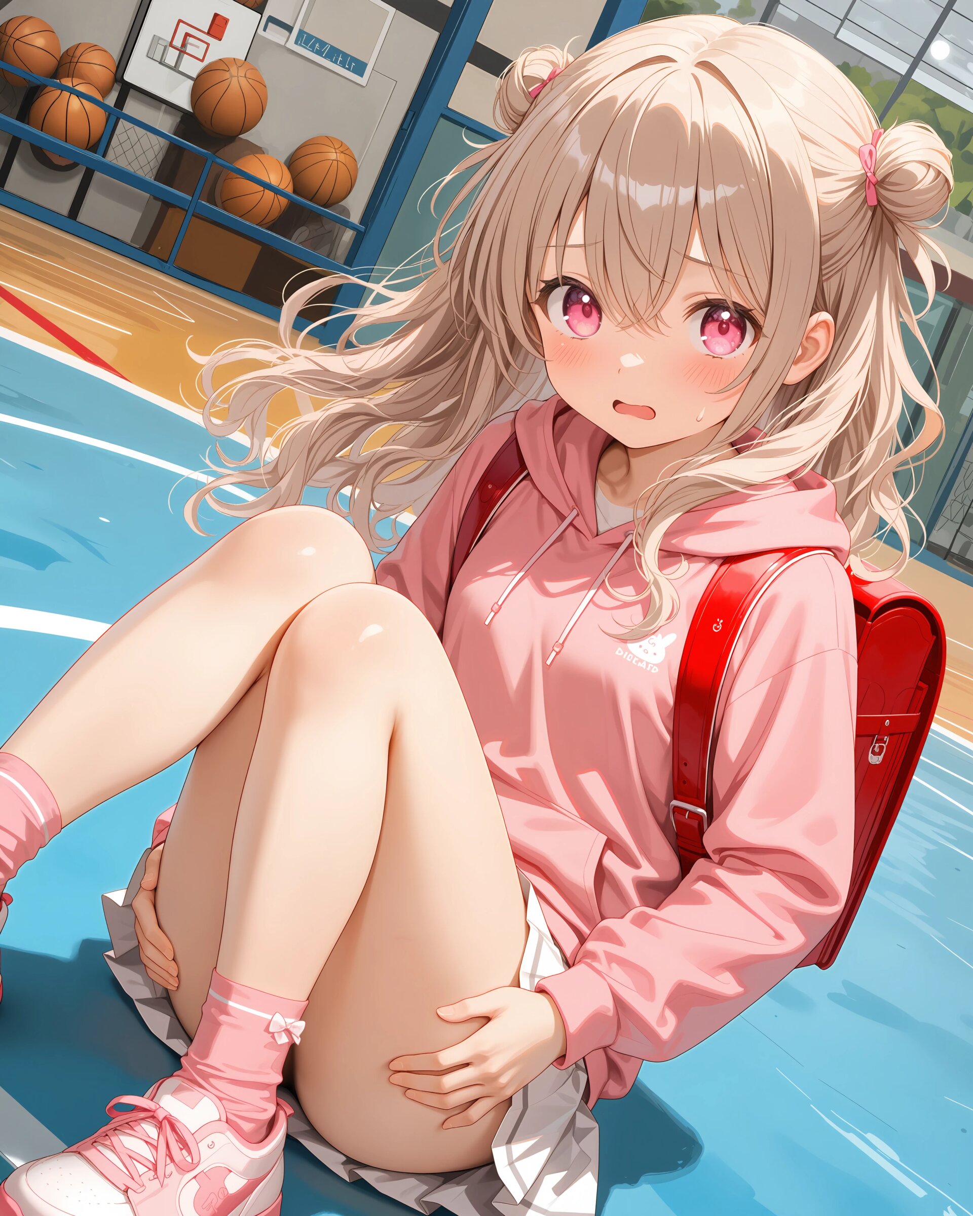 1girl, solo, colorful, looking at viewer, dutch angle, upper body, Basketball court, girls' clothing, ilust printed pink sweatshirt, long sleeves, hoodie, white pleated skirt, pink socks, sneakers, red randoseru, (cute girl, pink eyes, cute eyes, large eyes, pink ribbon, light brown hair, medium long wavy hair, two small buns, bangs between eyes, bobby pin, small breasts), blush, panicking, knees up, hand on own ass, clean lineart clear silhouette, masterpiece, best quality, newest, absurdres, highres, very awa,