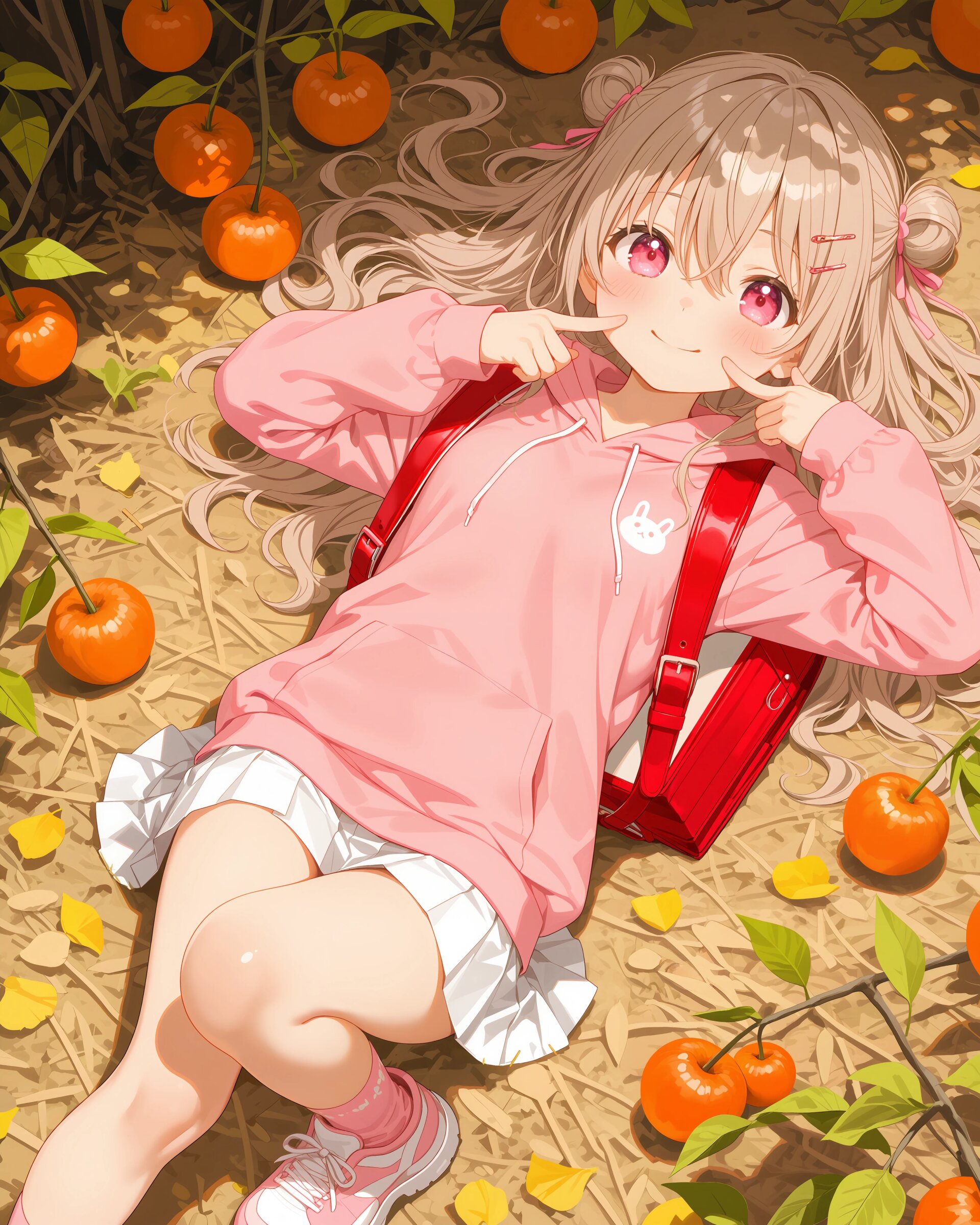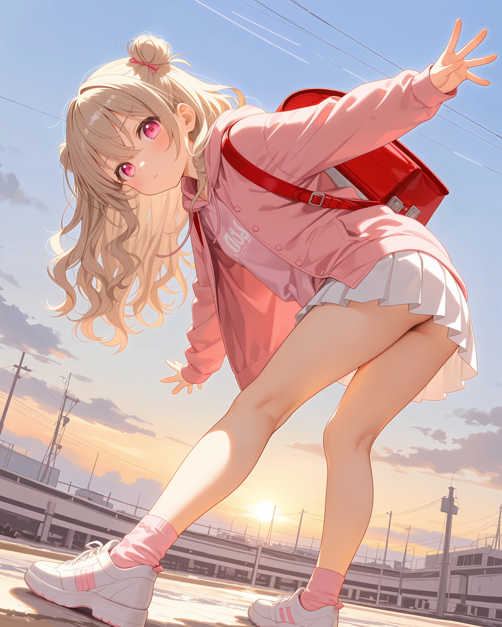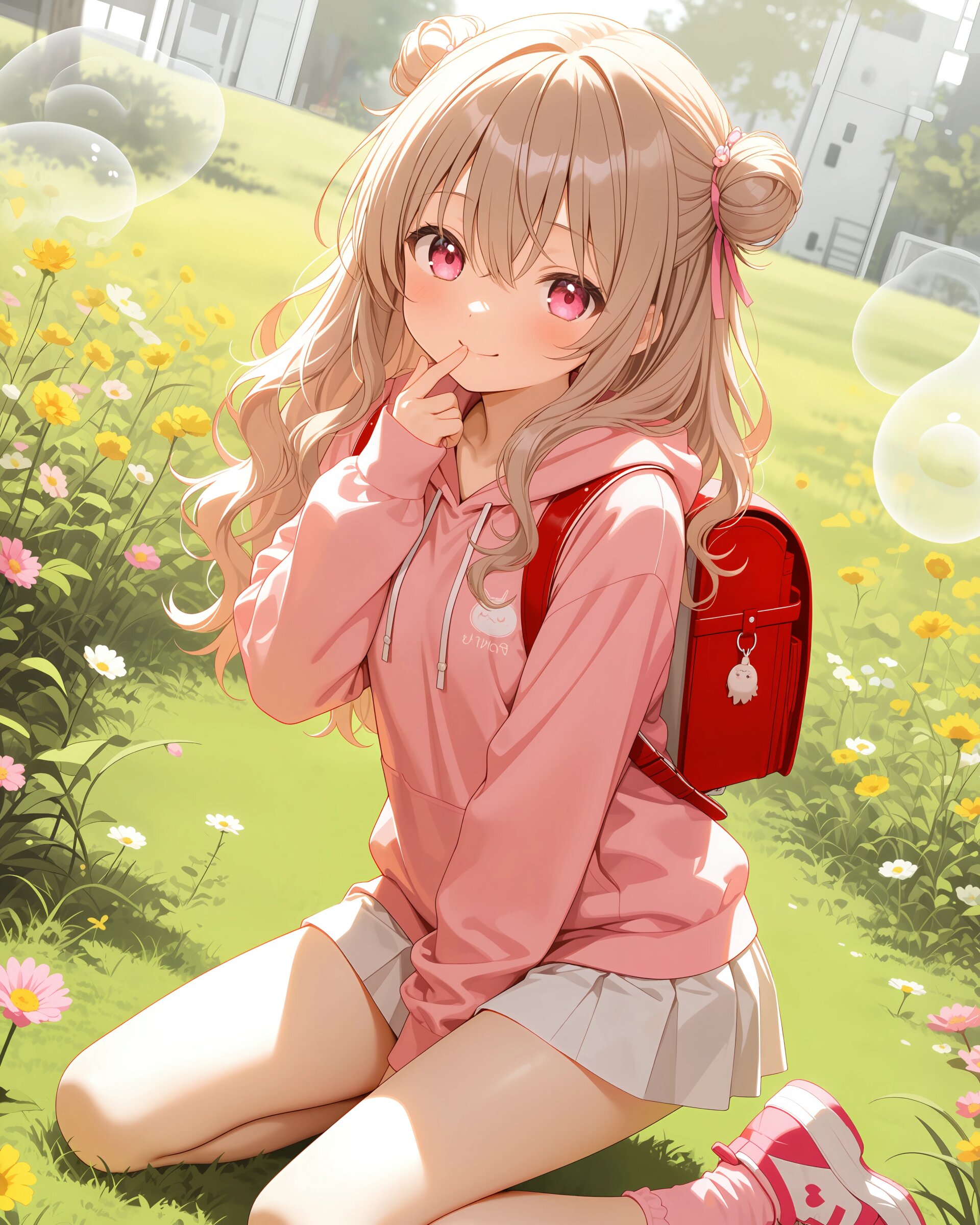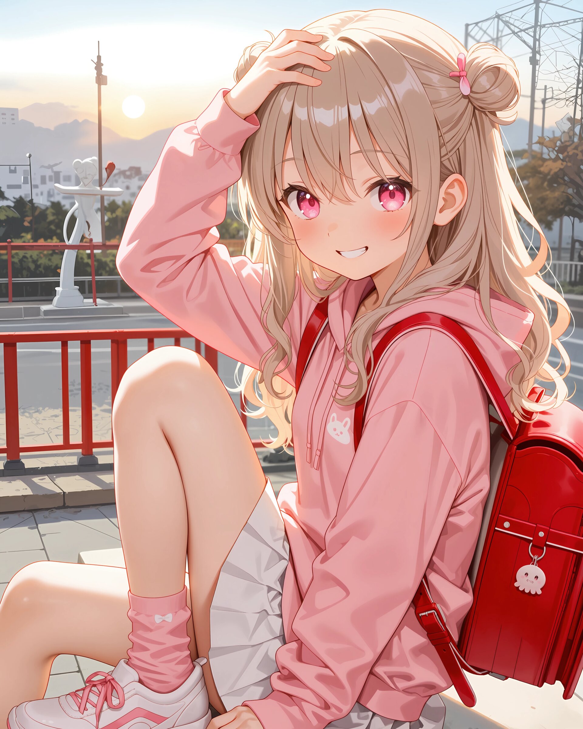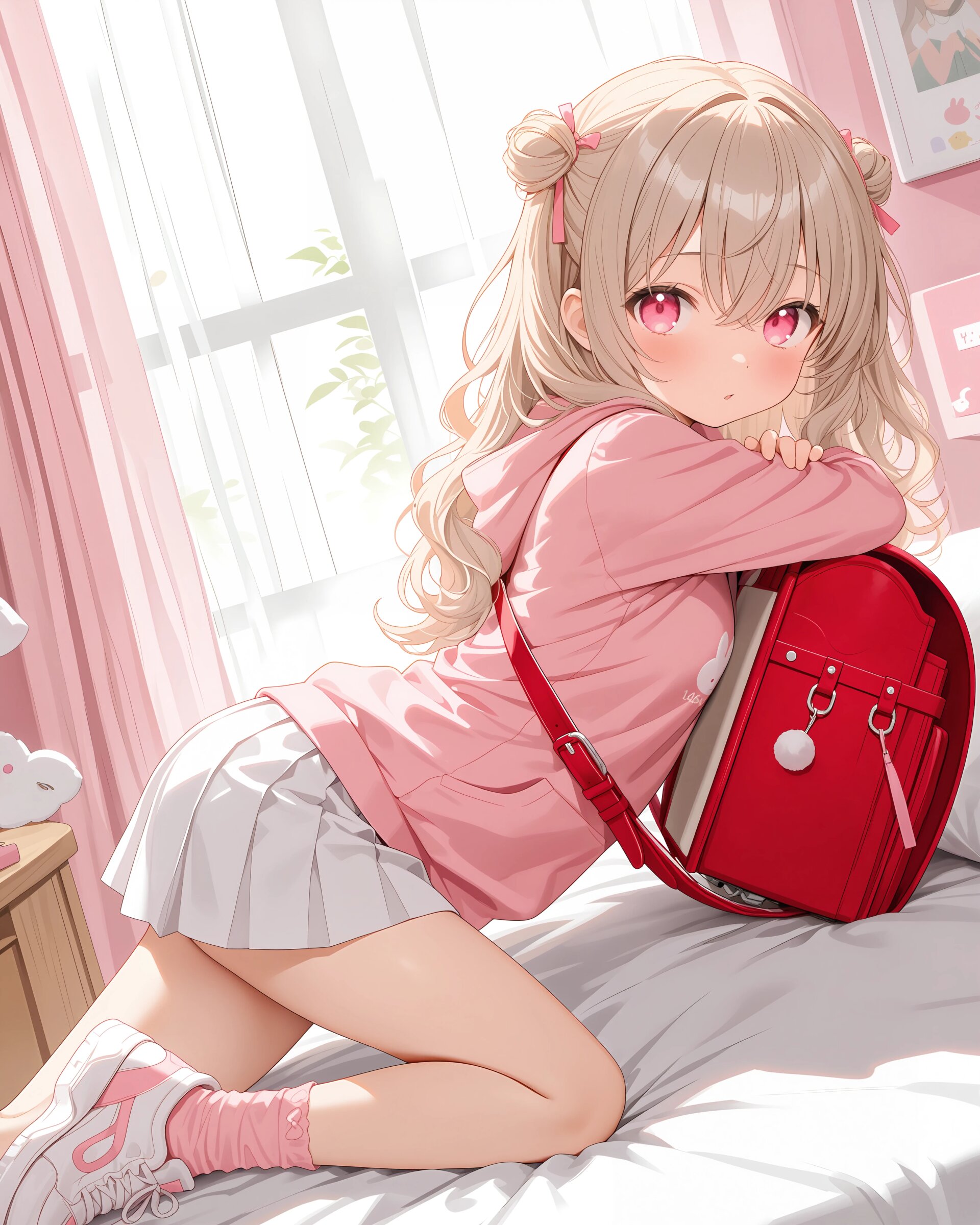 1girl, solo, colorful, looking at viewer, dutch angle, upper body, Basketball court, girls' clothing, ilust printed pink sweatshirt, long sleeves, hoodie, white pleated skirt, pink socks, sneakers, red randoseru, (cute girl, pink eyes, cute eyes, large eyes, pink ribbon, light brown hair, medium long wavy hair, two small buns, bangs between eyes, bobby pin, small breasts), blush, panicking, knees up, hand on own ass, clean lineart clear silhouette, masterpiece, best quality, newest, absurdres, highres, very awa,