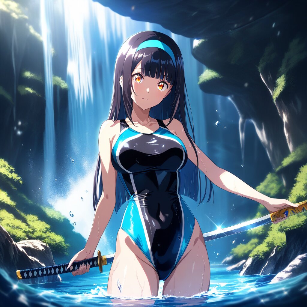 ((masterpiece)), ((best quality)), (ultra-detailed),anime style,cowboy shot, waterfall,partially submerged,underground, a cute girl, 1girl, large bust, ((Black Racing-style swimsuit)), beautiful black hair, beautiful orange eyes, ((beautiful eyes)),straight hair, (blunt hair), ((blue hairband)), Holding a weapon in hand, gripping katana,wet skin, glistening surface, soft shine, water droplets on skin,scared