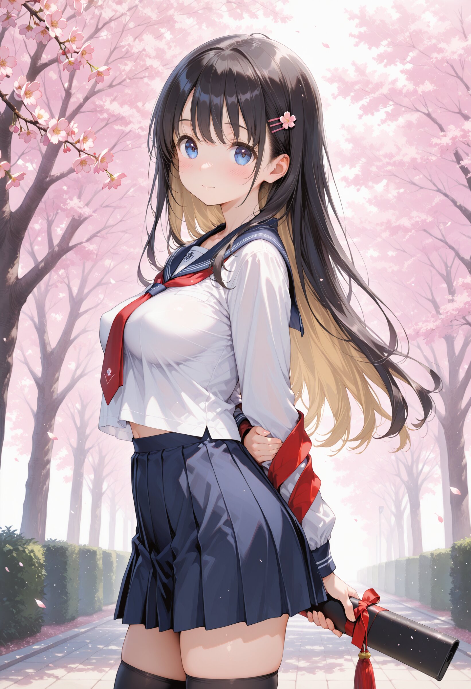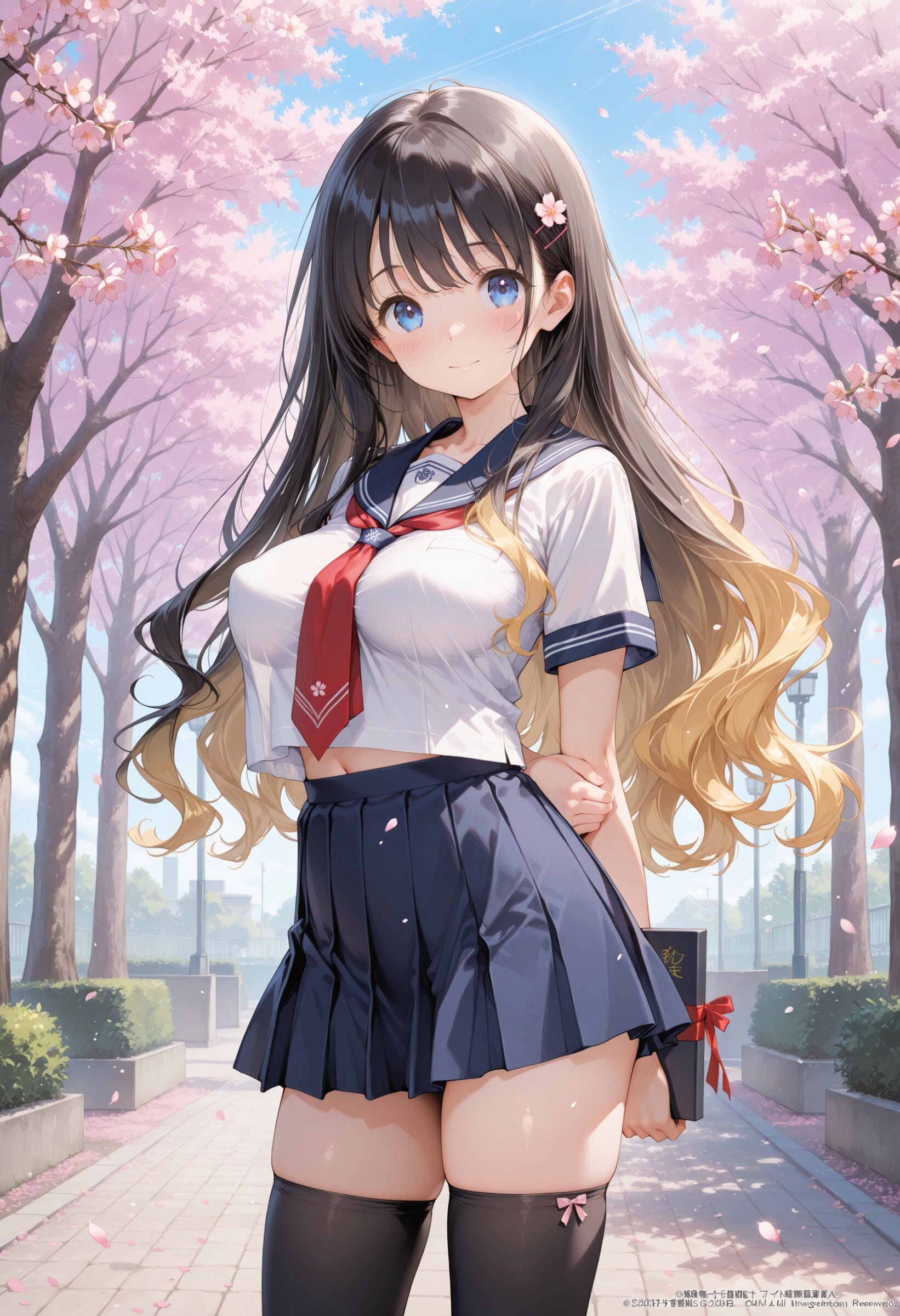 masterpiece, best quality, amazing quality, general, fine detail, official art, 1girl, loli, petite, high-school student, blonde wavy long hair, blue eyes, , (sailor collar), (white shirt), (red tie), (miniskirt), big breasts, black hair, impossible clothes, (perky breasts:1.2),Cherry blossoms, innocent expression, cowboy shot, , slim hip, black thighhighs, Graduation ceremony, graduation season,