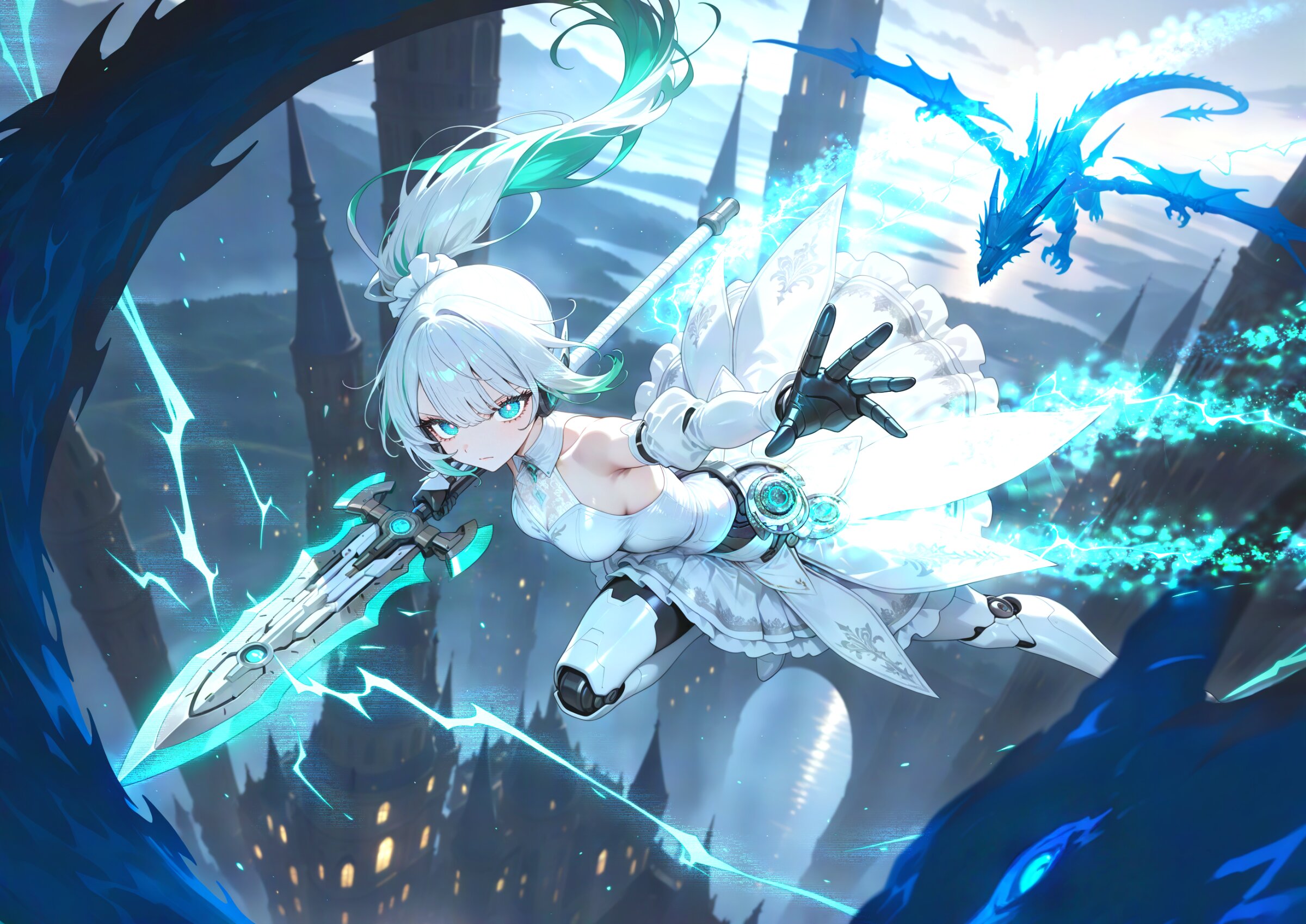 1girl, huge cool ootachi, (weapon focus:1.1) in hands, holding huge cool weapon mechanism, machine, (high angle shot:1.1) (25 years old:1.0), (medium breasts:1.2), (two-tone hair, grey and ever green hair, shoulder length hair, high side ponytail medium bangs:1.0), (beautiful face:1.1), (clear white small eyes:1.0), green pupils , fighting stance, falling, midair, flying, reaching, (mechanical black hands:1.0), black robot ears, , (mechanical white legs:1.1), white mechanical thighs, neon trim, medieval times fantasy world, (cybernetic gynoid:1.0), (mech suit:1.0), (white gothic cuirass:1.0), (robot joints:1.0), (white gorgeous modest wizard's dress skirt:1.1), , glossy silver body with metallic luster cyborg, bare shoulders, (Decorative embroidery:1.0), (white gorgeous dress:1.1), (overskirt:1.0), (white sleeve:1.2), electrokinesis, (battle:1.2), duel , (looking at viewer:1.0), from side, turning head (huge analogous colors aquamarine silhouette of dragon,serious monster silhouette:1.2), Majestic Scottish landscapes with rugged mountains, lakes, and mystical mists., blurry background, super fine concept art, hard surface, 8K, masterpiece, best quality, amazing quality, very aesthetic, absurdres, professional art lots of details, , overexposure, shiny-glistening, (watercolor style:1.0), (pastel color style:0.5) 4ur4_illu,shiny, glowing, glowing particles, glowing light particles, light particles, <lora:noline (1):1.0> <lora:sdxl2-flat2-512b:0.2> <lora:facelightup_xl_v10:0.5> <lora:V2_yakumo_alchemy:0.5> <lora:Aura_illu:0.1>