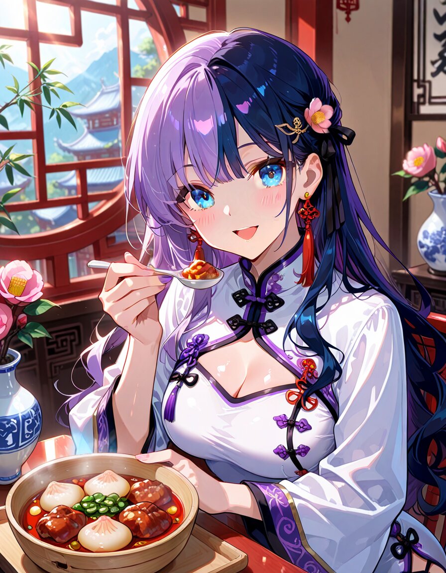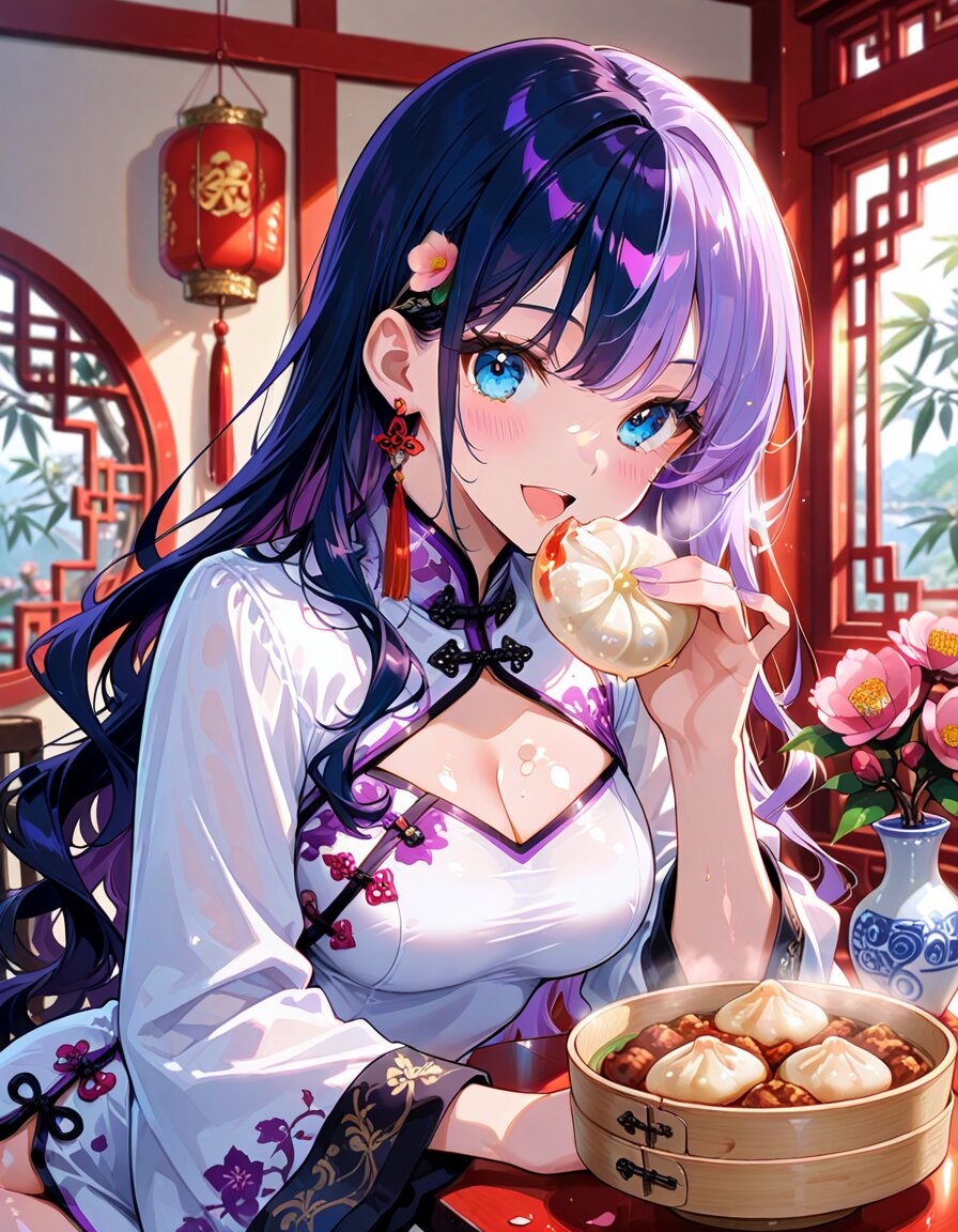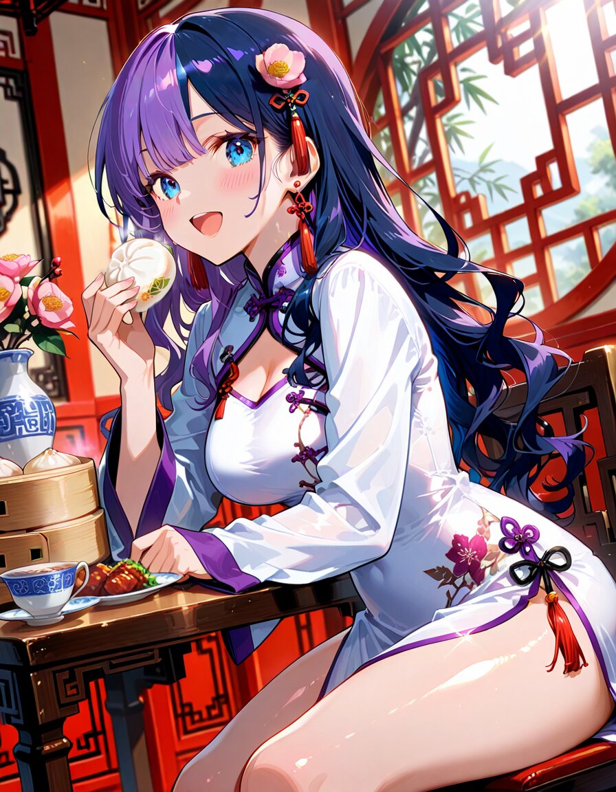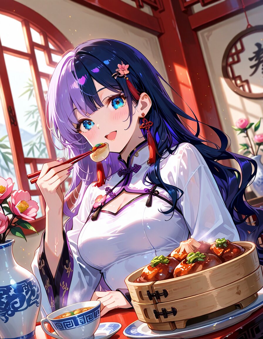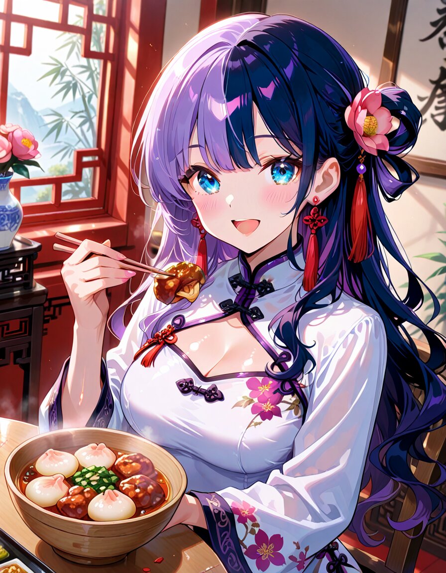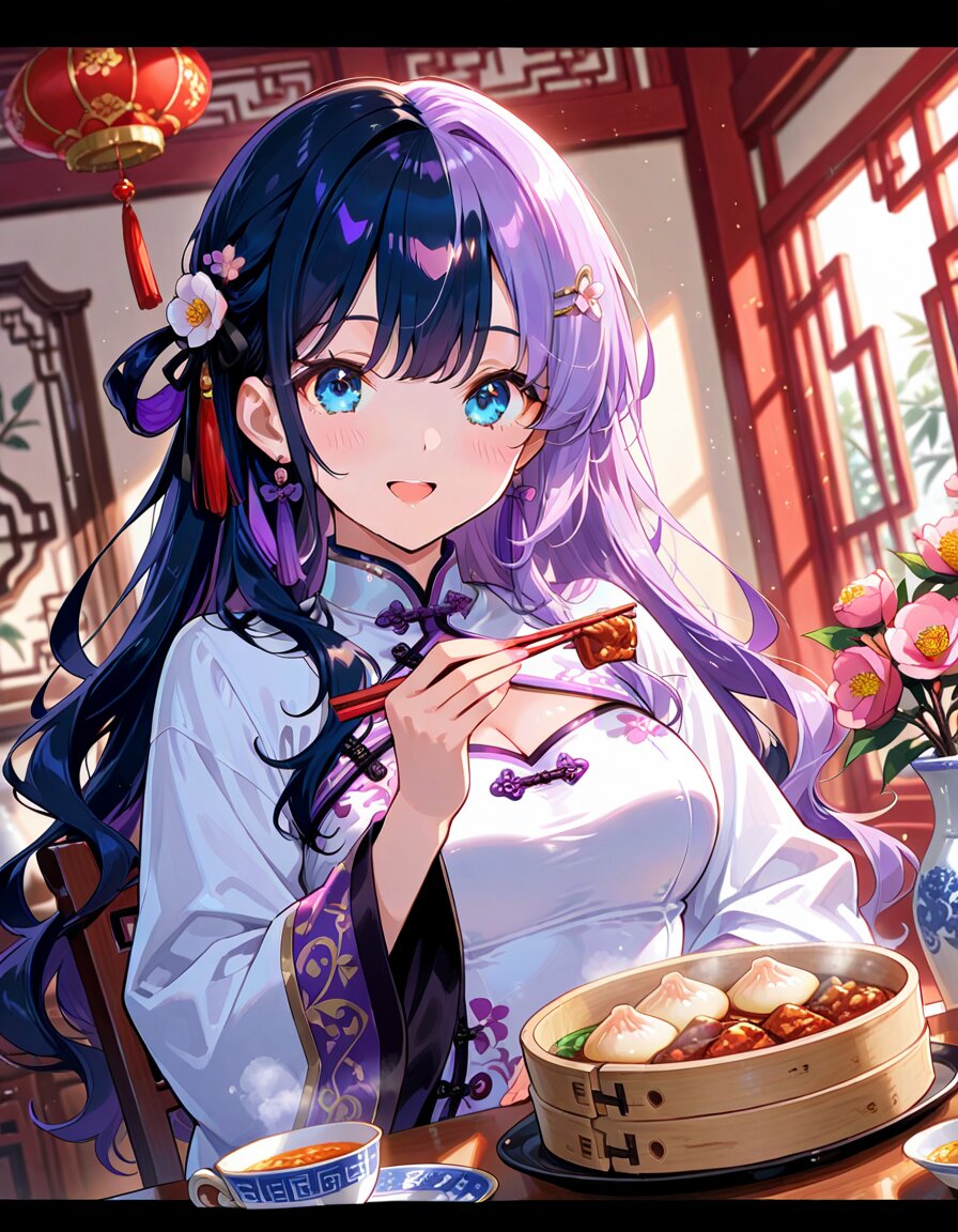 1girl, solo, dynamic pose, dynamic angle, looking at viewer, sitting, upper body, hands on table, eating, food, plate, bowl, meatballs, dumplings, dim sum, bamboo steamer, teacup, blue and white porcelain, indoors, chinese lattice window, vase, pink flower, camellia, table, sunlight, soft lighting, detailed background, depth of field, cinematic lighting, masterpiece, high score, great score, absurdres, BREAK ((split-color hair:1.3), ((purple hair:1.2), (dark blue hair:1.2)):1.3), (two-tone hair:1.2), (long hair:1.2), (long wavy hair:1.3), bangs, (white hair:-1), (pink hair:-1), hair ornament, white flower, hairpin, earrings, tassel earrings, red tassel, (blue eyes:1.2), (purple eyes:-1), japanese_girl, (medium breasts:1.3), (curvy:1.3), cleavage, (voluptuous:1.2), (shiny skin, gleaming skin:1.4), smile, open mouth, blush, BREAK (chinese clothes, cheongsam:1.2), (wide sleeves, long sleeves), (white dress:1.3), purple accents, black ribbon, frog button, ((8k, masterpiece ,best quality ,ultra-detailed)), game cg, masterpiece, year 2025, newest, (perfect face:1.1025), (perfect arms:1.1025), (perfect legs:1.1025), (perfect hands:1.1025), (perfect fingers:1.1025), <lora:xl_more_art-full_v1:0.6> <lora:add-detail-xl:1> <lora:Fixhands_anime_bdsqlsz_V1:1>