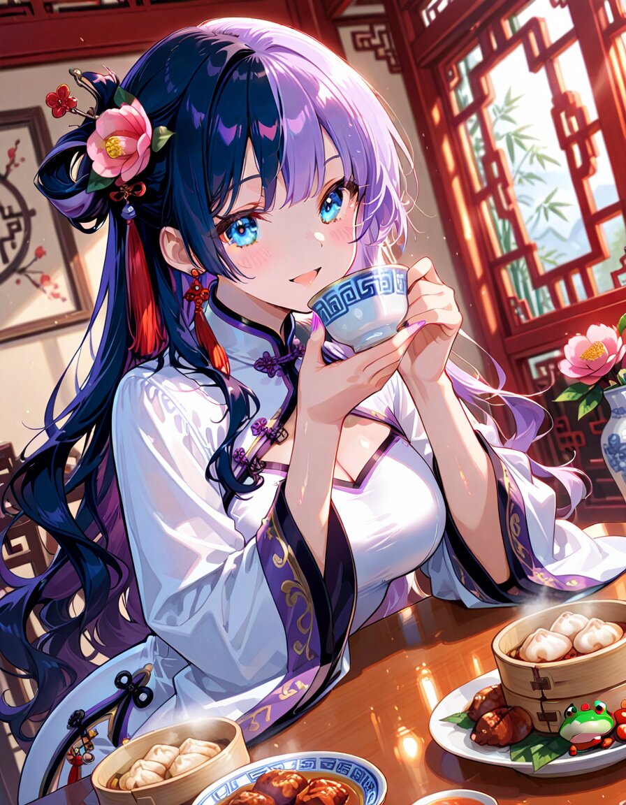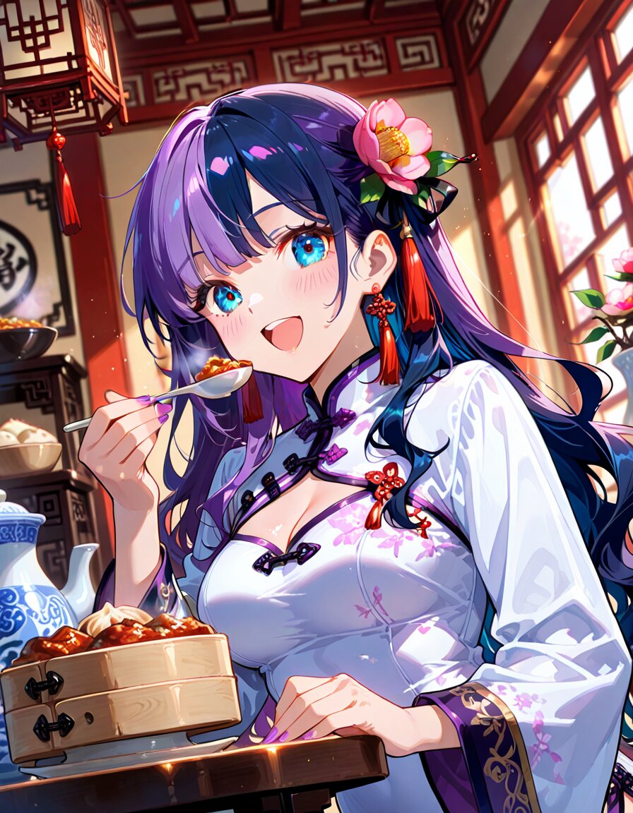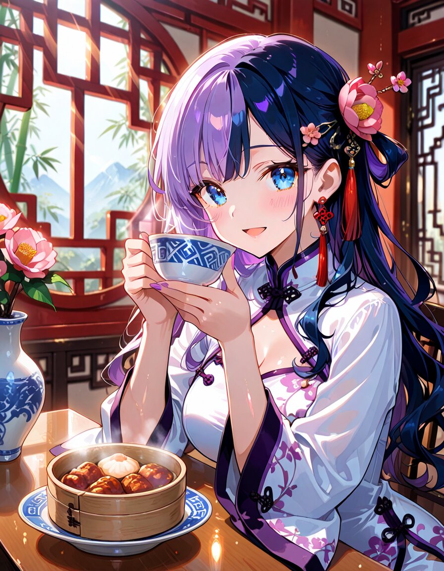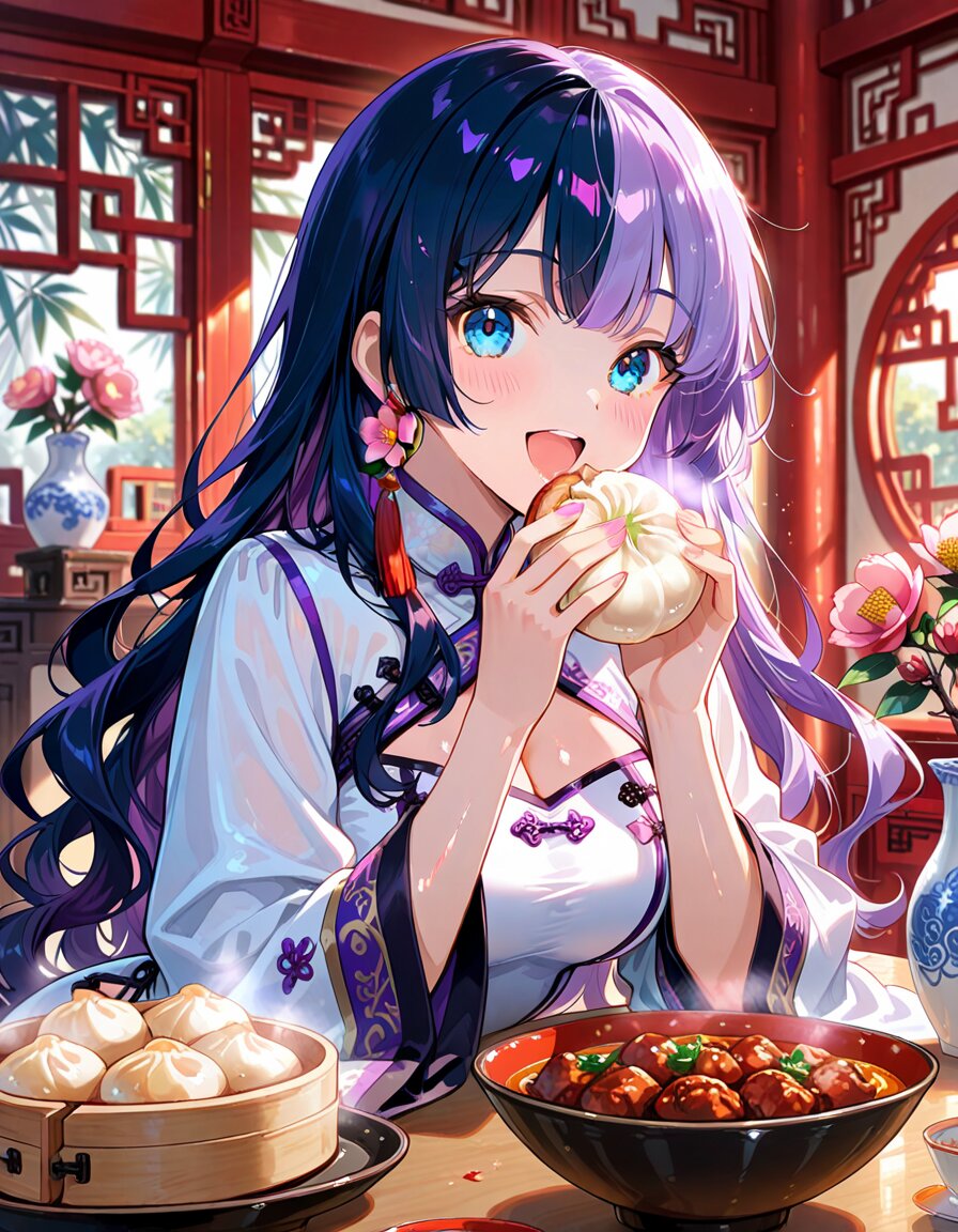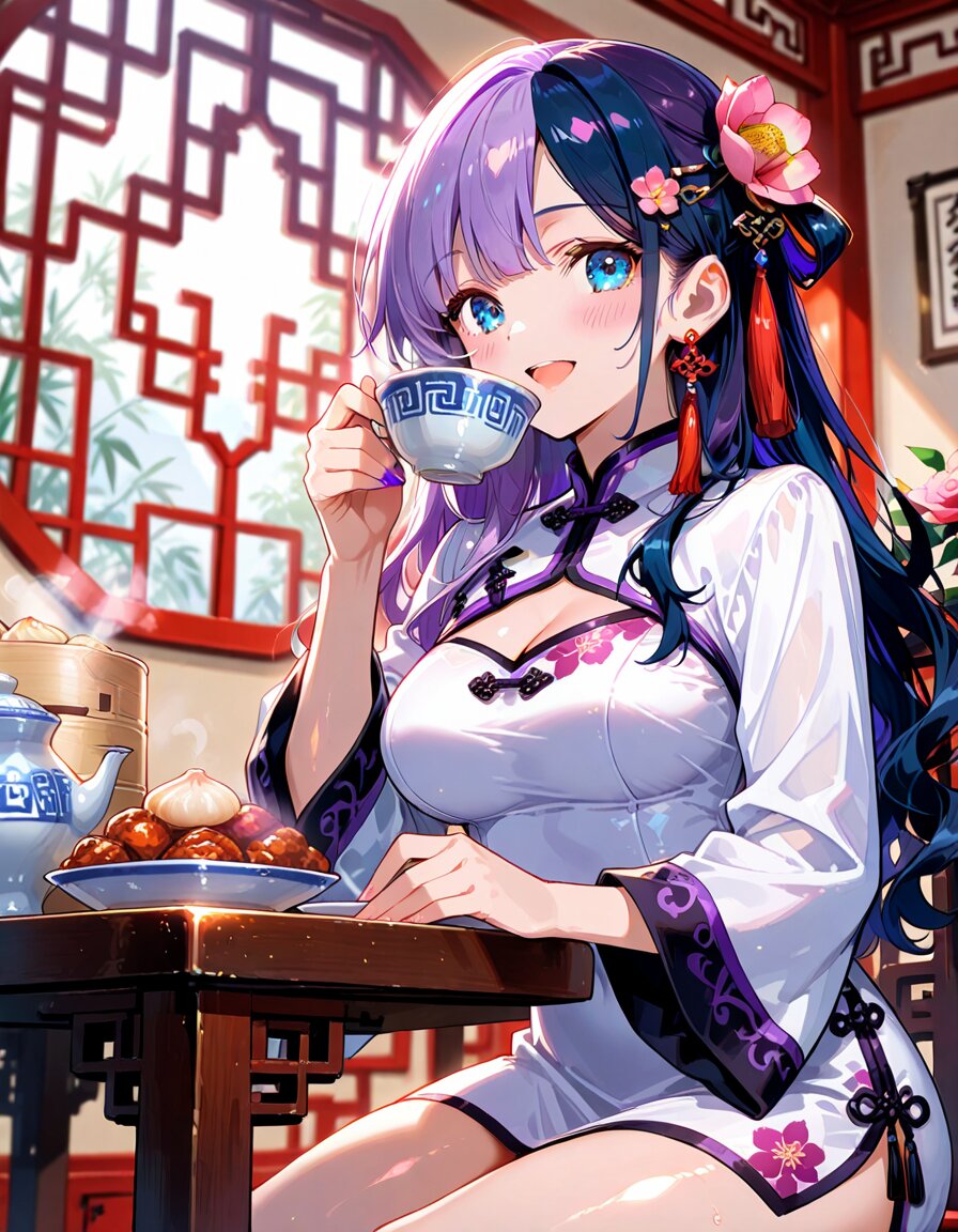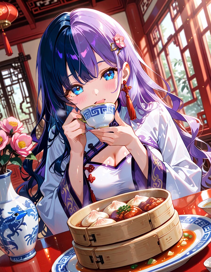1girl, solo, dynamic pose, dynamic angle, looking at viewer, sitting, upper body, hands on table, eating, food, plate, bowl, meatballs, dumplings, dim sum, bamboo steamer, teacup, blue and white porcelain, indoors, chinese lattice window, vase, pink flower, camellia, table, sunlight, soft lighting, detailed background, depth of field, cinematic lighting, masterpiece, high score, great score, absurdres, BREAK ((split-color hair:1.3), ((purple hair:1.2), (dark blue hair:1.2)):1.3), (two-tone hair:1.2), (long hair:1.2), (long wavy hair:1.3), bangs, (white hair:-1), (pink hair:-1), hair ornament, white flower, hairpin, earrings, tassel earrings, red tassel, (blue eyes:1.2), (purple eyes:-1), japanese_girl, (medium breasts:1.3), (curvy:1.3), cleavage, (voluptuous:1.2), (shiny skin, gleaming skin:1.4), smile, open mouth, blush, BREAK (chinese clothes, cheongsam:1.2), (wide sleeves, long sleeves), (white dress:1.3), purple accents, black ribbon, frog button, ((8k, masterpiece ,best quality ,ultra-detailed)), game cg, masterpiece, year 2025, newest, (perfect face:1.1025), (perfect arms:1.1025), (perfect legs:1.1025), (perfect hands:1.1025), (perfect fingers:1.1025), <lora:xl_more_art-full_v1:0.6> <lora:add-detail-xl:1> <lora:Fixhands_anime_bdsqlsz_V1:1>