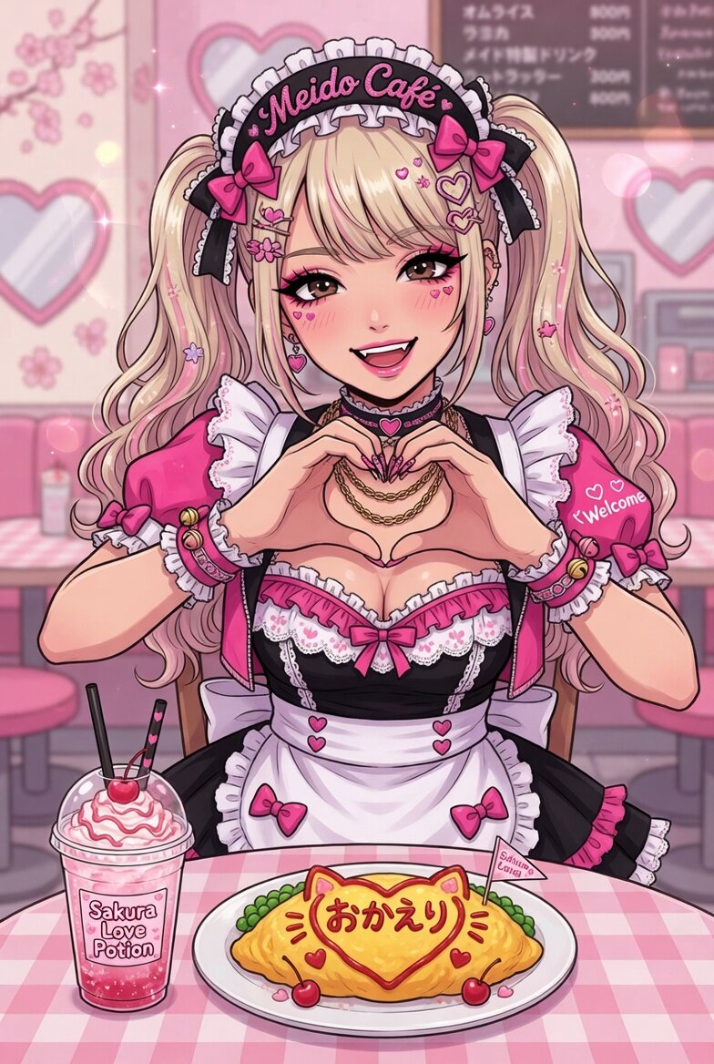 メイド喫茶のメイドである女性のデジタルイラスト。blonde hair, long hair, brown eyes, ギャル風ファッション。オムライスと、桜色のドリンクを前に、ハートハンドのポーズ。歓迎の笑顔。