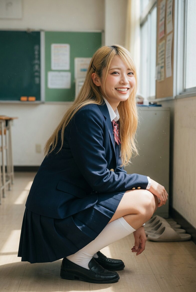 日本人女性20歳のリアルなフォト。カメラマンが撮影したような仕上がり。blonde hair, long hair, brown eyes,高校のブレザーの制服を着ている。足をそろえてしゃがんでいる。側面からの構図。室内の自然光。視線は撮影者に向けていて笑顔。