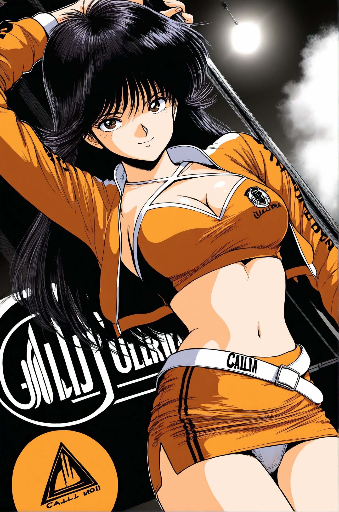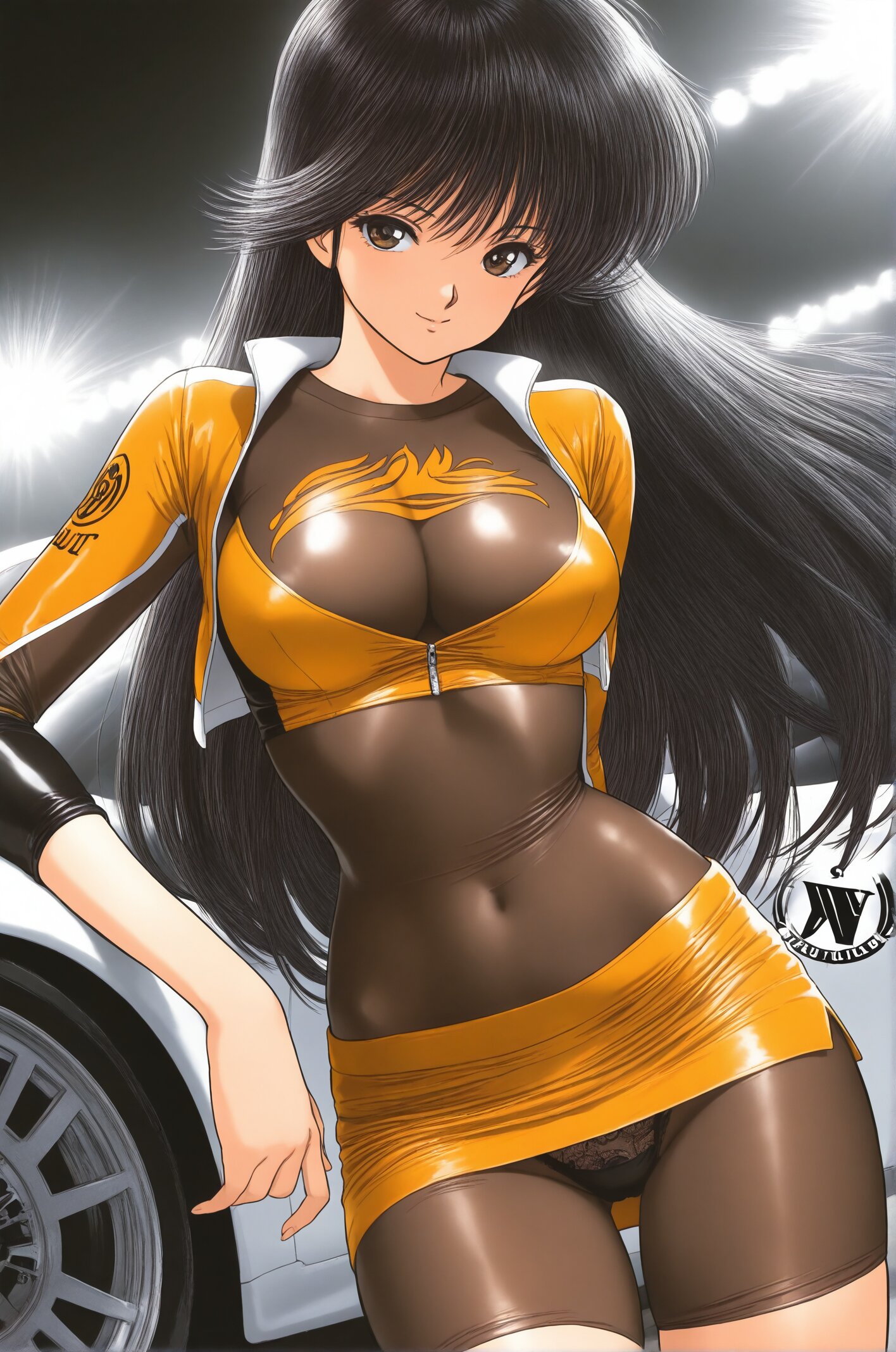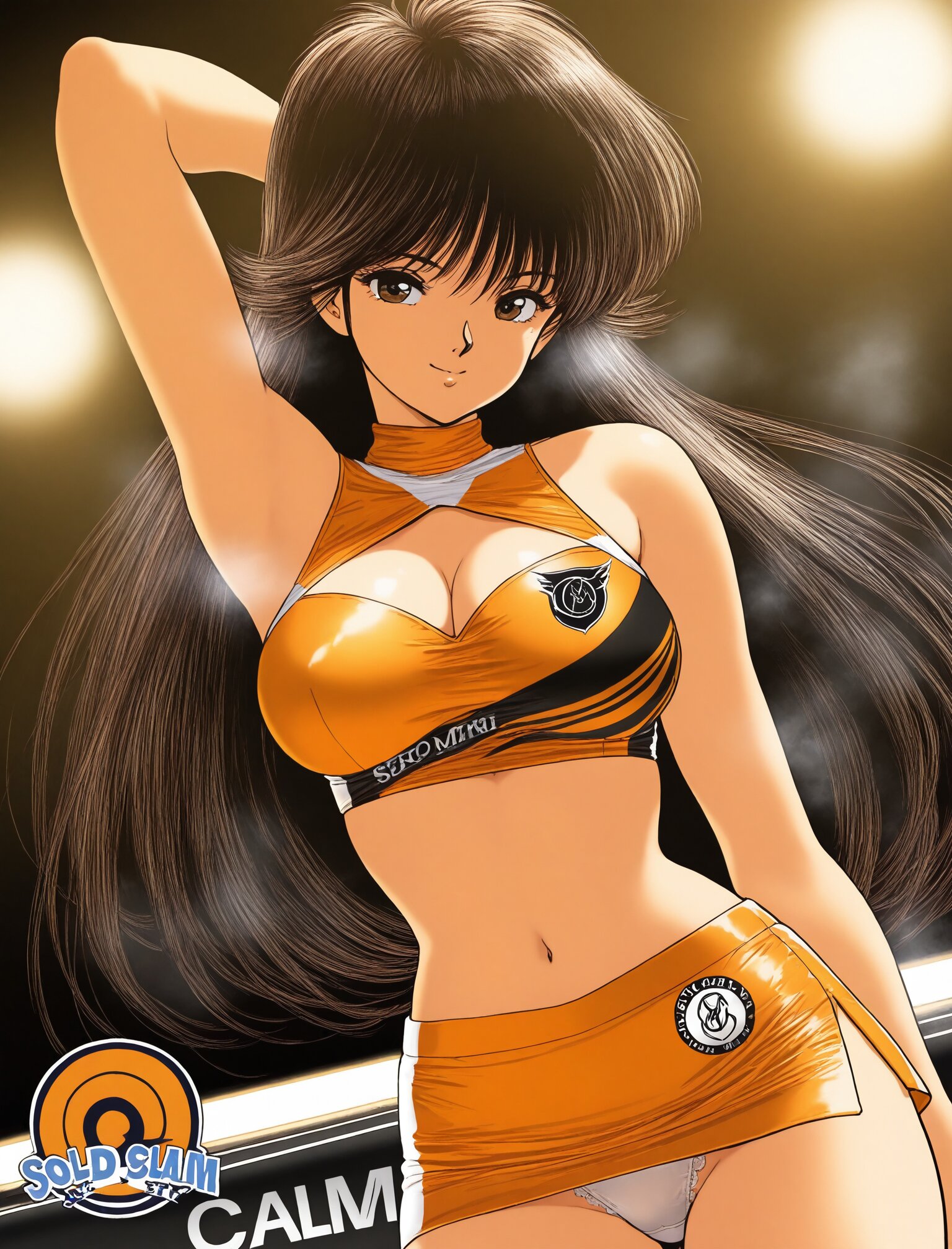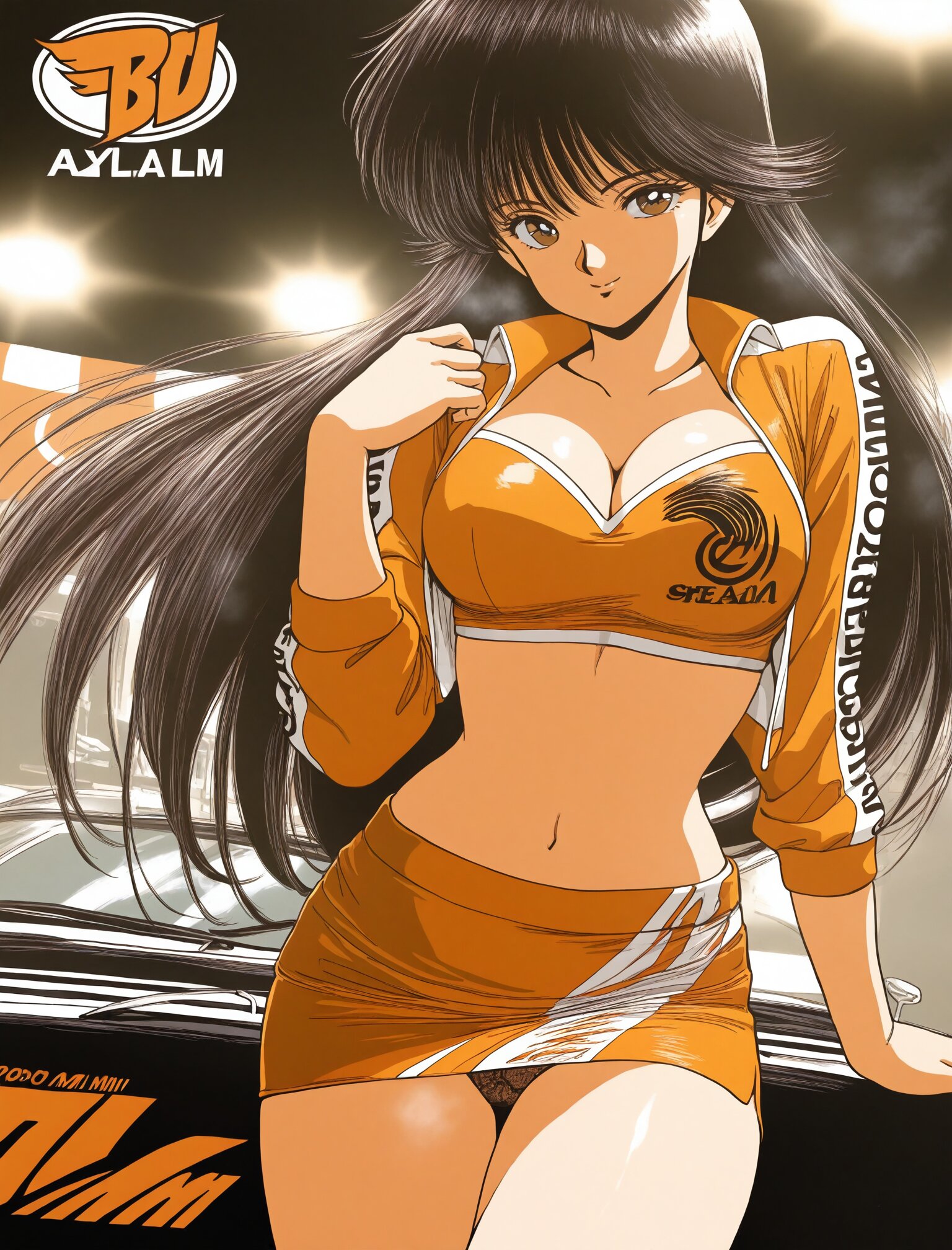 mdk_manga, (solo), brown eyes, (cowboy shot:1.5),long black hair, thick bangs, glossy hair,{1990s},(smile:1.3),(large breasts),(ayukawa madoka:1.3), skin tight suite:2.2),(upper body:1.5),(calm smile:1.2),(steam:1.5),(large breasts), (dynamic sexy pose:,(dynamic angle:1.4),(navel:1.5), (solo), (race queen,:1.3),(sexy, orange color scheme, separate outfit,) (orange crop top:1.4), (orange ultora mini skirt:1.8),(visible panties:1.5), (lace fabric:1.3), (sheer lace overlay:1.2), (large logo print:1.8), (bold typography:1.4), (sponsor logo:1.8), (centered chest logo:1.8), (high contrast logo:1.6), (clean print:1.3), high heels, long legs, slim waist, confident pose, seductive smile, looking at viewer, glossy skin, specular highlights, studio lighting, rim lighting, masterpiece, best quality, ultra-detailed, 8k resolution, very aesthetic, <lora:StS-Illustrious-Detail-Slider-v1.0:2.> <lora:sdxl-hairdetailer_02:2> <lora:mdk_manga_illus_1024:0.8>