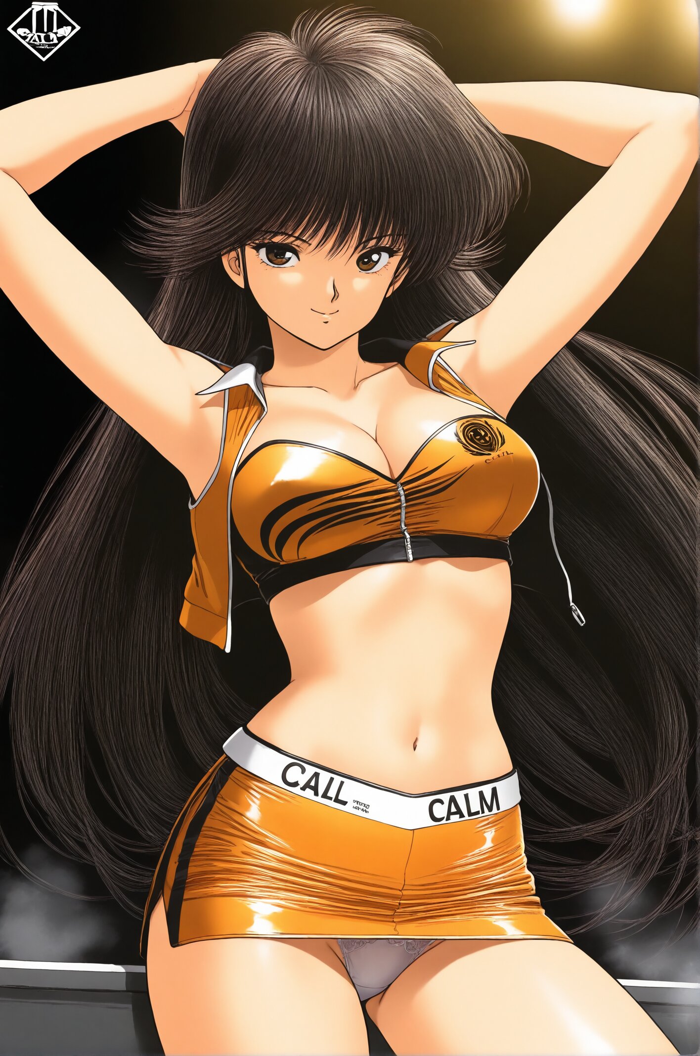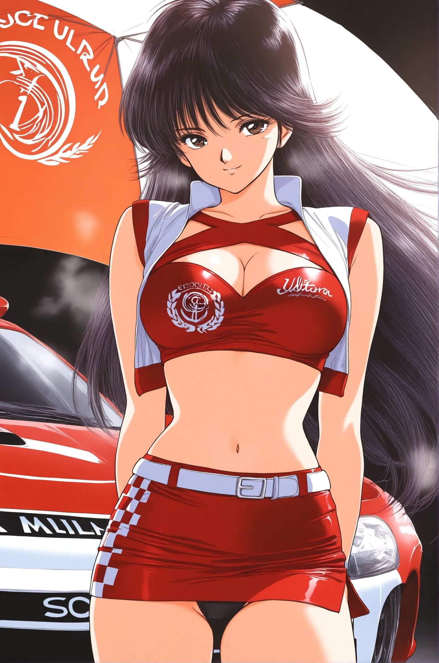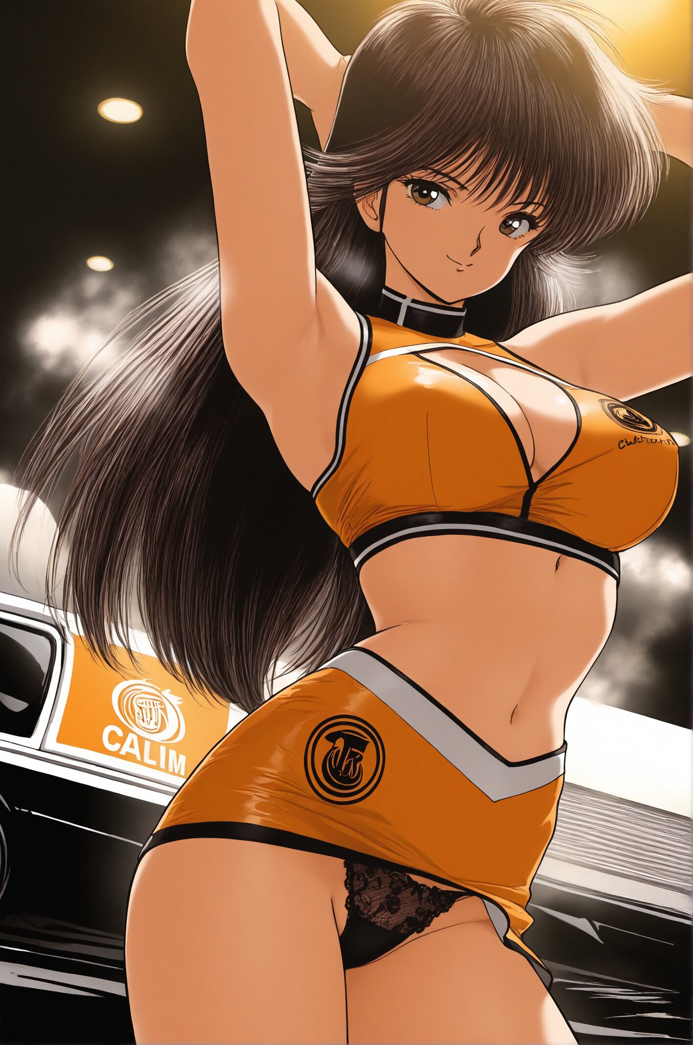 mdk_manga, (solo), brown eyes, (cowboy shot:1.5),long black hair, thick bangs, glossy hair,{1990s},(smile:1.3),(large breasts),(ayukawa madoka:1.3), skin tight suite:2.2),(upper body:1.5),(calm smile:1.2),(steam:1.5),(large breasts), (dynamic sexy pose:,(dynamic angle:1.4),(navel:1.5), (solo), (race queen,:1.3),(sexy, orange color scheme, separate outfit,) (orange crop top:1.4), (orange ultora mini skirt:1.8),(visible panties:1.5), (lace fabric:1.3), (sheer lace overlay:1.2), (large logo print:1.8), (bold typography:1.4), (sponsor logo:1.8), (centered chest logo:1.8), (high contrast logo:1.6), (clean print:1.3), high heels, long legs, slim waist, confident pose, seductive smile, looking at viewer, glossy skin, specular highlights, studio lighting, rim lighting, masterpiece, best quality, ultra-detailed, 8k resolution, very aesthetic, <lora:StS-Illustrious-Detail-Slider-v1.0:2.> <lora:sdxl-hairdetailer_02:2> <lora:mdk_manga_illus_1024:0.8>