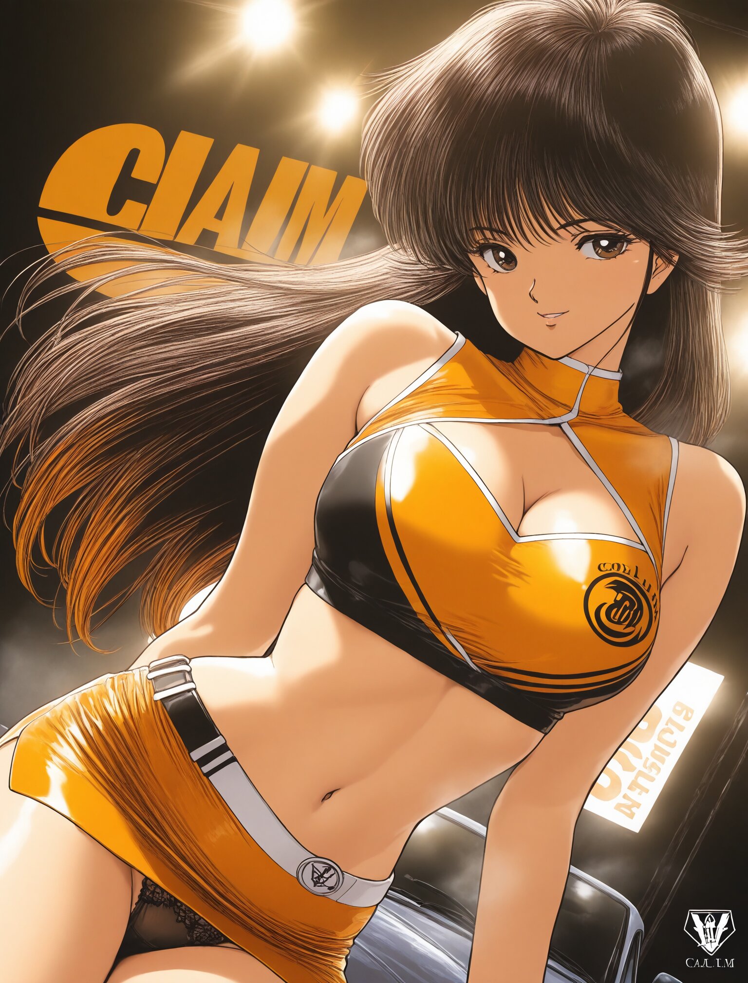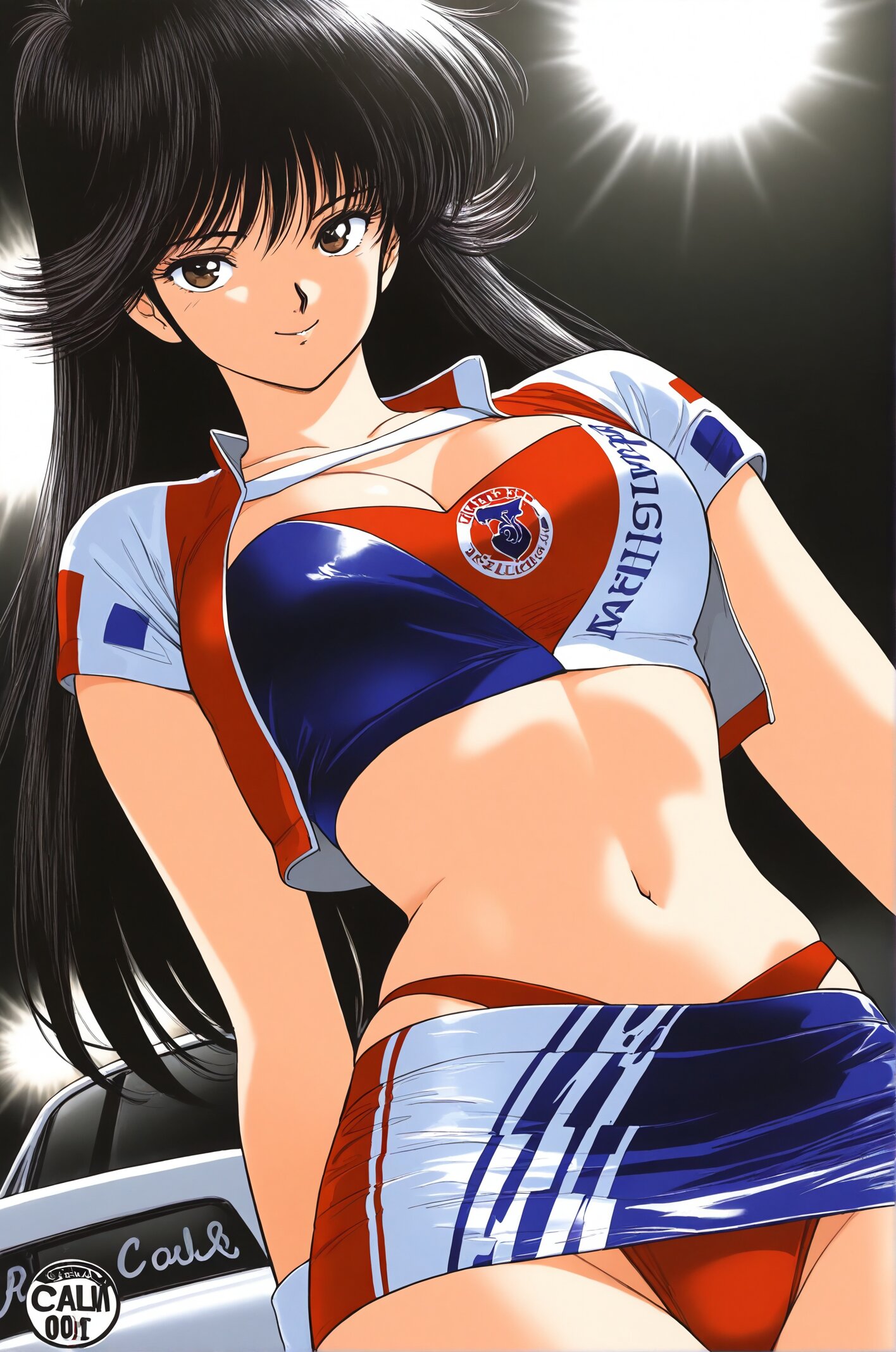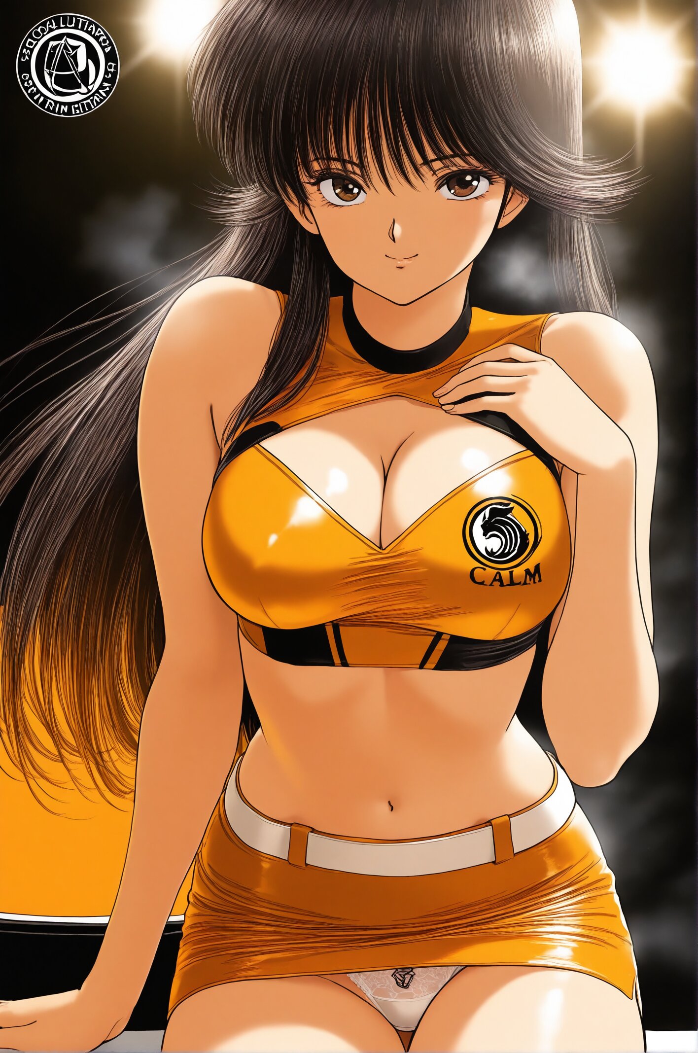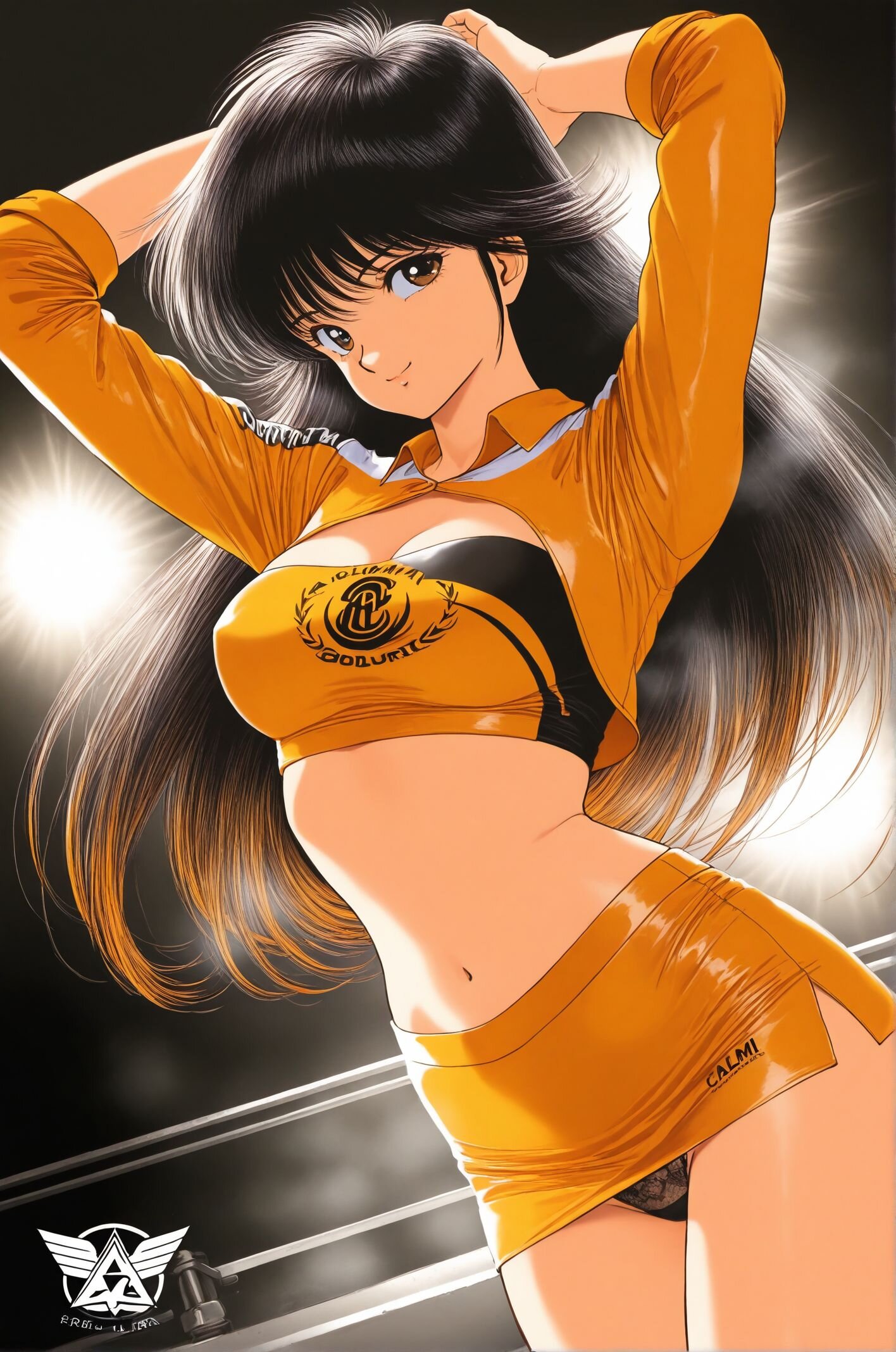 mdk_manga, (solo), brown eyes, (cowboy shot:1.5),long black hair, thick bangs, glossy hair,{1990s},(smile:1.3),(large breasts),(ayukawa madoka:1.3), skin tight suite:2.2),(upper body:1.5),(calm smile:1.2),(steam:1.5),(large breasts), (dynamic sexy pose:,(dynamic angle:1.4),(navel:1.5), (solo), (race queen,:1.3),(sexy, orange color scheme, separate outfit,) (orange crop top:1.4), (orange ultora mini skirt:1.8),(visible panties:1.5), (lace fabric:1.3), (sheer lace overlay:1.2), (large logo print:1.8), (bold typography:1.4), (sponsor logo:1.8), (centered chest logo:1.8), (high contrast logo:1.6), (clean print:1.3), high heels, long legs, slim waist, confident pose, seductive smile, looking at viewer, glossy skin, specular highlights, studio lighting, rim lighting, masterpiece, best quality, ultra-detailed, 8k resolution, very aesthetic, <lora:StS-Illustrious-Detail-Slider-v1.0:2.> <lora:sdxl-hairdetailer_02:2> <lora:mdk_manga_illus_1024:0.8>