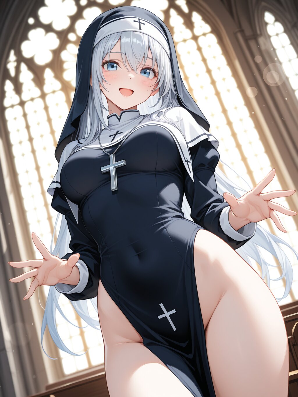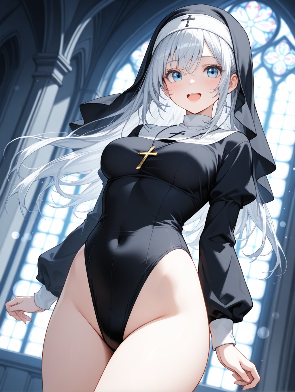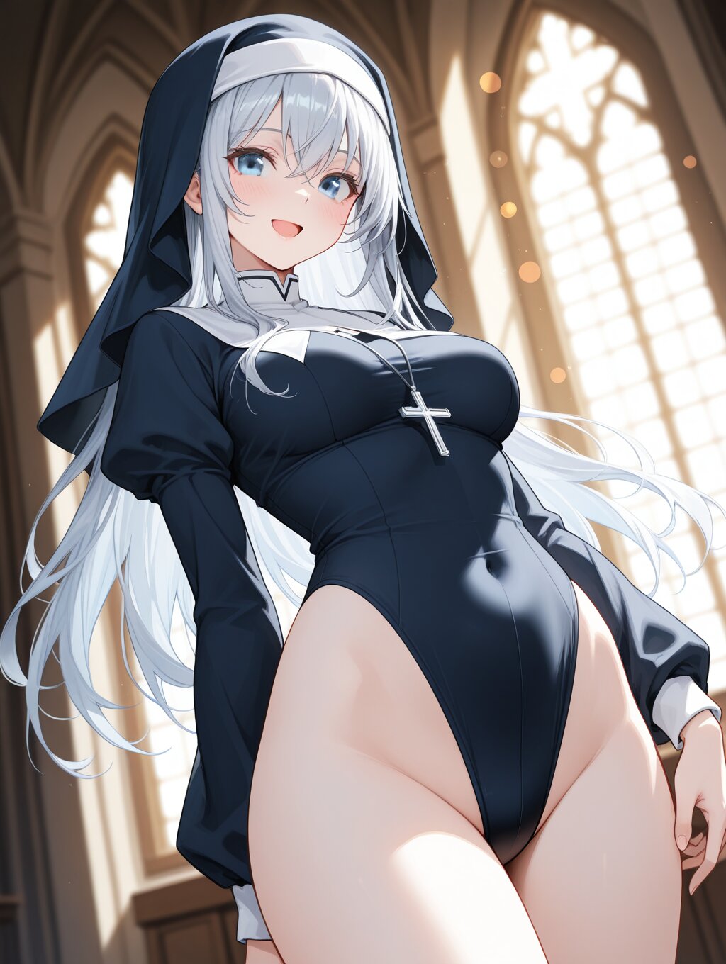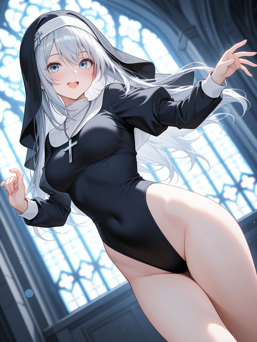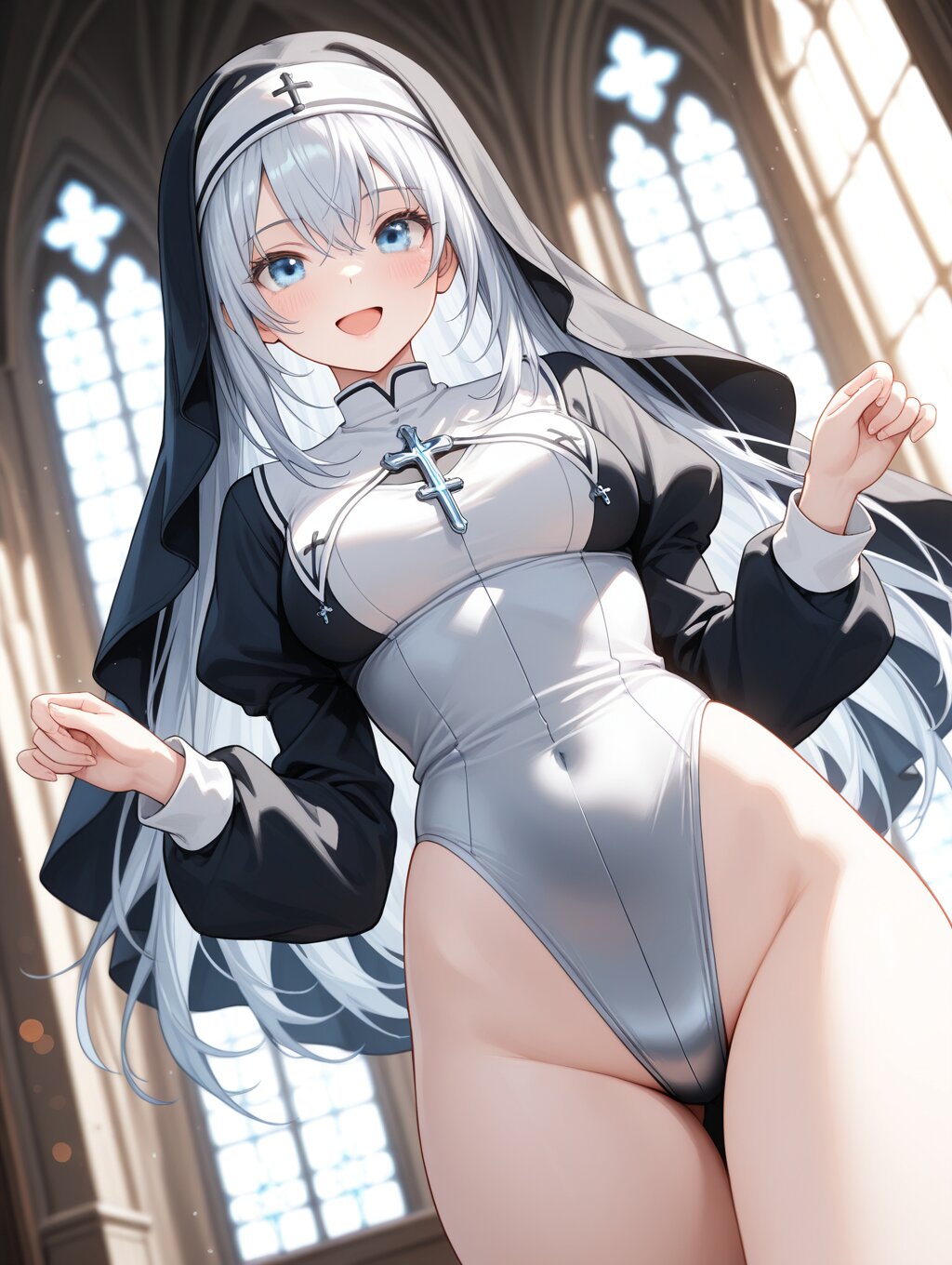 masterpiece,ultra detailed,detailed shading,detailed texture,(catchlight:1.3),highly detailed eyes,watery eyes,vivid,<lora:cveb6c5e878c739bt83g:0.4>, female,adult,full head, 1girl,blue eyes,blue silver long hair,medium breasts,(big breasts:0.8),:d, dynamic_angle,nun,high leg,groin,church,leotard,knee,gravure_pose,depth of field,bokeh,nun hat,hood,embarrassing pose,thin,(close-up:0.6),