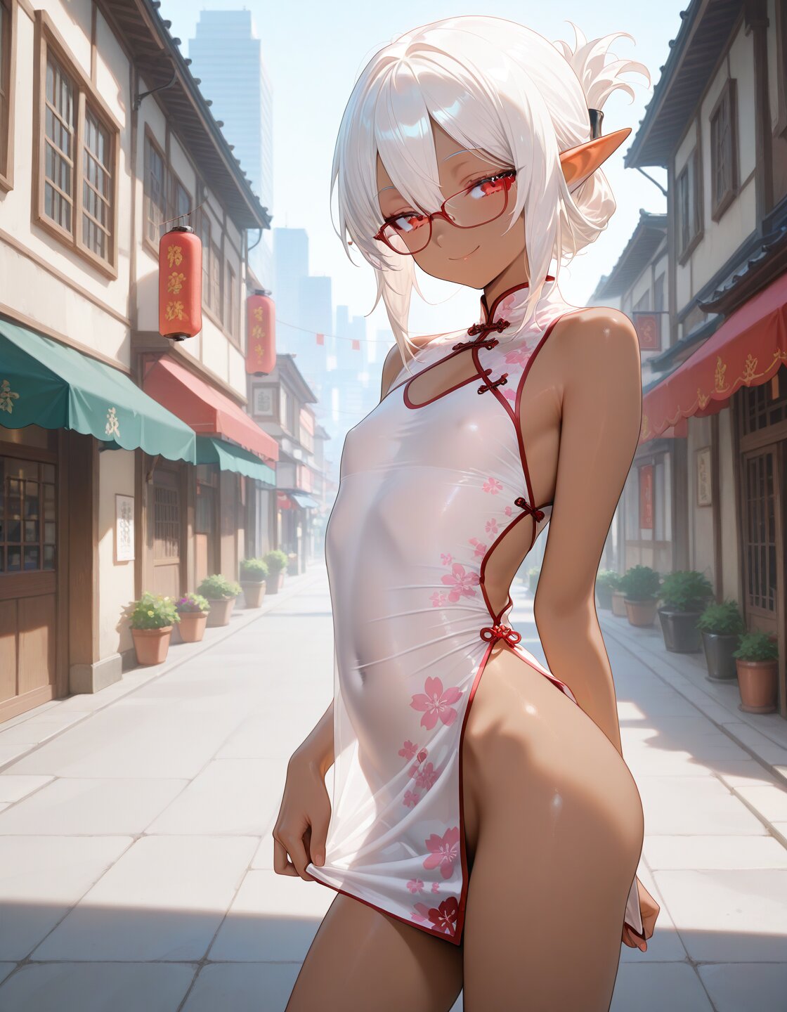 1girl, sensitive, china, (beautiful eyes, detailed eyes), looking at viewer, three quarter view, wide shot, solo, cute, cityscape, street, building, day, cowboy shot, (dark skin, red-framed eyewear:1.2), white hair, folded ponytail, medium hair, hair between eyes, flat chest, red eyes, elf, white china dress, cherry blossom print, no panties, side slit, sideless outfit, micro dress, hip bones, taut dress, sleeveless, see-through silhouette, standing, contrapposto, seductive smile, closed mouth, dress tug, covered nipples, masterpiece, best quality, amazing quality,