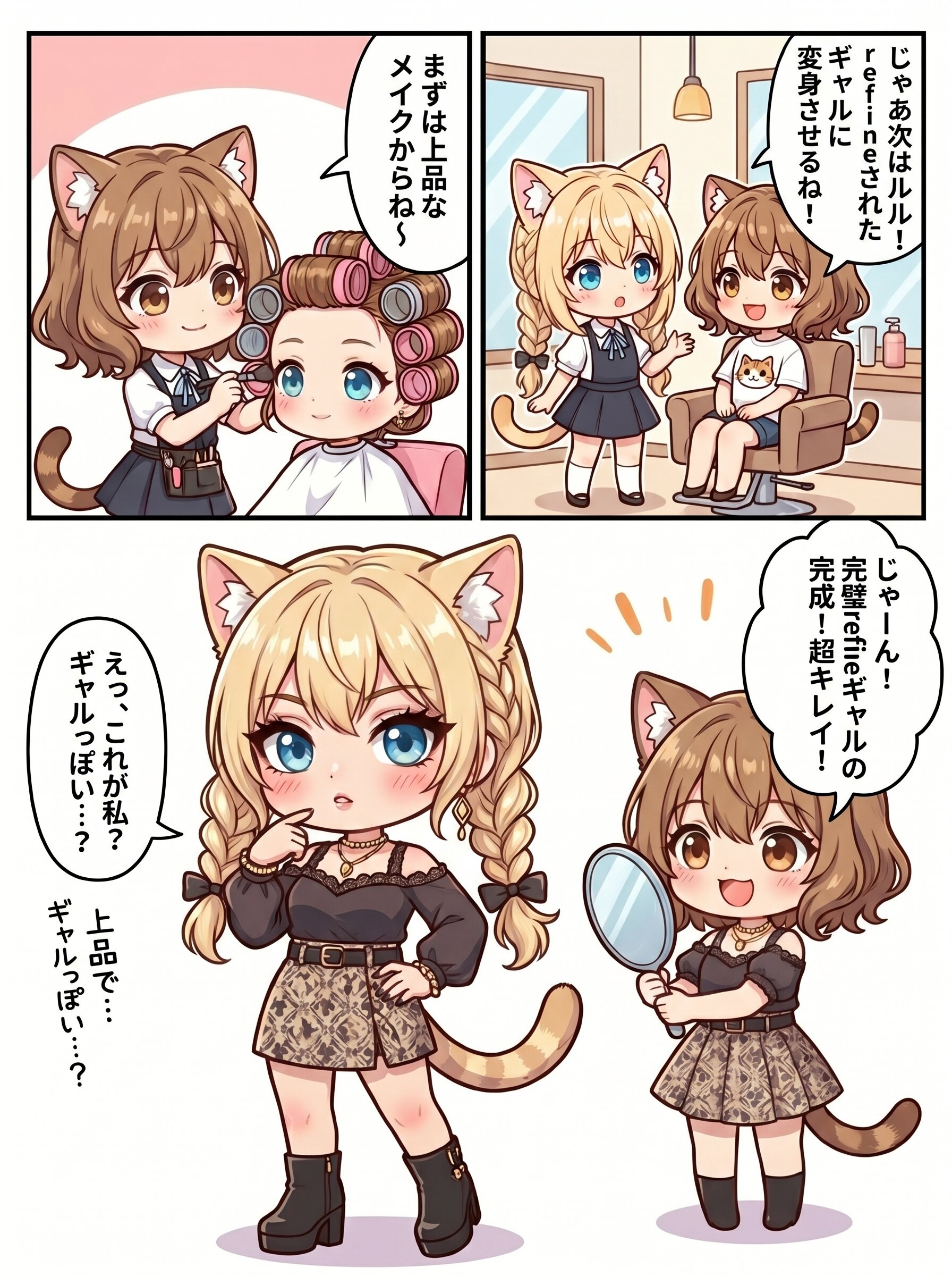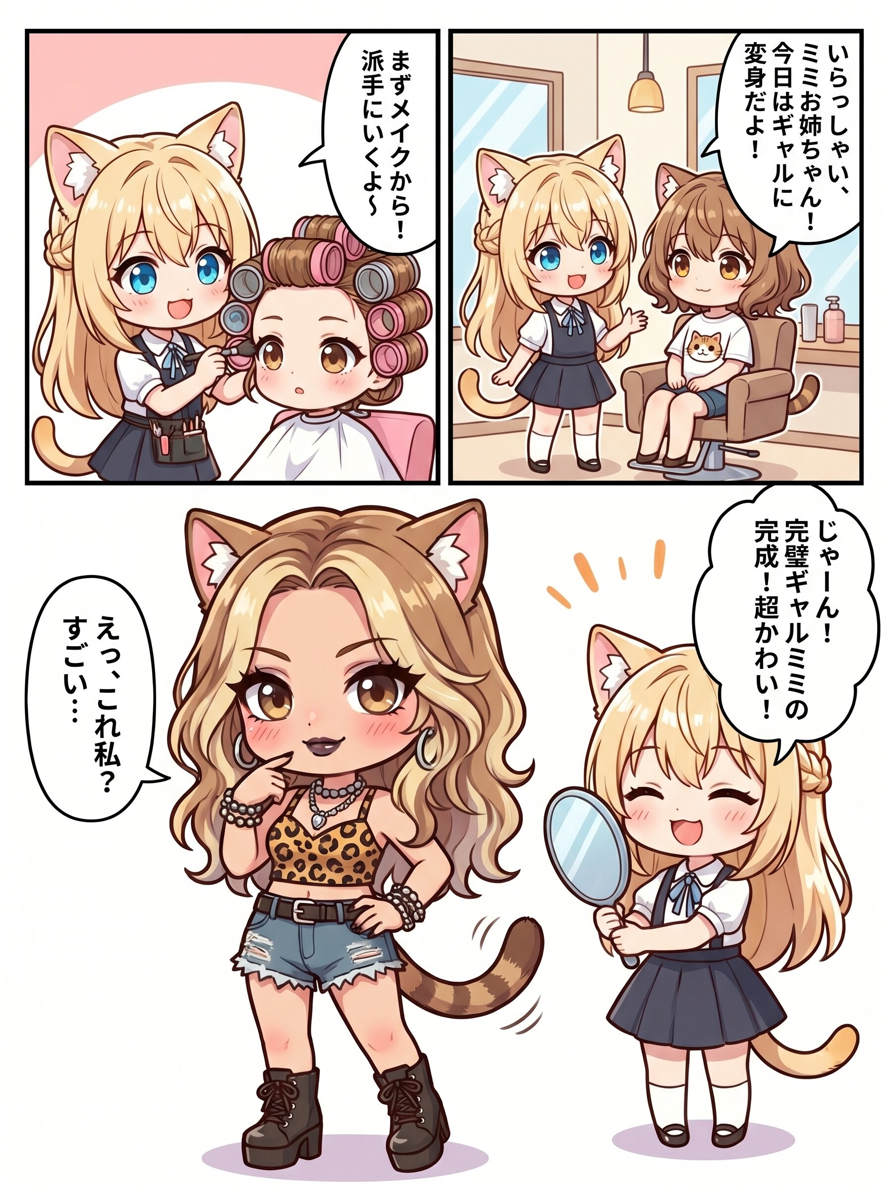 Use the uploaded image as the absolute visual reference for the character's face. Do not deviate from the original design. Based on the character designs in the uploaded image, depict two characters: Mimi and Ruru. Maintain the exact same character design for both. They are sisters. Mimi is the older sister, and Ruru is the younger sister. They have approximately the same height. Character details: Mimi: She has chestnut brown hair, wavy bob hair, hair between eyes, loose inward curls, brown eyes, and cat ears, natural cat tail. Her facial features must remain consistent with the reference. Ruru: She has blonde hair, long hair, braid, hair between eyes, blue eyes, and cat ears, natural cat tail. Her facial features must remain consistent with the reference. Match the art style, and line work of the uploaded image perfectly. ルルがミミをギャルにメイクアップするカラー漫画を作って。 ルルはスタイリスト衣装で店員になりきっている。 ミミはお客さん。 変身後のミミを大きく表示する。 japanese manga page, multiple panels, manga layout, right-to-left reading order, top-right panel first, then left, then next row right to left, clear panel borders, dynamic composition, speech bubbles with japanese text, natural japanese dialogue placement, speech bubbles placed in correct reading order (right to left, top to bottom), panel flow guides eye movement naturally from right to left, no western comic layout,