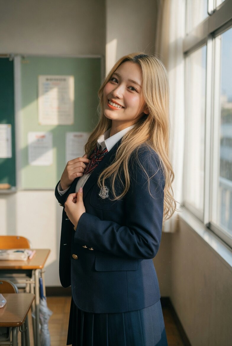 日本人女性20歳のリアルなフォト。カメラマンが撮影したような仕上がり。blonde hair, long hair, brown eyes,高校のブレザーの制服を着ている。ポーズをとっている。側面からの構図。室内の自然光。視線は撮影者に向けていて笑顔。