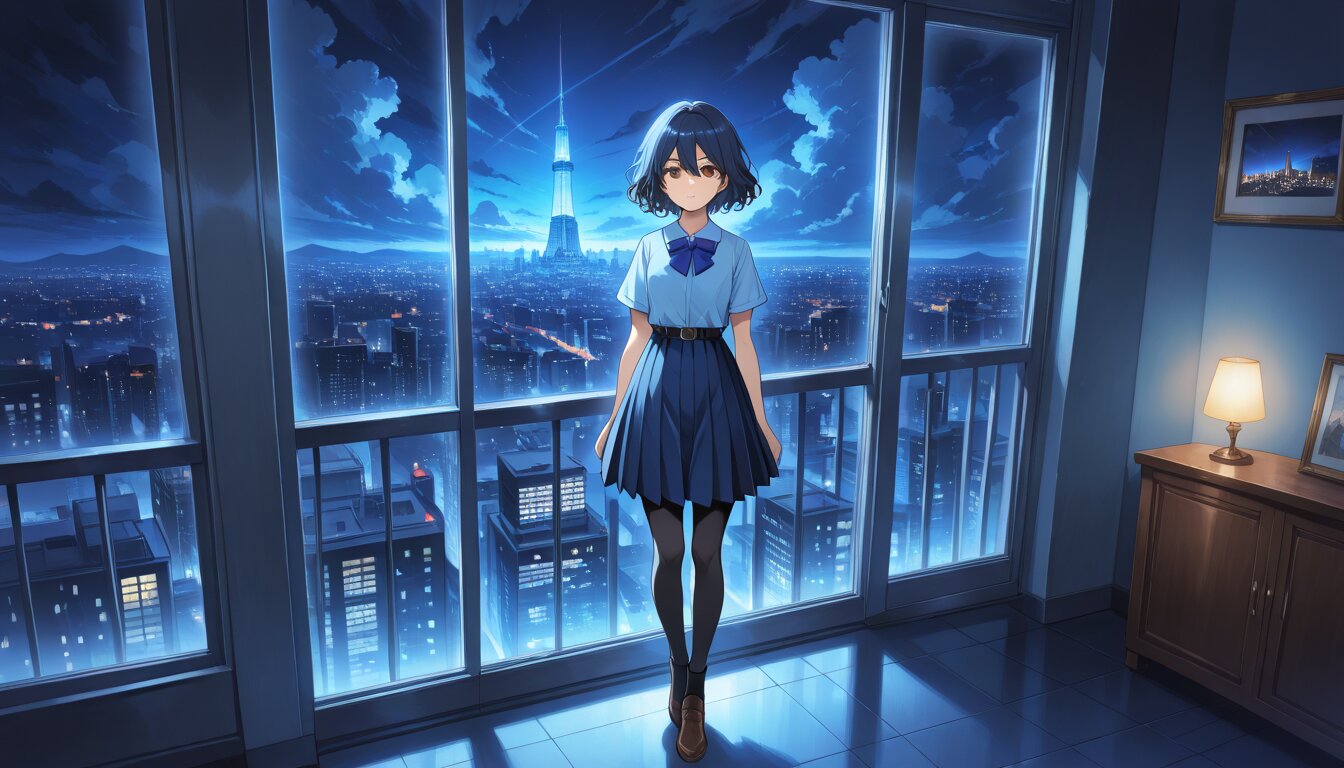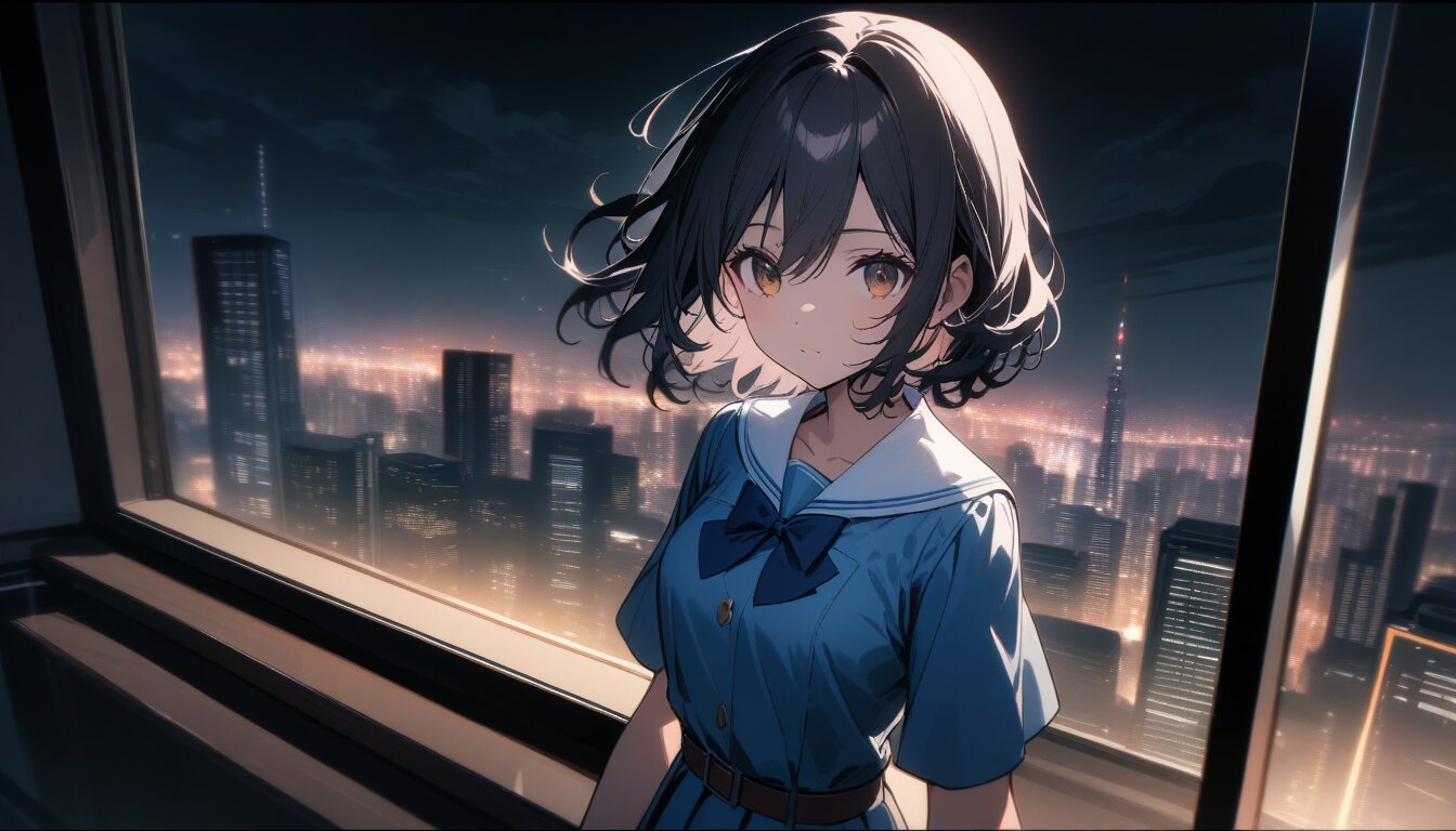 best quality,absurdres,8k,ultra detailed,very aesthetic,1girl,(rating: general:1.2), a girl with short hair looks out a window at night city on the other side of the window, 1girl, solo, black hair, wavy hair, short hair, brown eyes, hair between eyes, pleated dress, blue dress, blue bowtie, belt, short sleeves, black pantyhose, black socks, brown footwear, window, night, cityscape, An anime-style female character with short dark blue hair, wearing a light blue school uniform with a dark blue bow, standing by a window overlooking a cityscape at night with illuminated skyscrapers and a cloudy sky, soft lighting, highly detailed, vibrant colors, 4k resolution, game-like character design,