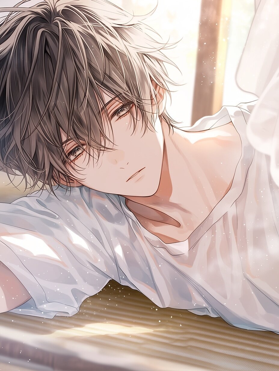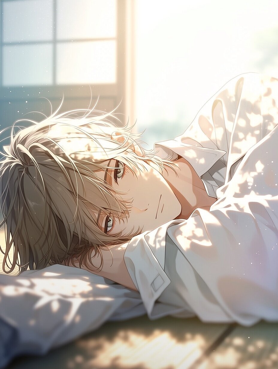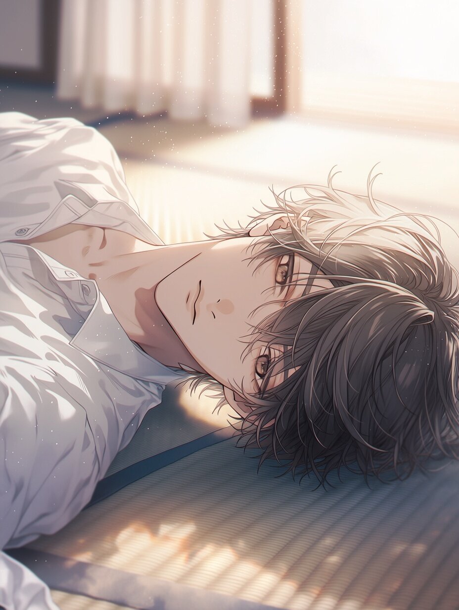 (beautiful young Japanese man:1.2), cinematic lighting, soft glow, detailed eyes, light particles, wind effect, high quality, anime style, a breathtakingly beautiful young Japanese man, relaxing in a sunlit room, lying on tatami floor, soft natural light, warm atmosphere, gentle expression, loose white shirt, slightly open collar, calm eyes, soft breeze moving curtains, dust particles floating in light, peaceful mood, cinematic lighting, shallow depth of field