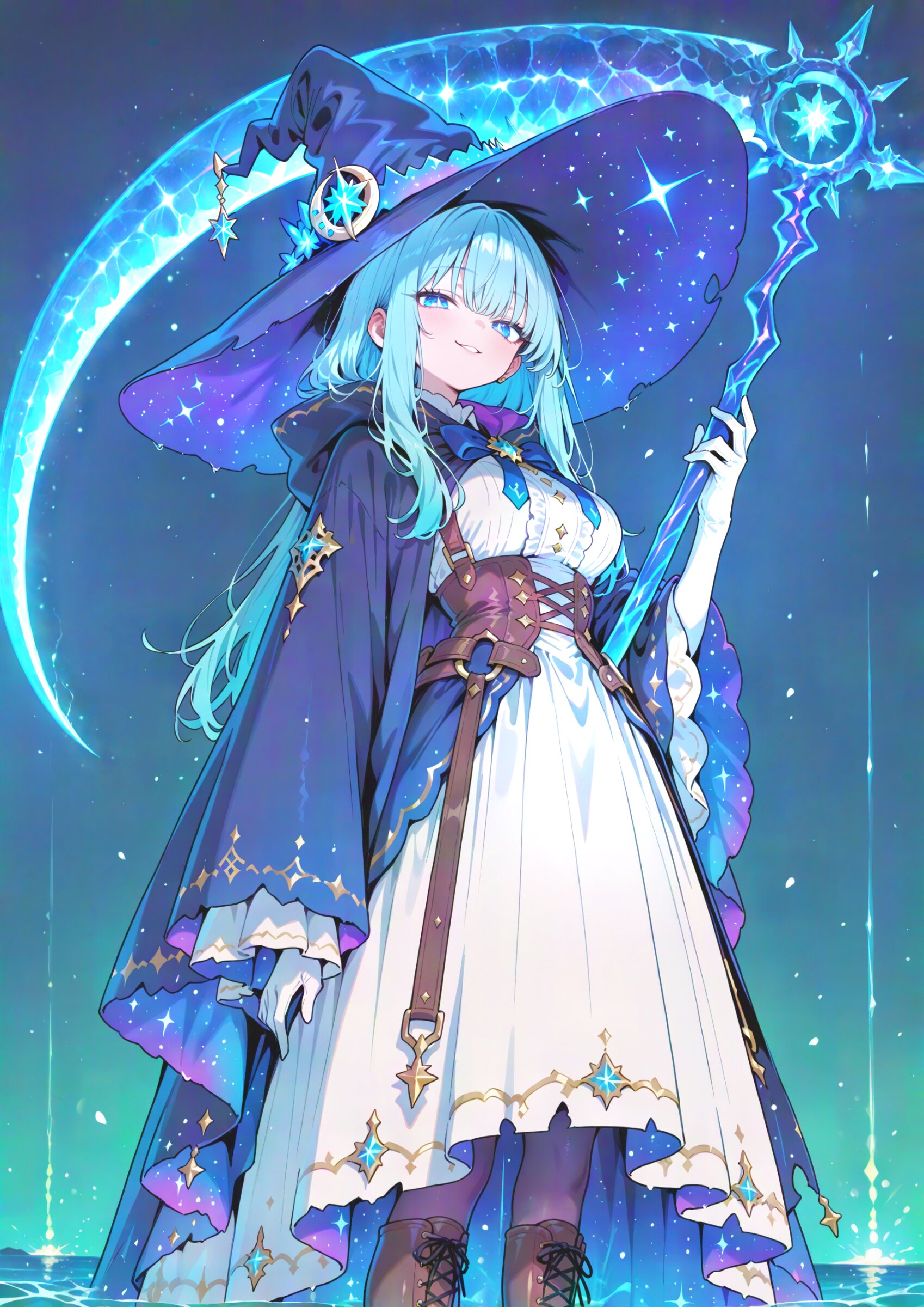 upper body, feet out of frame from below, looking down looking at viewer, 1girl, witch girl, blue eyes, beautiful iridescence eyes, beautiful detailed eyes, beautiful light blue hair, long bangs, long disheveled beautiful hair, first-rate female bodies, perfect body, beautiful breasts, framed breasts, cool face, (Beautiful Lips:0.7),, long hair, (stylish beautiful witch dress:1.2), white elbow gloves, (cute dark blue and white witch girl costume:0.9), (white blouse:1.3), bow tie, witch long skirt (overskirt:1.1) black cloak, (blue galaxy witch hat:1.1), lace-up boots on feet, stockings and suspenders, under white hooded coat, blue scarf, glove, enpera, mysterious face, seductive smile,smirk cast a magic, ice magic, floating huge scythe, caustics, analogous colors lime green theme, spring atmosphere, spring \(season\), , masterpiece, best quality, amazing quality, very aesthetic, absurdres, newest, professional art lots of details, , overexposure, shiny-glistening, (watercolor style:0.0), (pastel color style:1.0) 4ur4_illu,shiny, glowing, glowing particles, glowing light particles, light particles, <lora:noline (1):1.0> <lora:sdxl2-flat2-512b:0.15> <lora:facelightup_xl_v10:0.5> <lora:V2_yakumo_alchemy:0.5> <lora:Aura_illu:0.1>