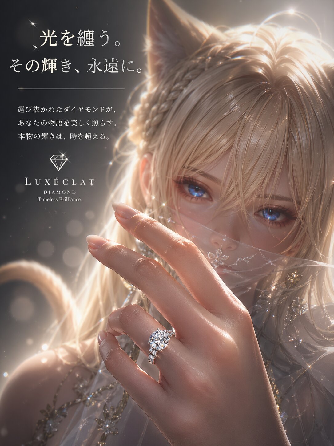 1girl, anime style face, highly detailed eyes, blue eyes, long blonde hair, braid, hair between eyes, natural small cat ears, natural cat tail, focus on hand, elegant slender fingers, diamond ring, close-up on hand, jewelry advertisement style, luxury, high-end, hand in foreground sharply in focus, realistic hand texture, detailed nails, smooth skin, diamond ring extremely detailed, realistic light reflections, physically accurate refraction, dispersion, caustics, tiny rainbow highlights, gemstone realism, face in background slightly blurred, shallow depth of field, soft focus, looking at her own hand, calm expression, veil covering mouth, semi-transparent fabric, delicate embroidery, subtle sparkle, soft lighting, studio lighting, soft glow, rim light on hair and ears, cinematic lighting, bokeh background, light particles, clean background, minimalistic, premium atmosphere, ultra detailed, best quality, masterpiece, illustration, anime + semi-realistic rendering